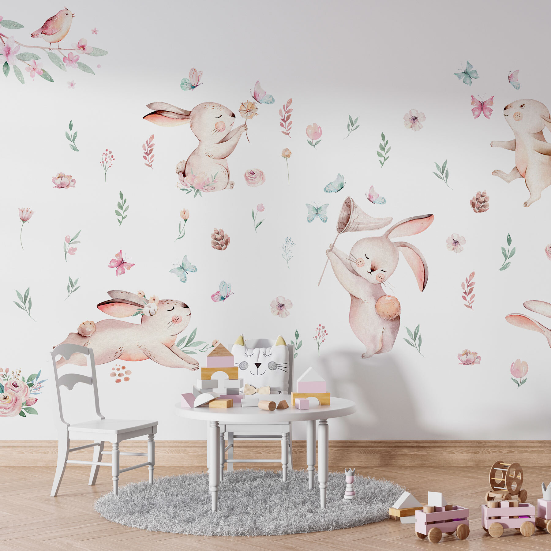Verwandeln Sie Ihren Raum mit dieser entzückenden Fototapete, die eine entzückende Gruppe von Kaninchen zeigt, die zwischen Blumen und Schmetterlingen herumtollen. Stellen Sie sich vor, Sie betreten einen Raum, in dem diese fröhlichen Tiere direkt von der Wand zu tanzen scheinen, jedes mit einem verspielten Charme, dem man nur schwer widerstehen kann. Die sanften Farben und das skurrile Design sorgen für einen unbeschwerten Touch und eignen sich perfekt für ein gemütliches Kinderzimmer oder ein fröhliches Spielzimmer. Es ist wie eine sanfte Umarmung der Natur, die Wärme und Freude in die Atmosphäre einlädt. Und wer könnte zu einem kleinen Hasenstreich nein sagen, während Sie Ihren Morgenkaffee schlürfen? Er regt garantiert zu Gesprächen an und sorgt für ein Lächeln – perfekt für alle, die ein einzigartiges Dekorationsstück suchen, das freundlich und lustig wirkt.