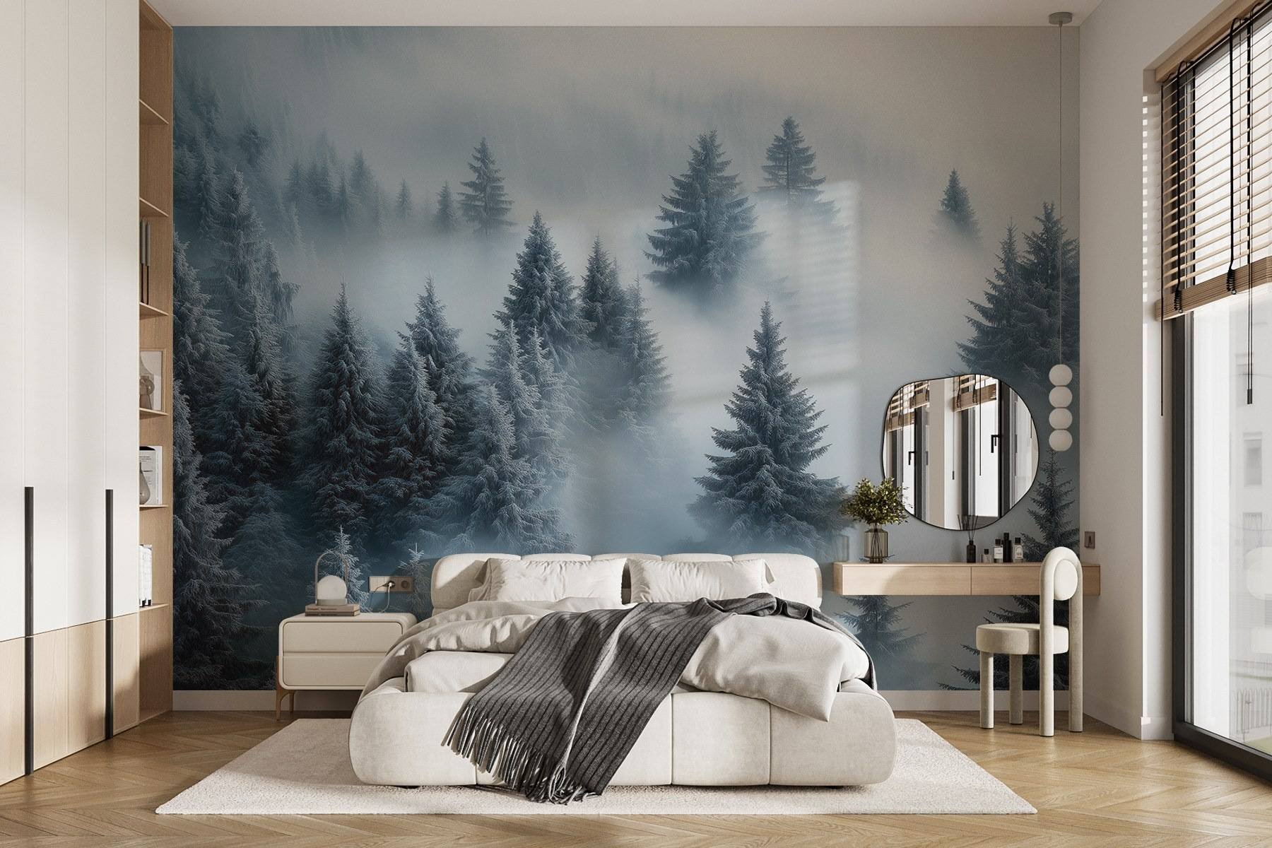 Verwandeln Sie Ihren Raum in ein Winterwunderland mit dieser atemberaubenden Fototapete, die eine verträumte Gruppe verschneiter Bäume zeigt. Es ist, als würde man in einen ruhigen Wald eintreten, in dem sich jeder Blick wie eine kuschelige Umarmung der Natur anfühlt. Stellen Sie sich vor, Sie nippen an Ihrem Lieblingsheißgetränk, eingewickelt in eine Decke, und betrachten die weichen, schneebedeckten Äste, die sich immer leicht wiegen. Dieses Wandbild eignet sich perfekt für ein Wohnzimmer oder ein ruhiges Schlafzimmer. Es lädt zu Ruhe und Frieden ein und entführt jeden, der es betritt, mühelos in ein flüsterndes Waldgebiet. Wer würde sich nicht gerne ein Stück dieser Magie ins Haus holen?