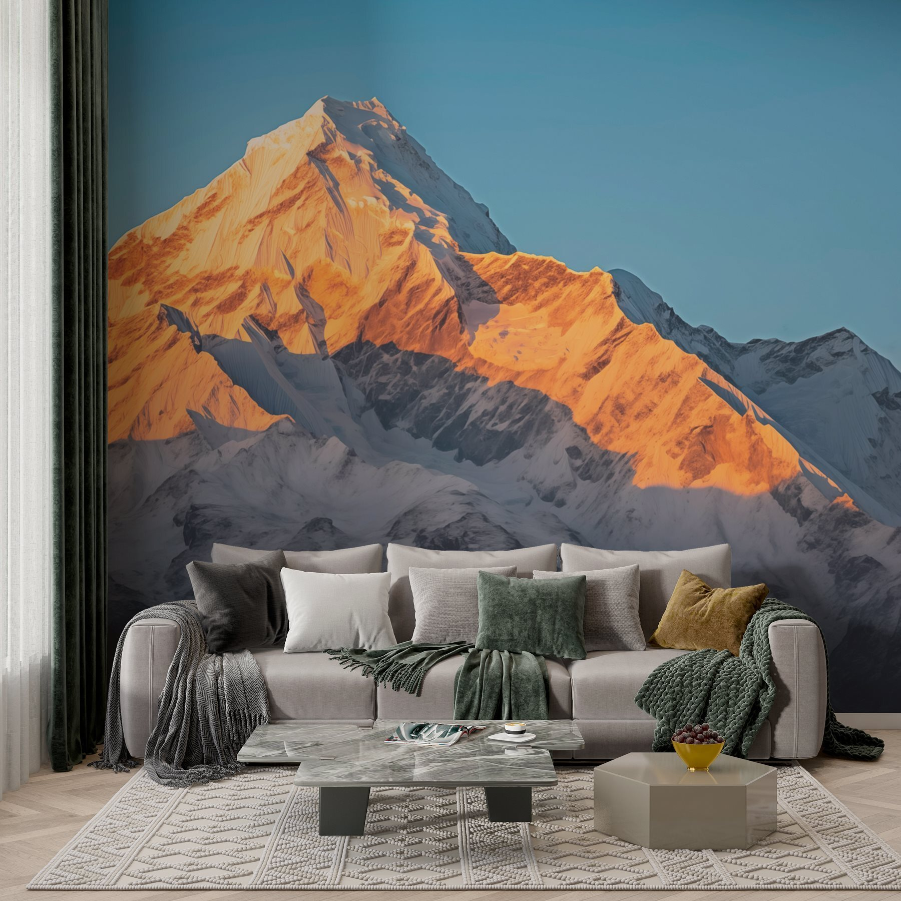 Stellen Sie sich vor, Sie wachen mit einer atemberaubenden Gebirgsszene auf, die buchstäblich in den Himmel ragt – und das direkt in Ihrem eigenen Wohnzimmer! Diese Fototapete bringt ein Stück Natur nach drinnen, mit einem atemberaubenden schneebedeckten Gipfel, der Geschichten von Abenteuer und Ruhe zu flüstern scheint. Es ist wie ein Fenster zur Wildnis, das die erfrischende Brise der Berge durch Ihren Raum wehen lässt. Stellen Sie sich einen gemütlichen Abend vor, bei dem Sie an einem Tee nippen, während Sie sich in den majestätischen Weiß- und Blautönen verlieren. Dieses Stück ist mehr als nur Dekoration; es ist eine Stimmung, eine Erinnerung und eine sanfte Erinnerung daran, dass Schönheit in jeder Ecke unserer Welt gedeiht. Perfekt, um Tagträume zu wecken oder Geschichten mit Freunden zu teilen. Wer wünscht sich nicht eine tägliche Flucht in die Berge?
