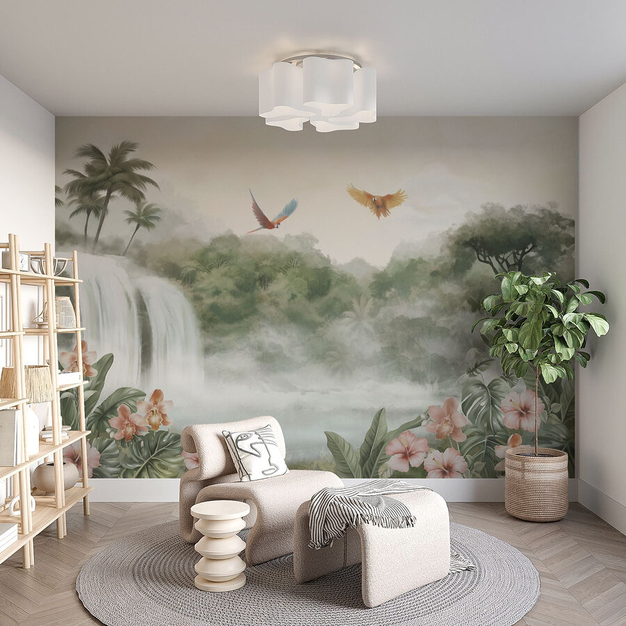 Verwandeln Sie jeden Raum in ein ruhiges, tropisches Paradies mit dieser atemberaubenden Fototapete mit einem Wasserfall, auf dem lebhafte Vögel über üppigem Grün schweben. Stellen Sie sich vor, dass Sie jeden Tag eine friedliche Oase betreten, während das sanfte Geräusch des herabstürzenden Wassers Ihren Geist erfüllt. Die zarten rosafarbenen Blumen, die durch das Blattwerk hindurchschimmern, sorgen für einen Farbtupfer, der perfekt geeignet ist, um eine gemütliche Ecke zu verschönern oder ein auffälliges Statement an einer Wand abzugeben. Es ist, als ob man sich ein Stück Natur ins Haus holt – keine Wanderschuhe erforderlich! Dieses Wandbild ist ideal für Naturliebhaber und lädt dazu ein, innezuhalten, durchzuatmen und ein kleines Stückchen Ruhe zu Hause zu genießen. Und vielleicht weckt es sogar Tagträume von tropischen Ferien, selbst wenn es draußen kühl ist. Genießen Sie die Schönheit und lassen Sie Ihre Wände eine Geschichte erzählen!