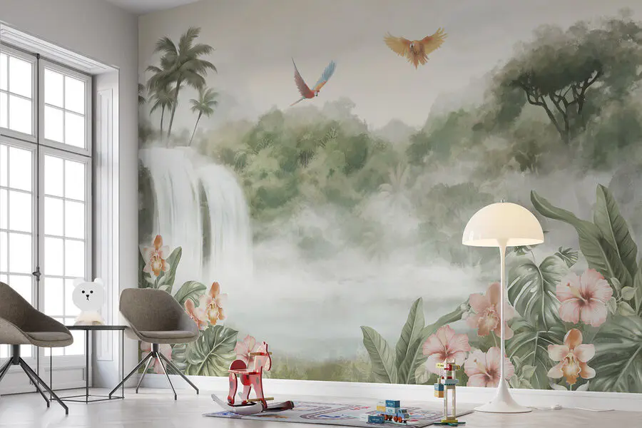 Verwandeln Sie jeden Raum in ein ruhiges, tropisches Paradies mit dieser atemberaubenden Fototapete mit einem Wasserfall, auf dem lebhafte Vögel über üppigem Grün schweben. Stellen Sie sich vor, dass Sie jeden Tag eine friedliche Oase betreten, während das sanfte Geräusch des herabstürzenden Wassers Ihren Geist erfüllt. Die zarten rosafarbenen Blumen, die durch das Blattwerk hindurchschimmern, sorgen für einen Farbtupfer, der perfekt geeignet ist, um eine gemütliche Ecke zu verschönern oder ein auffälliges Statement an einer Wand abzugeben. Es ist, als ob man sich ein Stück Natur ins Haus holt – keine Wanderschuhe erforderlich! Dieses Wandbild ist ideal für Naturliebhaber und lädt dazu ein, innezuhalten, durchzuatmen und ein kleines Stückchen Ruhe zu Hause zu genießen. Und vielleicht weckt es sogar Tagträume von tropischen Ferien, selbst wenn es draußen kühl ist. Genießen Sie die Schönheit und lassen Sie Ihre Wände eine Geschichte erzählen!