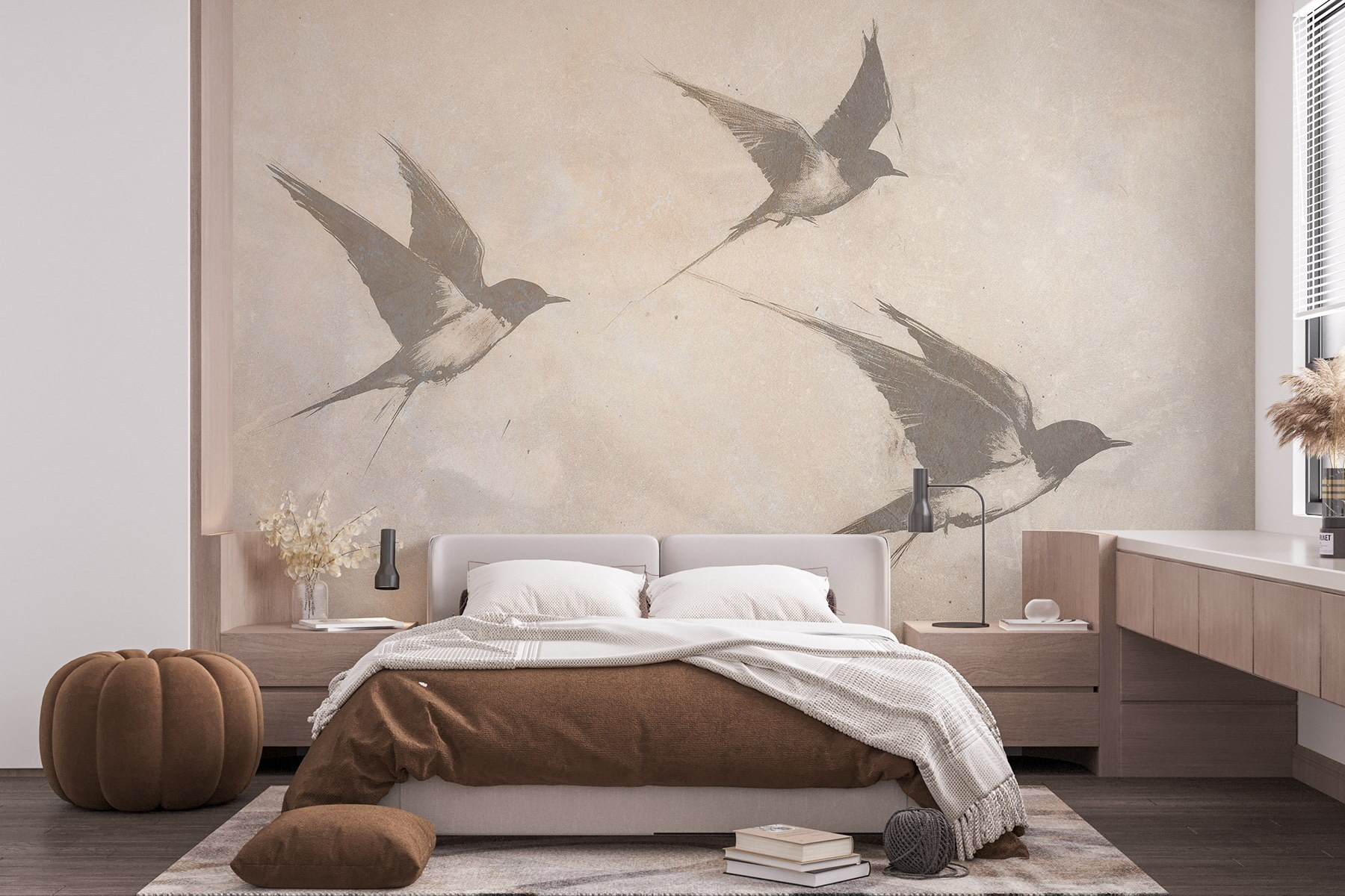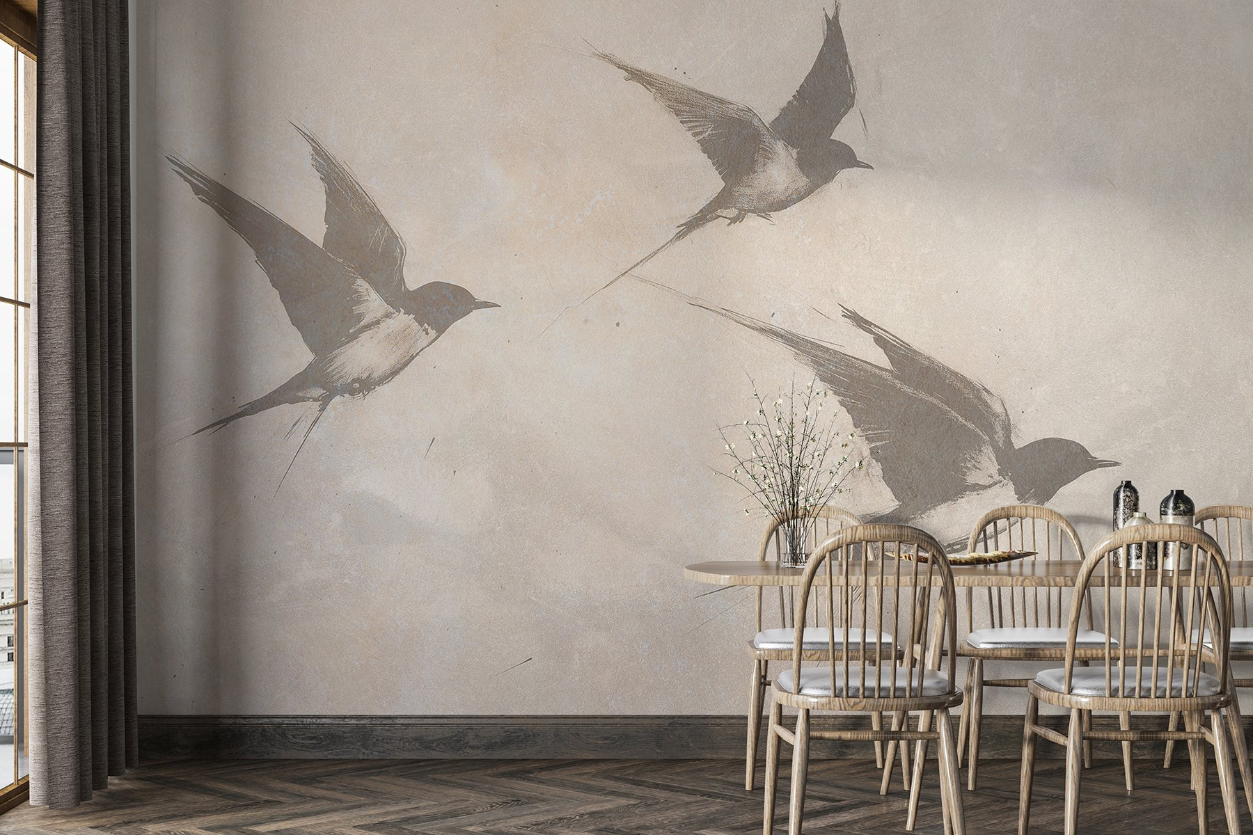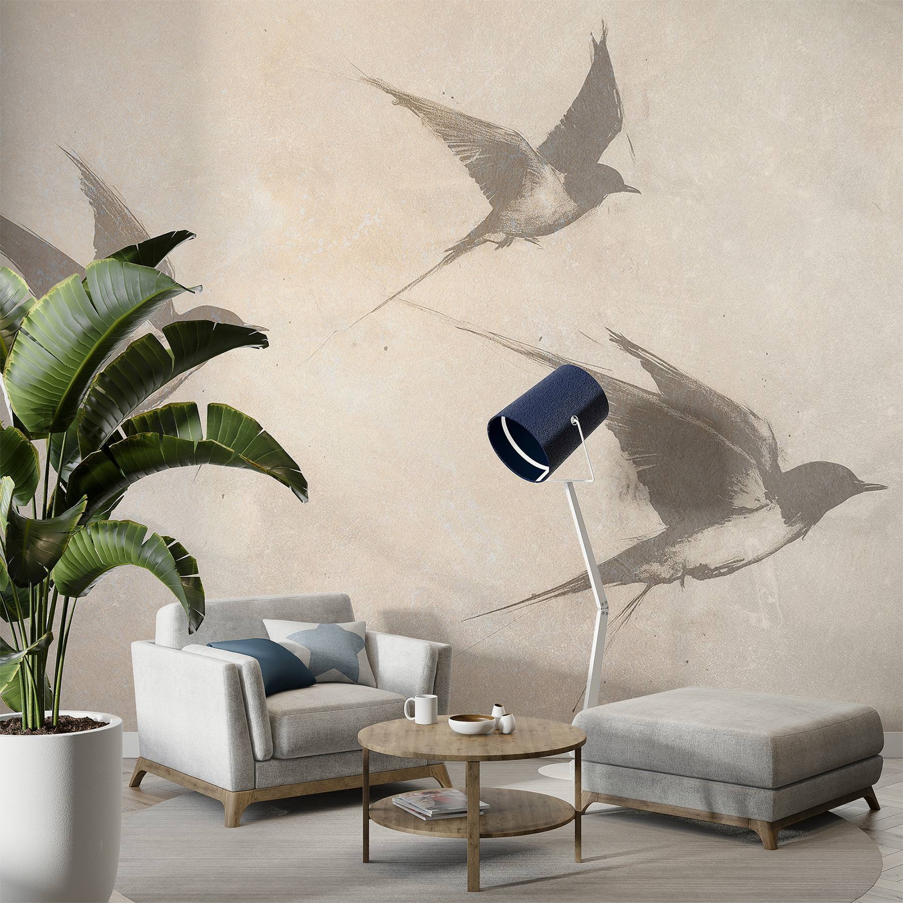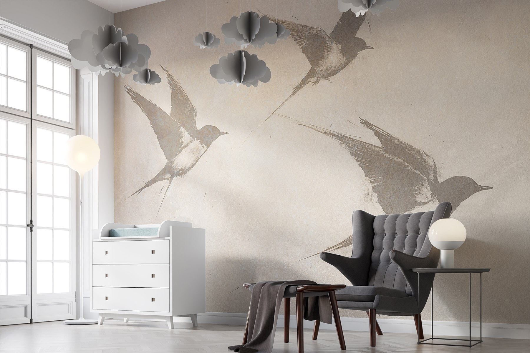 Verwandeln Sie jeden Raum in einen ruhigen Zufluchtsort mit dieser atemberaubenden Fototapete mit Vögeln, die durch die Lüfte segeln. Die sanften Farben und zarten Linien schaffen eine beruhigende Atmosphäre, die perfekt für ein Wohnzimmer oder eine gemütliche Leseecke ist. Stellen Sie sich vor, Sie machen es sich mit einem guten Buch gemütlich und lassen sich vom sanften Geflüster der imaginären Flügel leiten. Es ist, als hätte man ein Stück Natur direkt an der Wand, das Ruhe und ein Gefühl von Freiheit vermittelt. Ob es nun Tagträume von fernen Orten anregt oder einfach nur ein Lächeln auf Ihr Gesicht zaubert, dieses Wandbild ist eine wunderbare Ergänzung. Wer hätte nicht gerne ein paar gefiederte Freunde, die den ganzen Tag mit ihm zusammen sind?