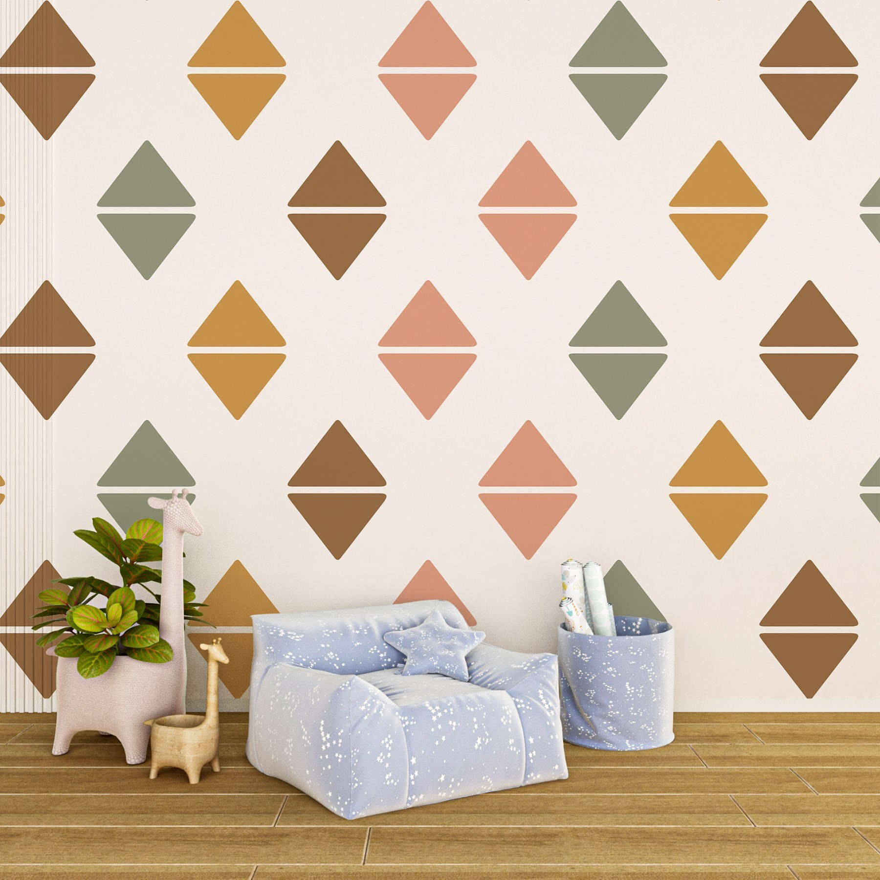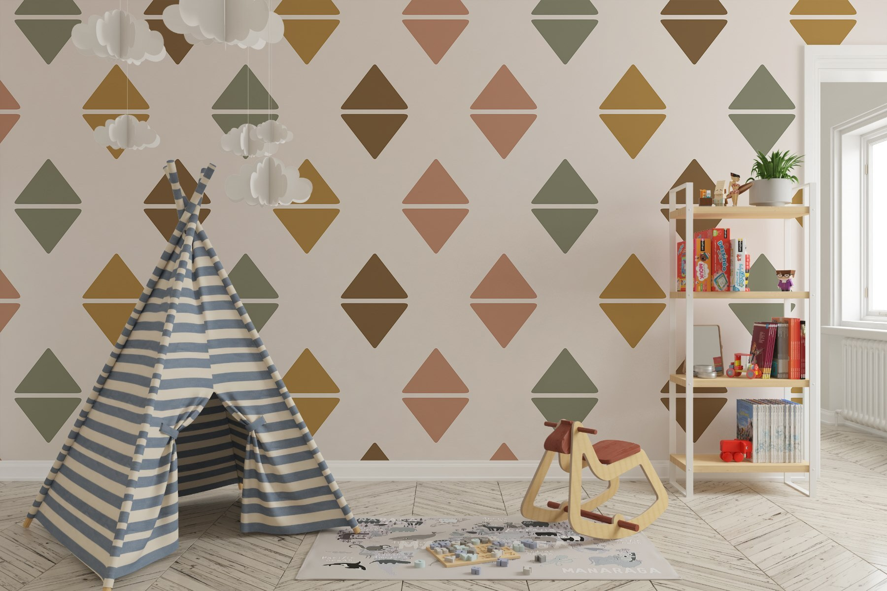 Treten Sie ein in eine Welt, in der Wände Geschichten erzählen, und diese Fototapete ist die Hauptfigur. Mit seinem verspielten Muster aus bunten Rauten strahlt es eine warme, einladende Atmosphäre aus, die nur darum bettelt, beachtet zu werden. Stellen Sie sich vor, Sie trinken einen Kaffee in einem sonnenbeschienenen Raum, und die sanften Farbtöne machen die Ecken weicher und lassen alles ein wenig gemütlicher erscheinen. Vielleicht verweilen die Gäste sogar ein wenig länger, angezogen von diesen reizvollen Formen – wer würde nicht gerne über dieses auffällige Design plaudern? Es ist wie eine angenehme Überraschung, die eine schlichte Wand in eine fröhliche Kulisse für die täglichen Momente des Lebens verwandelt. Perfekt für Wohnzimmer, Kinderzimmer oder den Flur, der ein wenig Magie braucht.