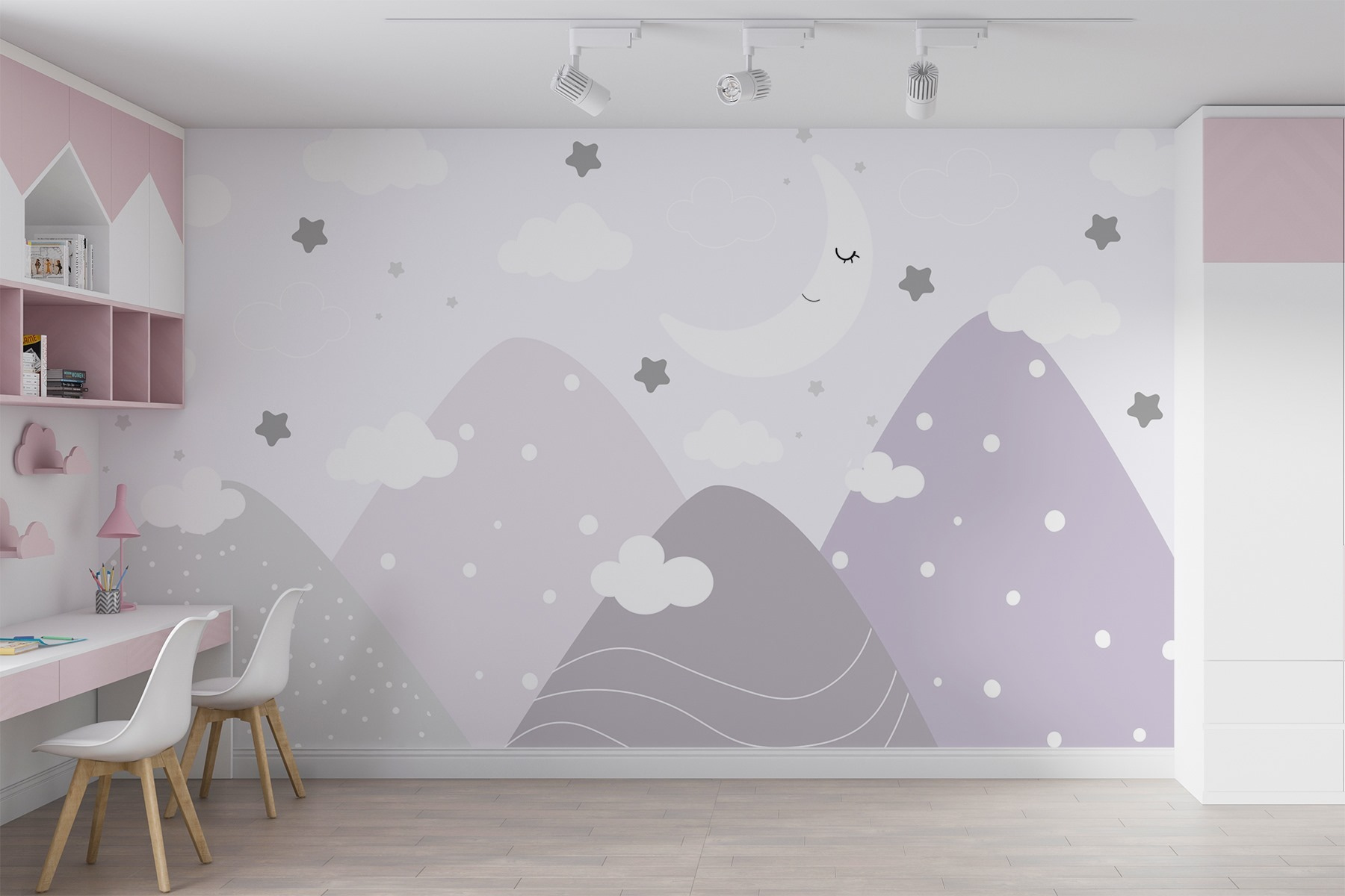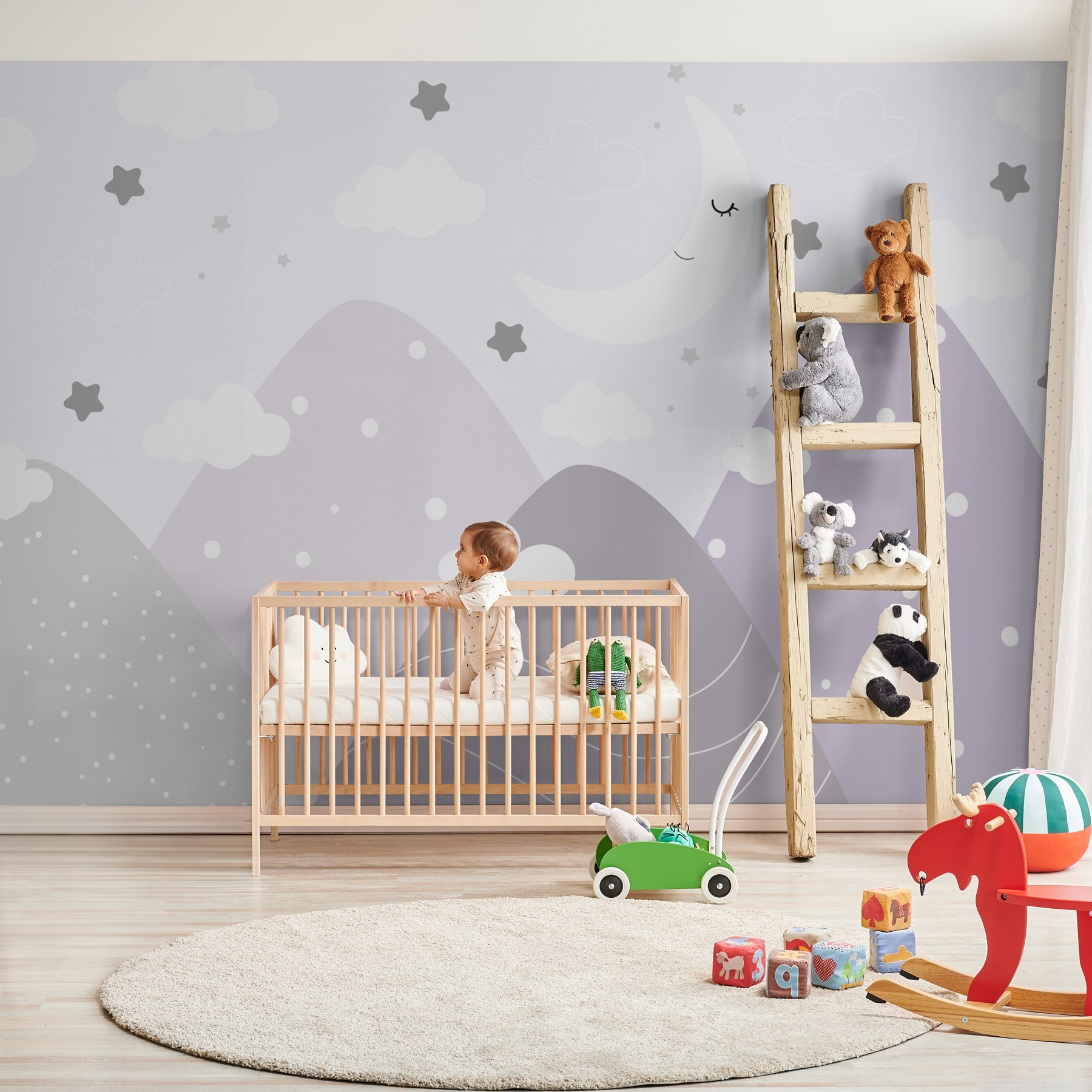 Verwandeln Sie jeden Raum mit diesem verträumten Wandbild, das einen Mond und Wolken am Himmel zeigt. Perfekt für die Kleinsten, schafft es eine skurrile Atmosphäre, die gemütlich und doch verspielt ist. Stellen Sie sich ein Kinderzimmer vor, in dem die Schlafenszeit zu einem Abenteuer wird, umgeben von sanften Bergen und glitzernden Sternen. Die sanften Farben beruhigen und regen gleichzeitig die Fantasie an – perfekt für Tagträumer und Sternengucker gleichermaßen. Ob zur Märchenstunde oder zum Mittagsschlaf, dieses Wandbild hüllt den Raum in eine ruhige Atmosphäre, die jeden Moment gemütlich und besonders macht. Wundern Sie sich nicht, wenn sich die ganze Familie auf die Schlafenszeit freut!