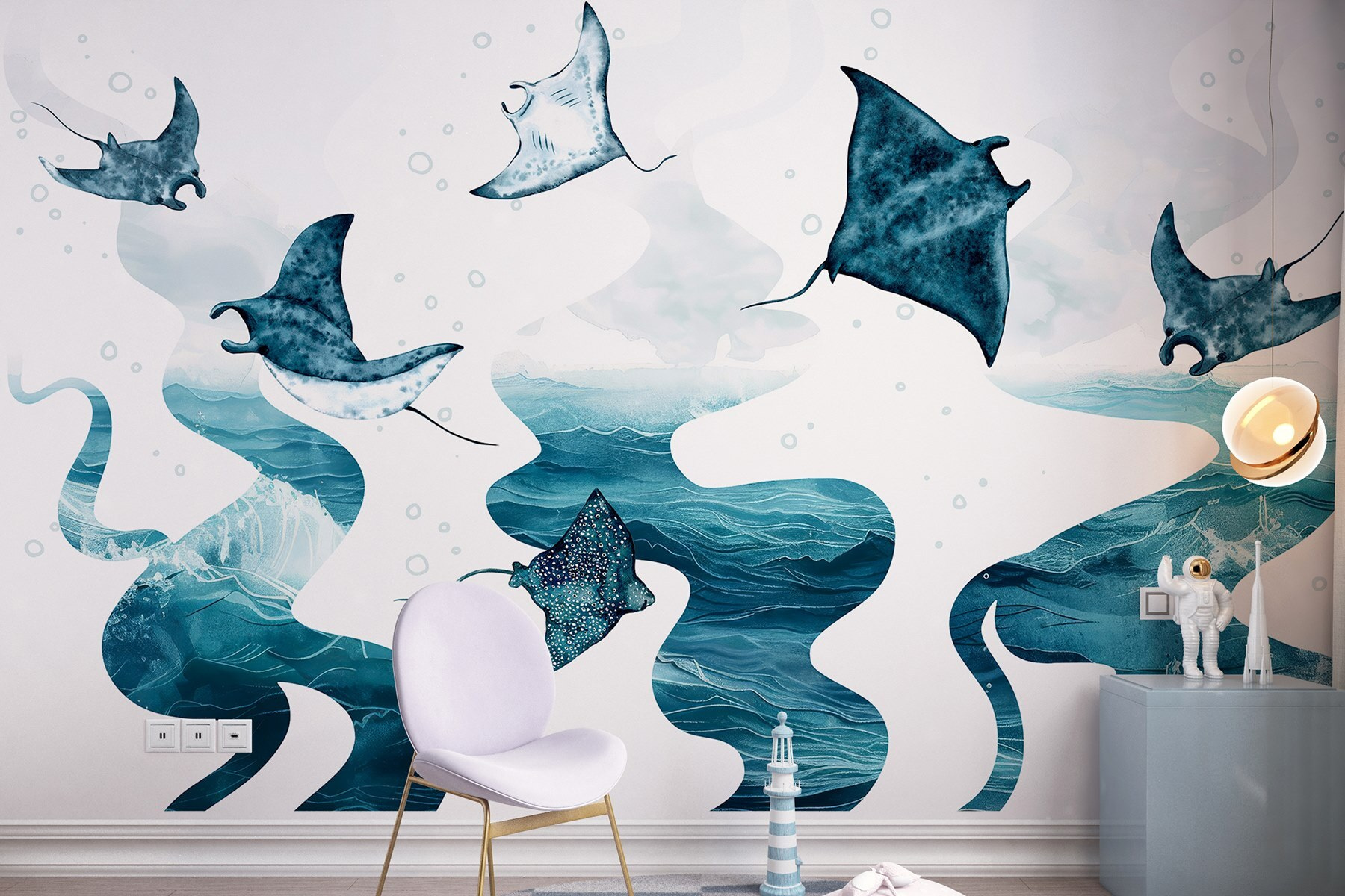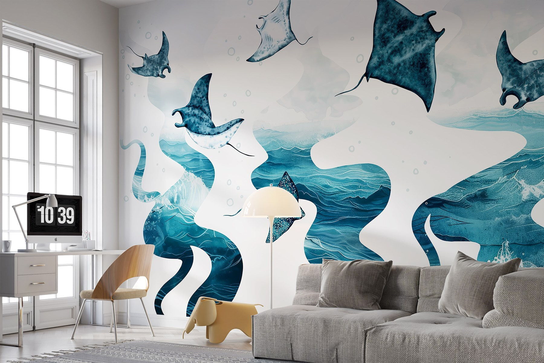 Verwandeln Sie jeden Raum in eine heitere Unterwasserwelt mit dieser atemberaubenden Fototapete, die Rochen zeigt, die anmutig durch das Wasser gleiten. Stellen Sie sich vor, Sie betreten einen Raum, in dem die beruhigenden Blautöne eine ruhige Atmosphäre schaffen, fast wie ein Mini-Urlaub direkt zu Hause. Der mühelose Fluss des Designs lässt Sie von Meereswellen und sanften Brisen träumen und macht es perfekt für eine Strandecke oder ein entspanntes Wohnzimmer. Und wer liebt keine Stachelrochen? Sie sind wie die sanften Riesen des Meeres und bringen einen Hauch von Wunder und Persönlichkeit an Ihre Wände. Es ist nicht nur Dekoration, sondern eine tägliche Erinnerung an die Schönheit der Natur, die auf subtile Weise zu Entspannung und Tagträumen vom Meer anregt. Tauchen Sie in dieses Wandbild ein und lassen Sie Ihrer Fantasie freien Lauf!