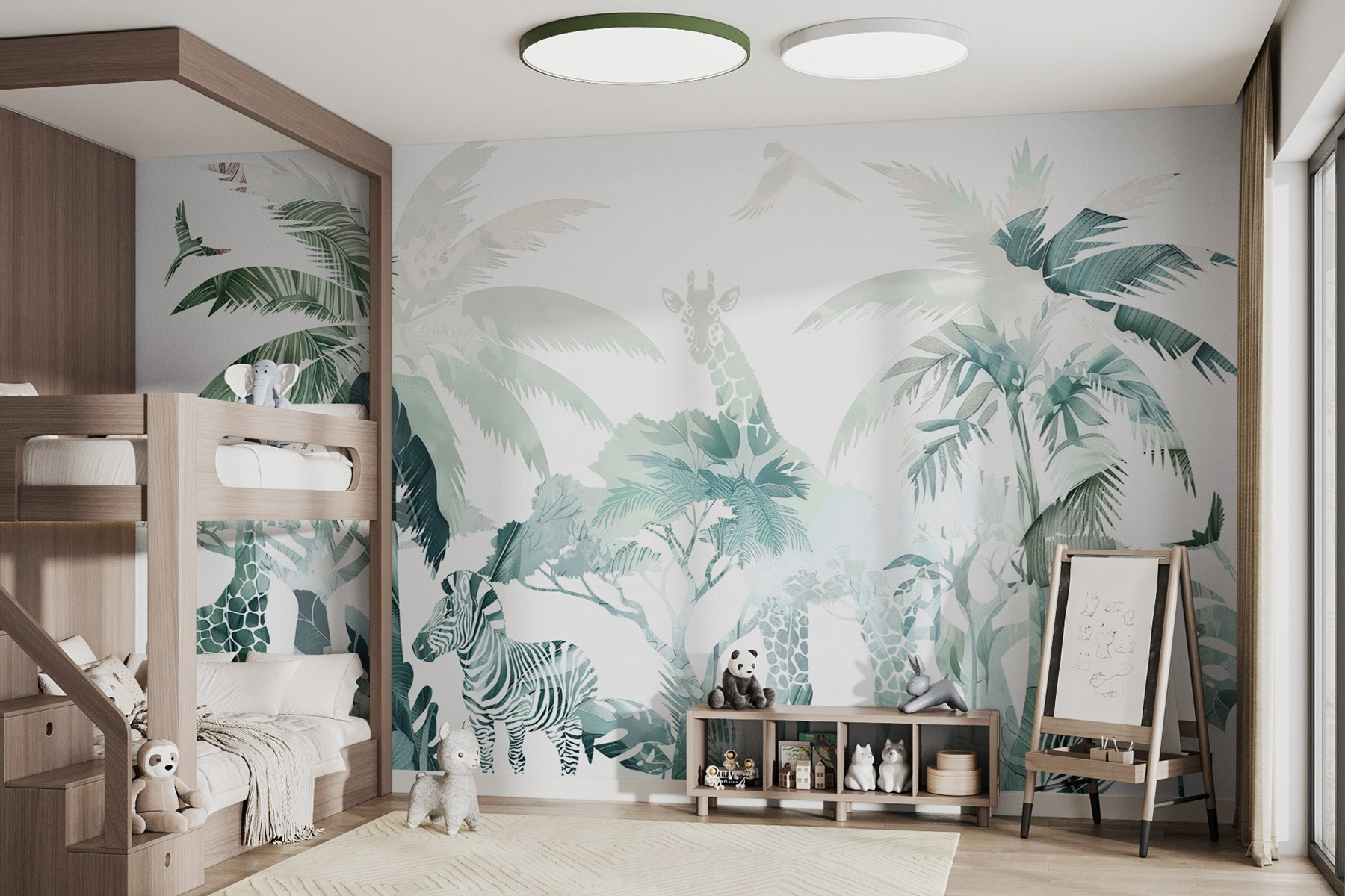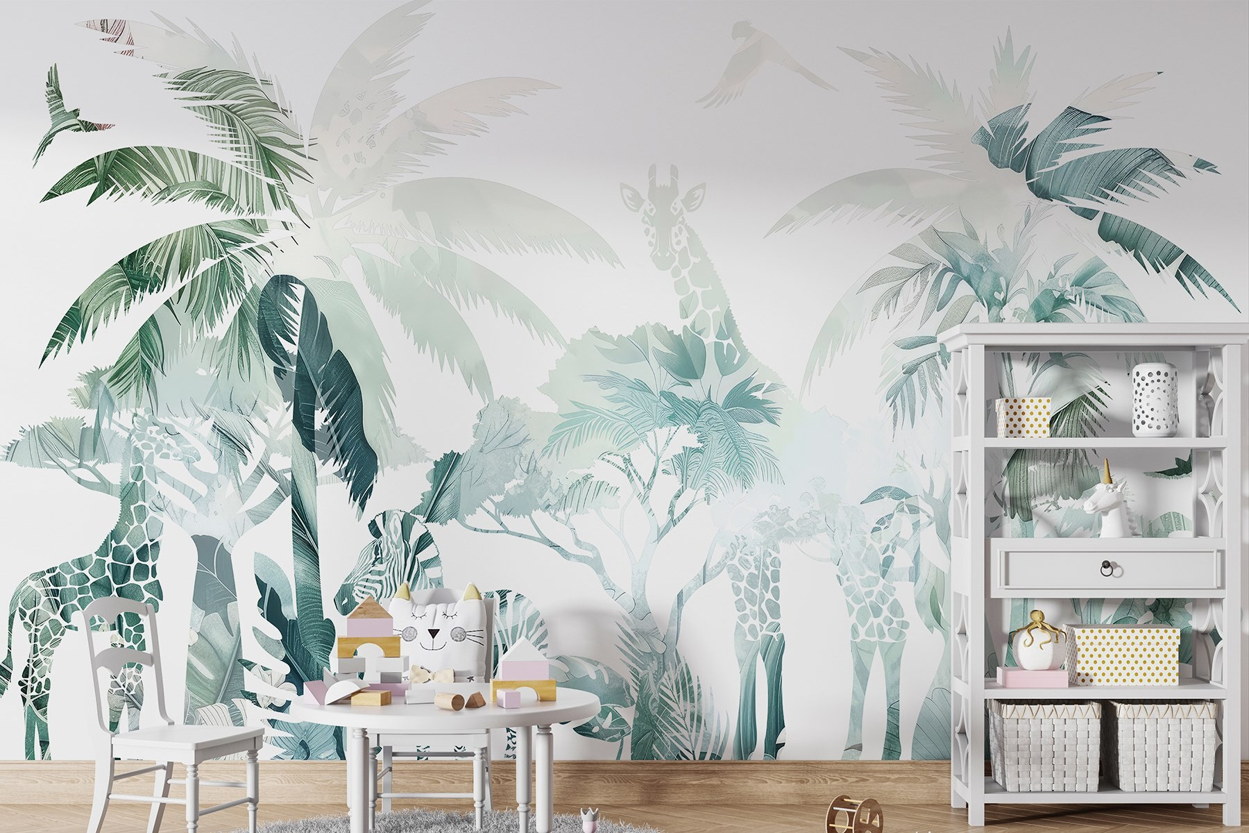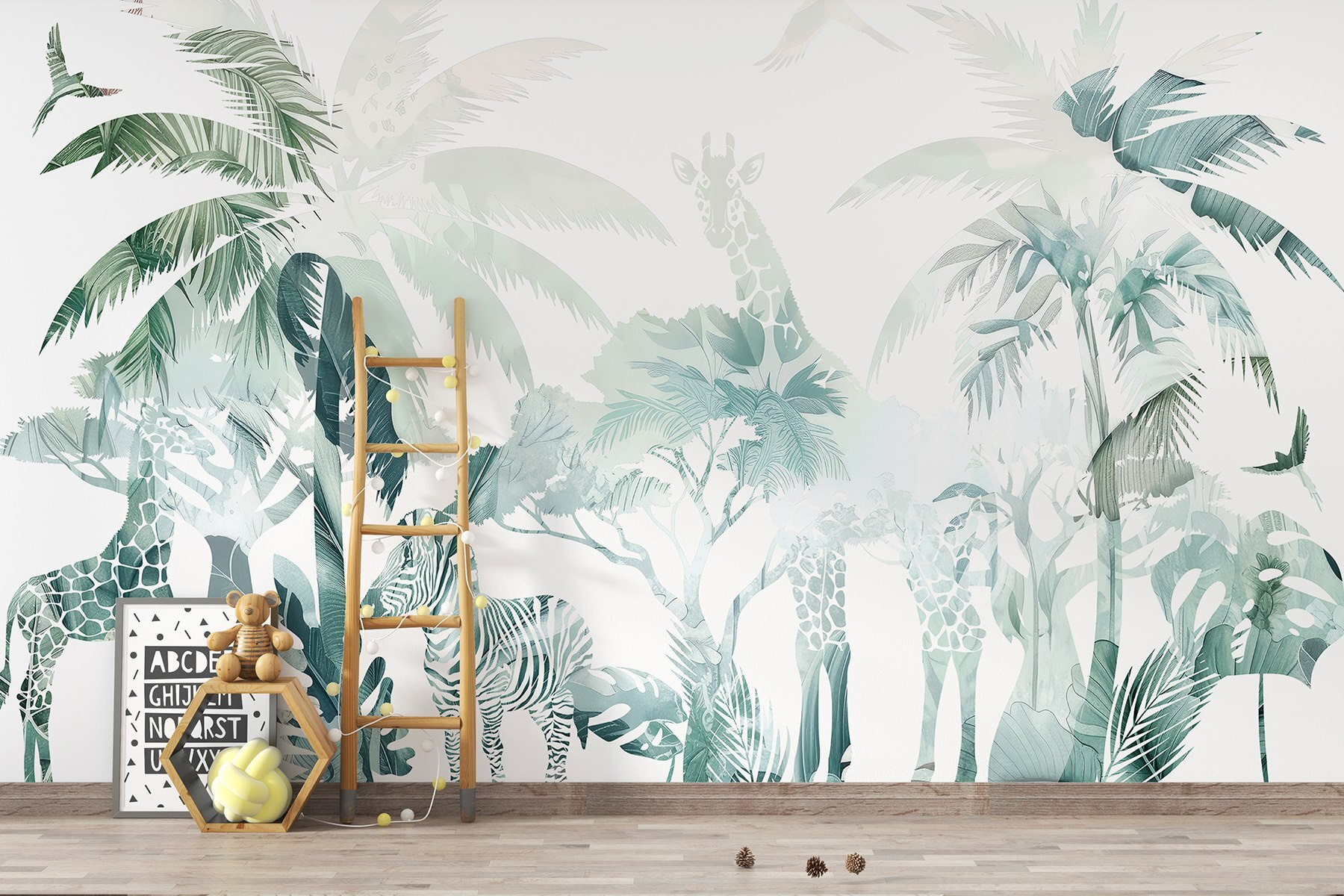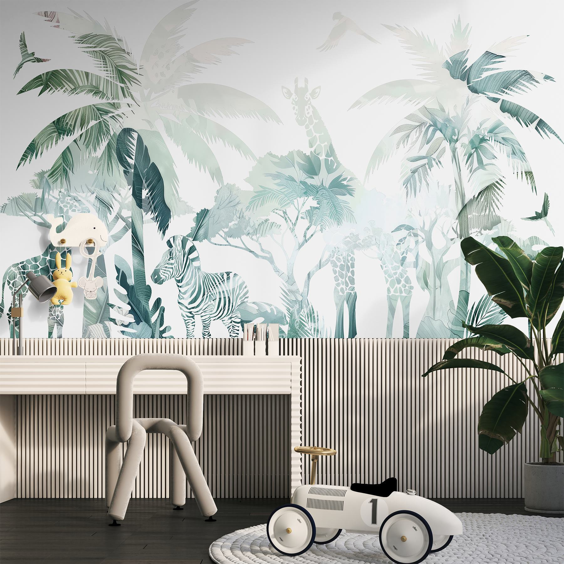 Verwandeln Sie Ihren Raum in einen ruhigen Zufluchtsort mit dieser atemberaubenden Fototapete, die eine Gruppe von Tieren in einem üppigen Wald zeigt. Stellen Sie sich vor, Sie schlendern jeden Tag durch einen ruhigen Dschungel – wie cool ist das denn? Diese Fototapete vereint sanfte Giraffen, verspielte Zebras und lebhafte Palmen und bringt einen Hauch von Naturzauber in Ihr Zuhause. Es eignet sich perfekt für ein gemütliches Wohnzimmer oder ein verspieltes Kinderzimmer und vermittelt ein Gefühl von Abenteuer und Wärme. Und stellen Sie sich vor, wie viel Spaß es machen würde, Ihren Freunden zu erklären, warum ein Zebra in Ihrem Flur steht! Eine einfache Möglichkeit, die Fantasie zu beflügeln und Freude im Alltag zu wecken.