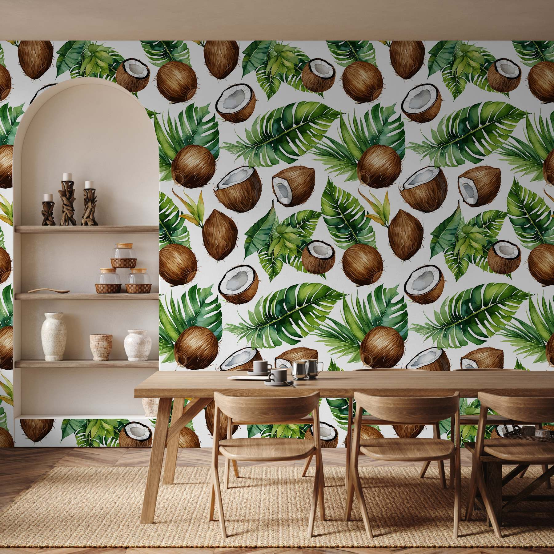 Verwandeln Sie eine schlichte Wand in ein tropisches Paradies mit diesem lebendigen Wandbild, das verspielte Kokosnüsse und üppige Blätter zeigt. Es ist, als ob Sie sich ein Stück Dschungel direkt nach Hause holen. Stellen Sie sich vor, Sie wachen mit diesem fröhlichen Muster auf – das ist praktisch jeden Tag ein Mini-Urlaub! Die erdigen Töne mischen sich perfekt mit den lebendigen Grüntönen und heben sofort die Stimmung. Dieses Wandbild eignet sich perfekt für eine gemütliche Leseecke oder eine lebhafte Küche, denn es dekoriert nicht nur, sondern erzählt auch eine Geschichte. Und wer würde sich nicht ein wenig entspannter fühlen, vielleicht sogar in Flip-Flops, wenn er von solch einer einladenden Stimmung umgeben ist? Lassen Sie Ihre Wände Leben und Charme versprühen.