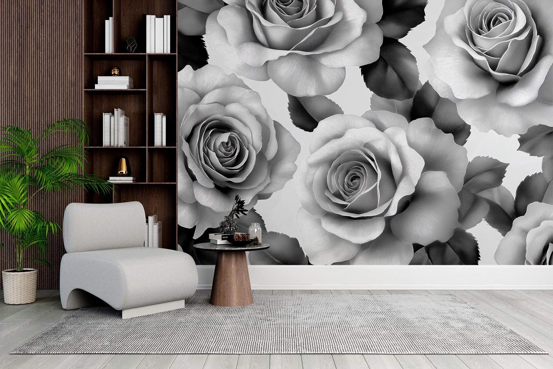 Verwandeln Sie Ihren Raum in ein Blumenwunderland mit dieser atemberaubenden Fototapete, die eine Gruppe eleganter Rosen und üppiger Blätter zeigt. Es ist nicht nur eine Dekoration, es ist wie ein Garten, der nie verwelkt, direkt an Ihrer Wand! Stellen Sie sich vor: Sie lehnen sich mit einer Tasse Tee zurück, und diese üppigen, schwarz-weißen Rosen umgeben Sie und verleihen Ihnen einen Hauch von Raffinesse und Gelassenheit. Perfekt für eine gemütliche Leseecke oder einen schicken Essbereich, lädt sie zu Wärme und Gesprächen ein. Ob das Sonnenlicht auf den Blütenblättern tanzt oder das Mondlicht weiche Schatten wirft, dieses Wandbild verleiht jedem Moment eine besondere Note. Ihre Wände werden das Gesprächsthema der Stadt sein – wer hätte gedacht, dass die Natur so stilvoll sein kann?