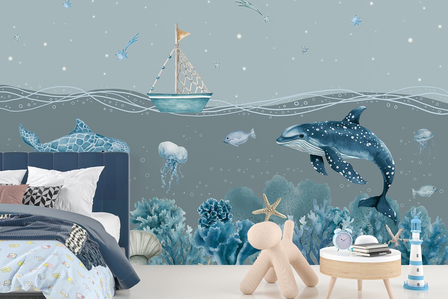 Verwandeln Sie Ihren Raum in eine heitere Unterwasserwelt mit der Fototapete “Sea Life”. Stellen Sie sich vor, Sie wachen jeden Tag mit verspielten Delfinen und sanften Quallen auf, die über Ihre Wände tanzen. Diese verträumte Szene zeigt ein charmantes kleines Boot, das durch ein ruhiges Meer gleitet, umgeben von bunten Korallen und Seesternen. Es ist, als hätte man ein Stück Ozean zu Hause – nur ohne die salzigen Haare! Diese Fototapete eignet sich perfekt für ein Kinderzimmer oder sogar eine gemütliche Leseecke und bringt einen Hauch von Laune und Ruhe. Lassen Sie die Farben auf sich wirken und schaffen Sie eine ruhige Atmosphäre, die Sie vielleicht zu Tagträumen von Abenteuern am Meer inspiriert.