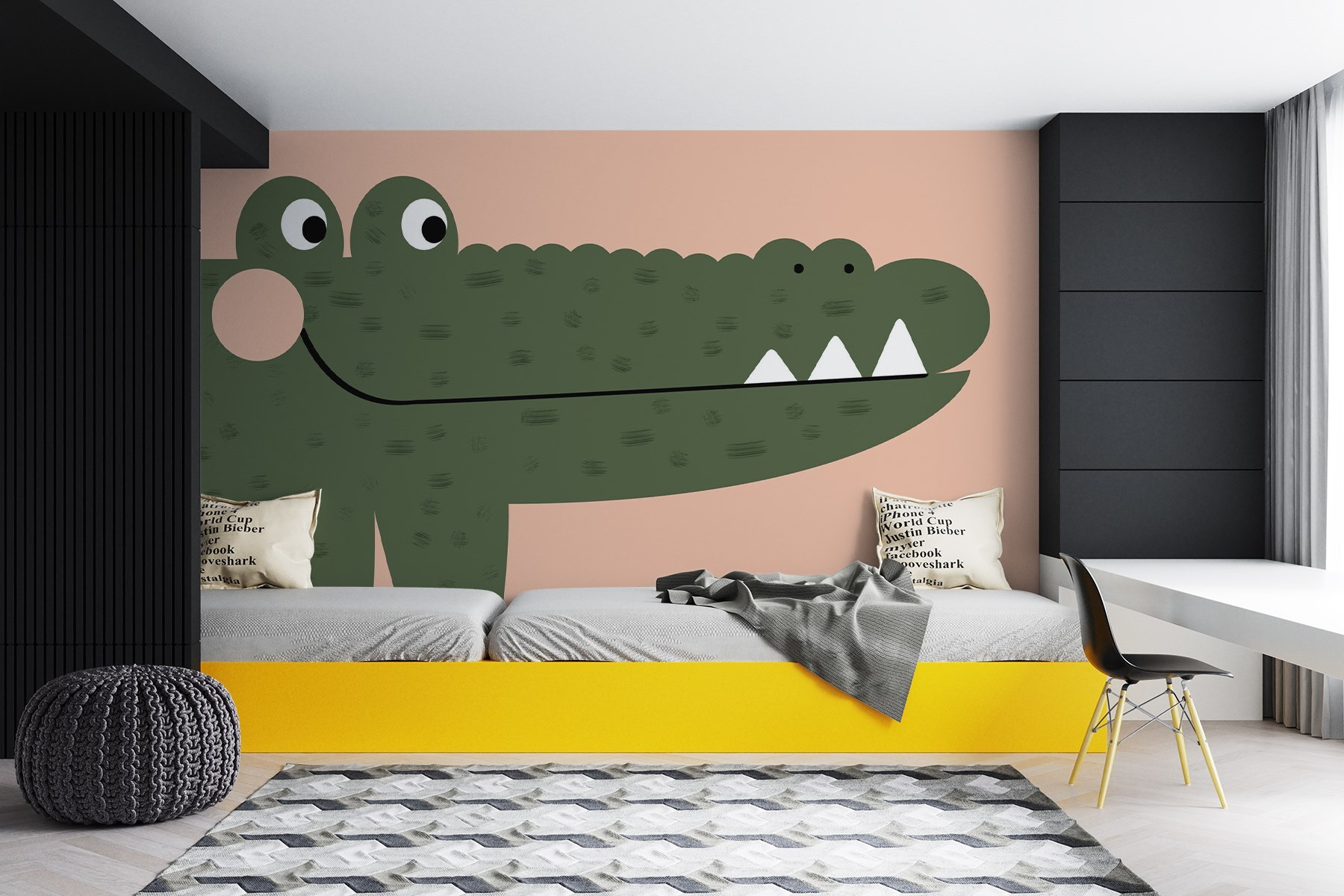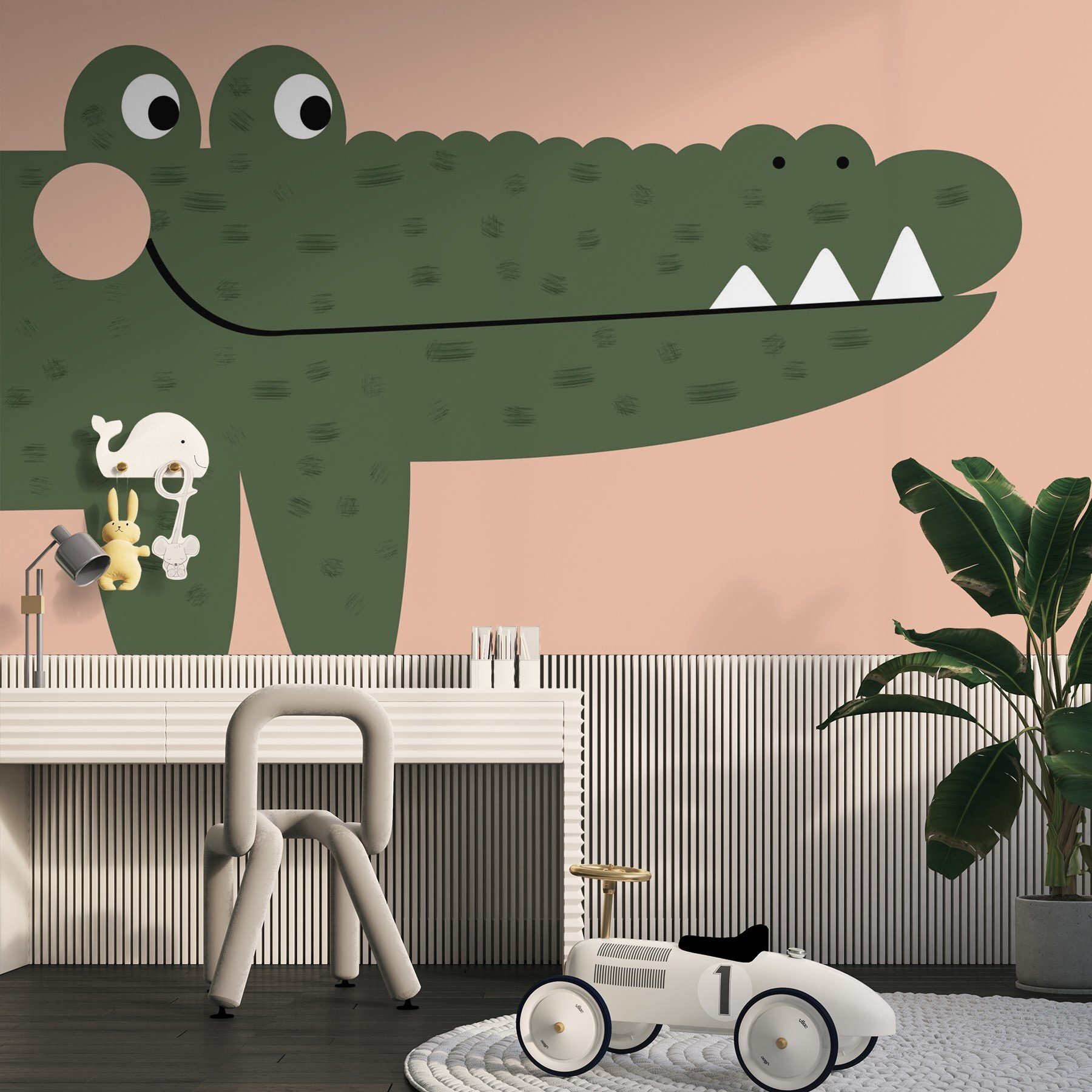 Mit dieser charmanten Fototapete mit einem freundlichen Krokodil können Sie jeden Raum verschönern! Sein verspieltes Design verleiht Kinderzimmern, Spielzimmern oder sogar einer gemütlichen Ecke Ihres Wohnzimmers einen Hauch von Laune. Stellen Sie sich vor, wie Ihre Kinder jedes Mal kichern, wenn sie vorbeigehen, oder wie Sie Freunde einladen, die über das verschmitzte Grinsen dieses herrlich illustrierten Krokodils lächeln müssen. Die sanften Farben und lustigen Formen laden zur Kreativität ein und bieten die perfekte Kulisse für fantasievolle Spiele oder Geschichtenerzählungen. Es ist mehr als nur Dekoration; es ist eine Einladung zum Abenteuer! Lassen Sie dieses fröhliche Krokodil an Ihrer Wand lustige Erinnerungen wecken. Wer hätte nicht gerne einen verspielten Begleiter, der über seinen Raum wacht?
