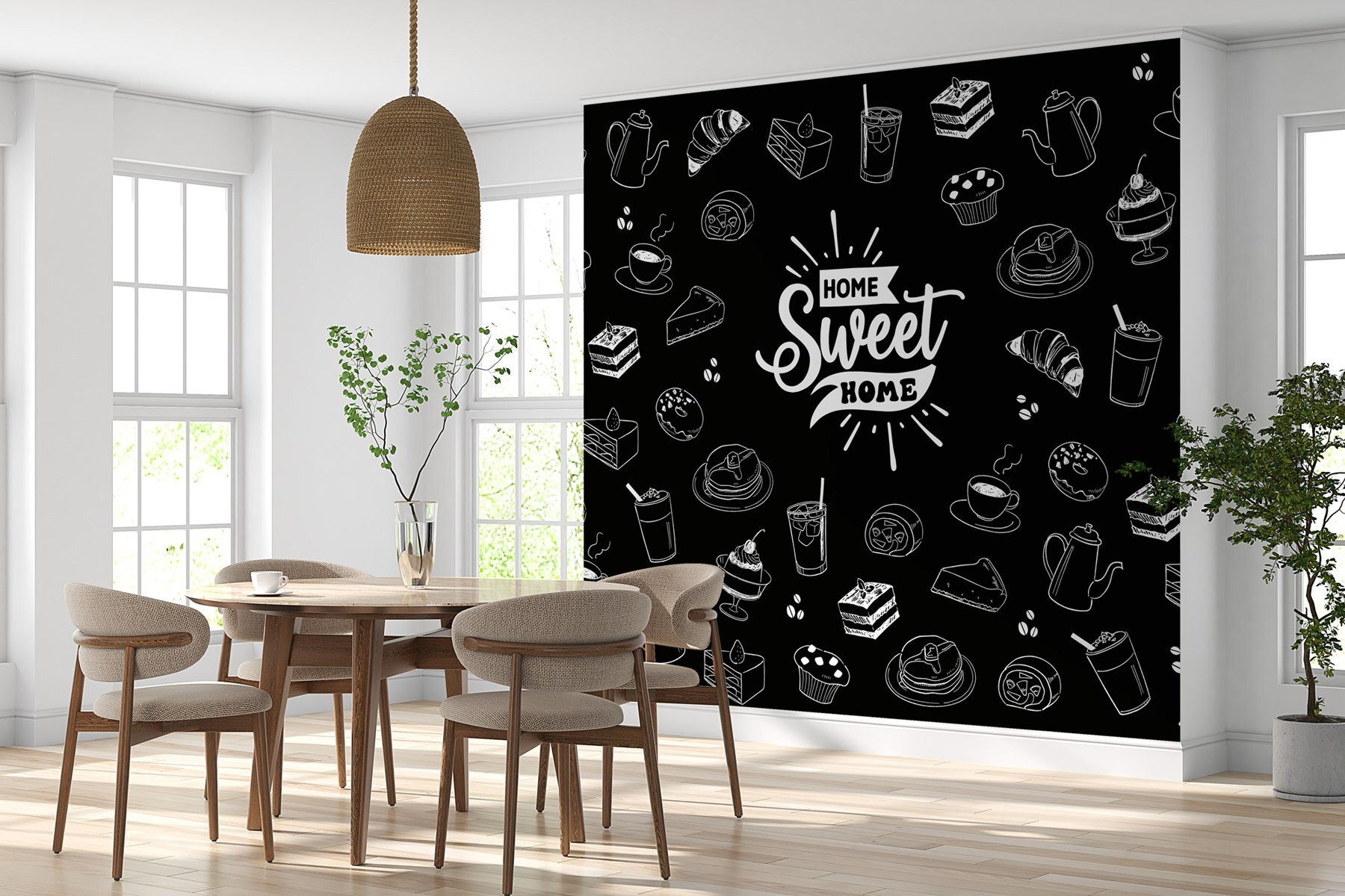Verwandeln Sie Ihren Raum mit dieser charmanten schwarz-weißen Fototapete, die eine reizvolle Reihe von Lebensmittelillustrationen zeigt. Stellen Sie sich vor, Sie machen es sich in Ihrer Küche gemütlich, umgeben von verspielten Skizzen von Cupcakes, Kaffeetassen und Gebäck. Es ist wie ein freundliches kleines Café direkt an Ihrer Wand, das Sie zum Genießen einlädt. Und der Slogan “Home Sweet Home” verleiht dem Ganzen eine herzerwärmende Note – denn wer liebt es nicht, wenn er an seinen Lieblingsort erinnert wird? Dieses Wandbild ist perfekt für alle, die einen guten Snack und ein gutes Lachen zu schätzen wissen, und bringt eine skurrile Stimmung mit sich, die Sie jeden Tag genießen werden. Es ist ein Dekor, das köstlich spricht!