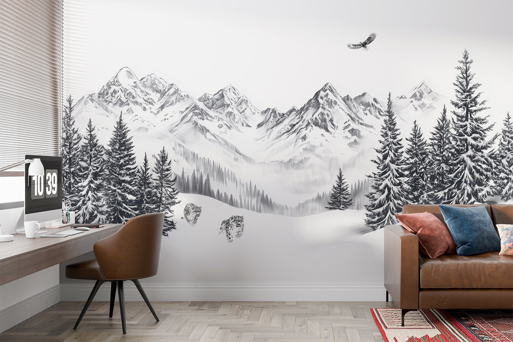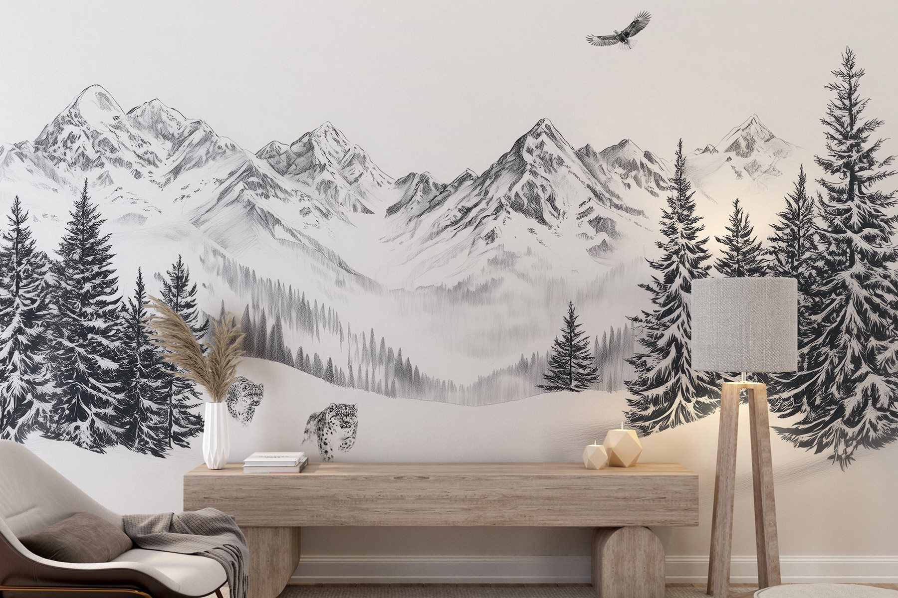 Verwandeln Sie jede Wand in einen ruhigen Zufluchtsort mit dieser atemberaubenden verschneiten Berglandschaft als Wandbild. Stellen Sie sich das sanfte Rauschen des fallenden Schnees vor, während sich majestätische Berge in die Wolken erheben und ein einsamer Vogel über Ihnen gleitet. Es ist, als würde man ein friedliches Stück Natur ins Haus holen. Stellen Sie sich vor, Sie nippen an Ihrem Morgenkaffee, betrachten diese Schönheit und spüren, wie ein Gefühl der Ruhe über Sie hereinbricht. Diese Fototapete eignet sich perfekt für gemütliche Ecken oder markante Wände und verleiht ihnen nicht nur Charakter, sondern lädt auch zu Tagträumen von verschneiten Wanderungen und frischer Bergluft ein. Und wer hätte nicht gern ein paar freche Leoparden in der Nähe? Es ist ein Gesprächsanlass und eine Fluchtmöglichkeit in einem!