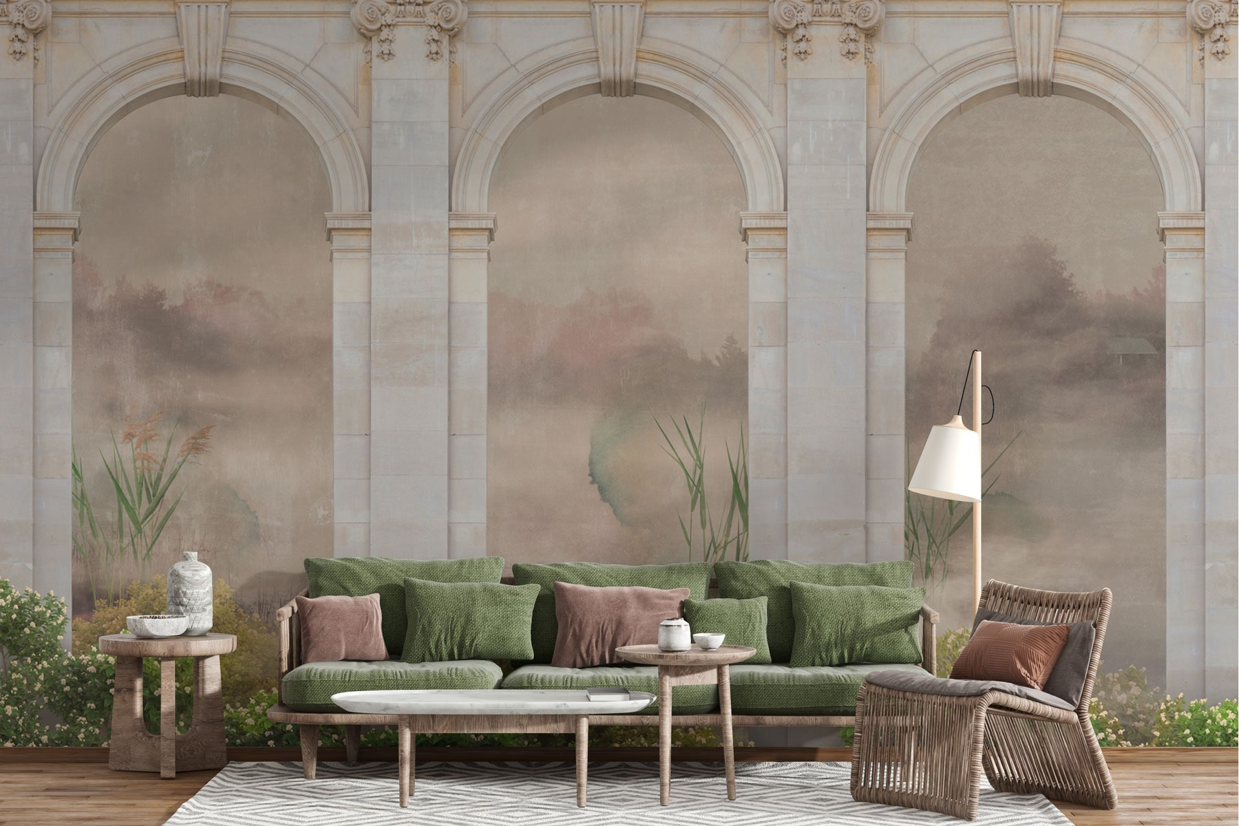 Verwandeln Sie jeden Raum mit der bezaubernden Fototapete “Steinbögen mit Pflanzen und Sträuchern”. Stellen Sie sich vor, Sie treten durch große Bögen in einen ruhigen Garten, wo zartes Grün und zarte Blüten einen Hauch von Natur ins Haus bringen. Es fühlt sich an wie eine geheime Zuflucht, perfekt, um zu träumen oder in Ihrer gemütlichen Ecke einen Kaffee zu trinken. Vielleicht bleiben Ihre Freunde einfach stehen und fragen sich, ob Sie Ihr Zuhause in eine versteckte Oase verwandelt haben. Die mehrschichtigen Texturen und sanften Farbtöne laden zu einer ruhigen Atmosphäre ein – keine langweiligen Wände mehr! Es ist eine wunderbare Erinnerung daran, dass ein wenig Natur große Freude auslösen kann, direkt in Ihrem Wohnzimmer.