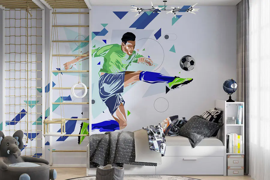 Verwandeln Sie jeden Raum in eine lebendige Arena mit dieser auffälligen Fototapete, die einen jungen Mann zeigt, der einen Fußball kickt. Es ist nicht nur ein Stück Dekoration, sondern ein in der Zeit eingefrorener Moment, der die Energie und Leidenschaft des Spiels einfängt. Stellen Sie sich diese Fototapete in einem Wohnzimmer oder einem Spielzimmer vor, wo sie zu nächtlichen Matches und freundlichem Geplänkel inspiriert. Die dynamischen Farben und geometrischen Formen verleihen dem Bild einen modernen Touch, der die Atmosphäre sofort auflockert. Egal, ob du mit Freunden chillst oder von einem unmöglichen Tor träumst, diese Fototapete sorgt für eine elektrisierende Stimmung, die Freude und vielleicht sogar ein wenig Motivation auslöst. Volltreffer mit Stil!