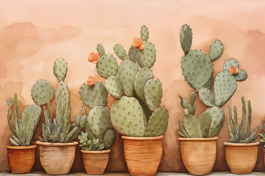 Mit dieser bezaubernden Fototapete, die eine Gruppe von Kakteen in Töpfen zeigt, können Sie jeden Raum verschönern. Stellen Sie sich vor: Sie betreten einen Raum und fühlen sich, als wären Sie gerade in einen Wüstengarten gewandert, komplett mit diesen skurrilen Formen und hellen Blüten. Es ist, als hätte man ein Stück Natur direkt an der Wand, ohne sich um die Pflege kümmern zu müssen – kein Gießen oder stachelige Überraschungen! Die warmen, erdigen Töne sorgen für eine gemütliche Atmosphäre und eignen sich perfekt für jede Ecke. Ob im Wohnzimmer oder in der Leseecke, diese Fototapete bringt ein bisschen Sonne ins Haus, und wer würde das nicht wollen?