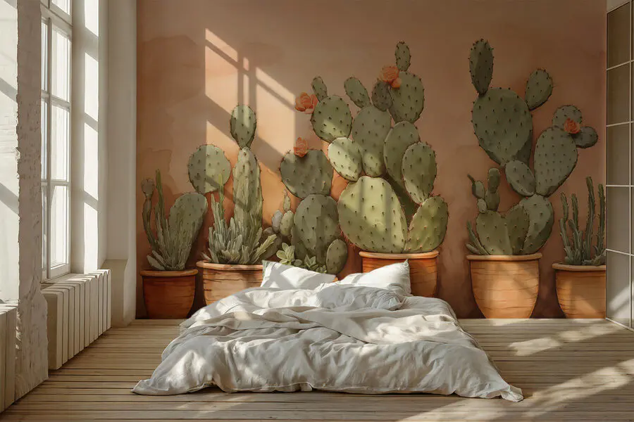 Mit dieser bezaubernden Fototapete, die eine Gruppe von Kakteen in Töpfen zeigt, können Sie jeden Raum verschönern. Stellen Sie sich vor: Sie betreten einen Raum und fühlen sich, als wären Sie gerade in einen Wüstengarten gewandert, komplett mit diesen skurrilen Formen und hellen Blüten. Es ist, als hätte man ein Stück Natur direkt an der Wand, ohne sich um die Pflege kümmern zu müssen – kein Gießen oder stachelige Überraschungen! Die warmen, erdigen Töne sorgen für eine gemütliche Atmosphäre und eignen sich perfekt für jede Ecke. Ob im Wohnzimmer oder in der Leseecke, diese Fototapete bringt ein bisschen Sonne ins Haus, und wer würde das nicht wollen?