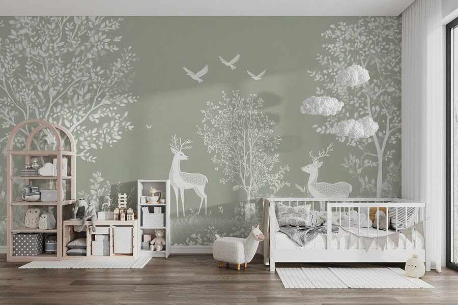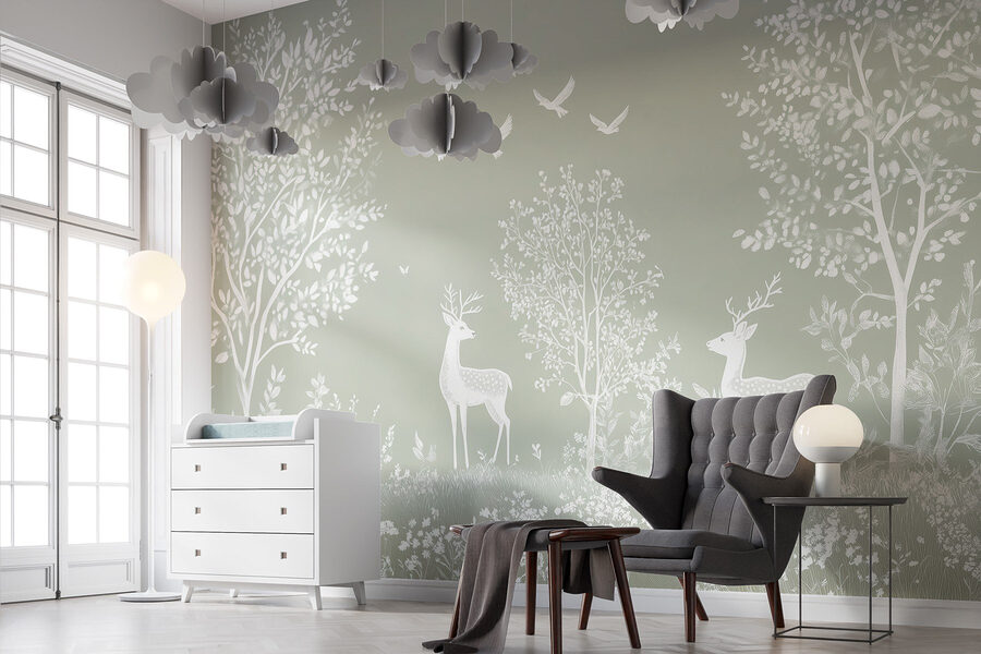 Stellen Sie sich vor, Sie betreten einen ruhigen Wald, in dem die sanfte Schönheit der Natur Sie zum Innehalten einlädt. Dieses Wandbild mit anmutigen weißen Hirschen und verspielten Vögeln inmitten üppiger Bäume macht genau das – es verwandelt jeden Raum in einen beruhigenden Rückzugsort. Die sanften Farbtöne schaffen eine luftige Atmosphäre und eignen sich daher perfekt für gemütliche Räume oder eine ruhige Leseecke. Stellen Sie sich vor, Sie schlürfen einen Tee und träumen von Abenteuern im Wald oder hören das Rascheln der Blätter. Es ist, als ob man sich ein Stück Natur ins Haus holt, nur ohne die Mücken! Eine einfache Möglichkeit, ein wenig Laune und Ruhe in den Alltag zu bringen. Perfekt für Naturliebhaber oder alle, die eine kleine Auszeit brauchen.