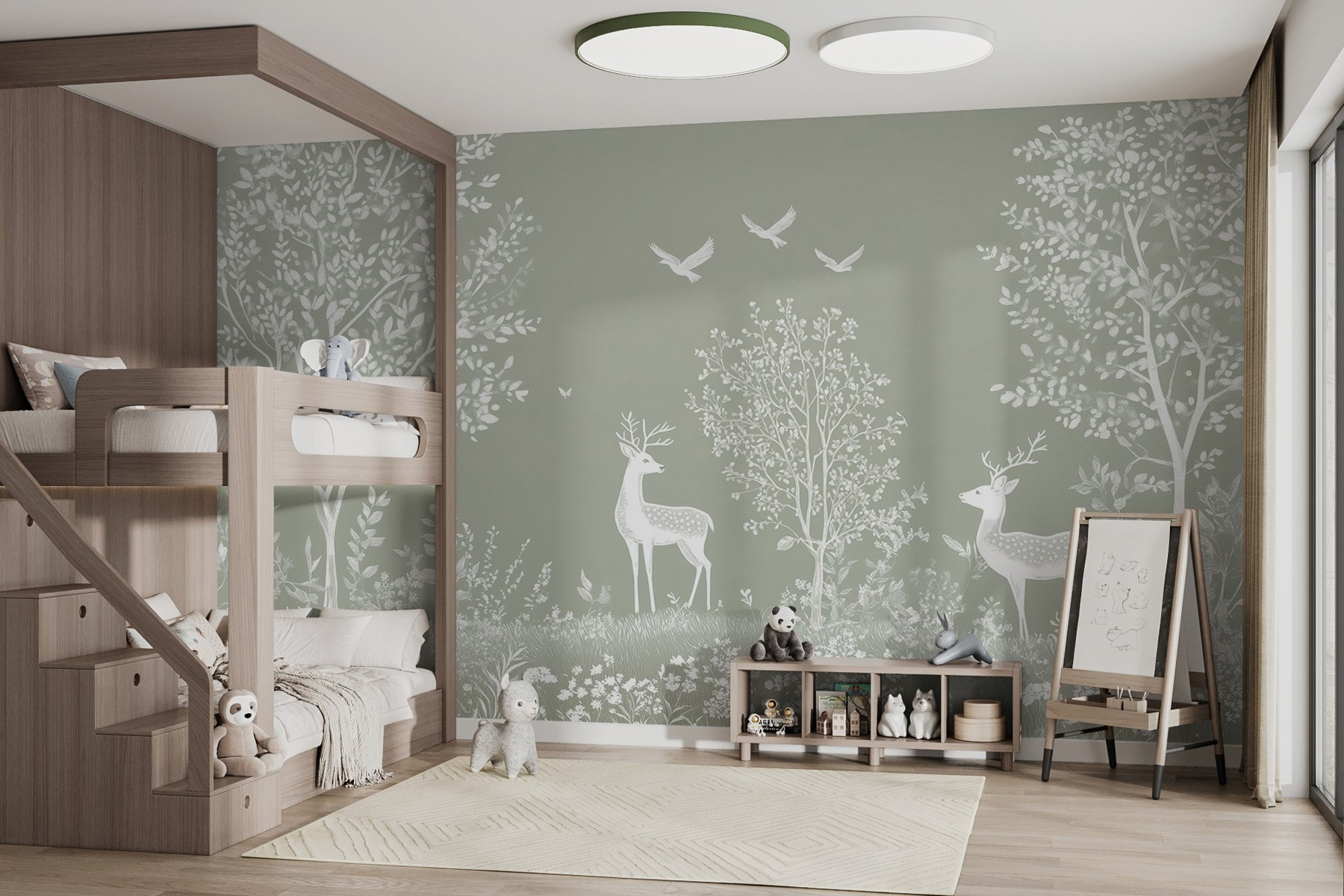 Stellen Sie sich vor, Sie betreten einen ruhigen Wald, in dem die sanfte Schönheit der Natur Sie zum Innehalten einlädt. Dieses Wandbild mit anmutigen weißen Hirschen und verspielten Vögeln inmitten üppiger Bäume macht genau das – es verwandelt jeden Raum in einen beruhigenden Rückzugsort. Die sanften Farbtöne schaffen eine luftige Atmosphäre und eignen sich daher perfekt für gemütliche Räume oder eine ruhige Leseecke. Stellen Sie sich vor, Sie schlürfen einen Tee und träumen von Abenteuern im Wald oder hören das Rascheln der Blätter. Es ist, als ob man sich ein Stück Natur ins Haus holt, nur ohne die Mücken! Eine einfache Möglichkeit, ein wenig Laune und Ruhe in den Alltag zu bringen. Perfekt für Naturliebhaber oder alle, die eine kleine Auszeit brauchen.