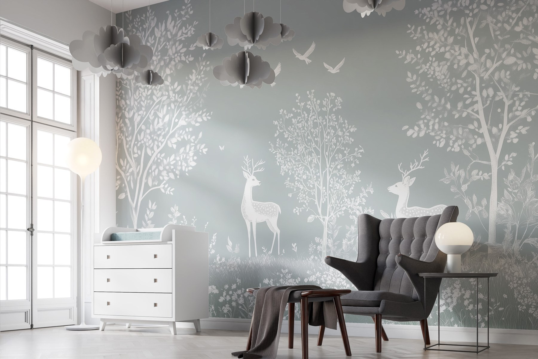Verwandeln Sie Ihren Raum in einen ruhigen Zufluchtsort mit dieser bezaubernden Fototapete, die anmutige weiße Hirsche zeigt, die durch einen weichen, belaubten Wald streifen. Stellen Sie sich vor, Sie betreten Ihr Zimmer und haben das Gefühl, in einen verträumten Wald voller sanfter, flüsternder Natur einzutauchen. Die zarten Vögel, die über Ihnen flattern, verleihen dem Bild einen Hauch von Laune und machen es zu einer perfekten Kulisse für gemütliche Abende oder inspirierende Morgenstunden. Es ist, als hätte man einen friedlichen Rückzugsort direkt zu Hause! Ob Sie nun einen Tee trinken oder ein Buch lesen, diese Fototapete lädt zu kleinen Momenten der Ruhe ein. Außerdem ist es ein toller Gesprächsanlass – wer würde nicht gerne über seinen geheimen Wald plaudern?