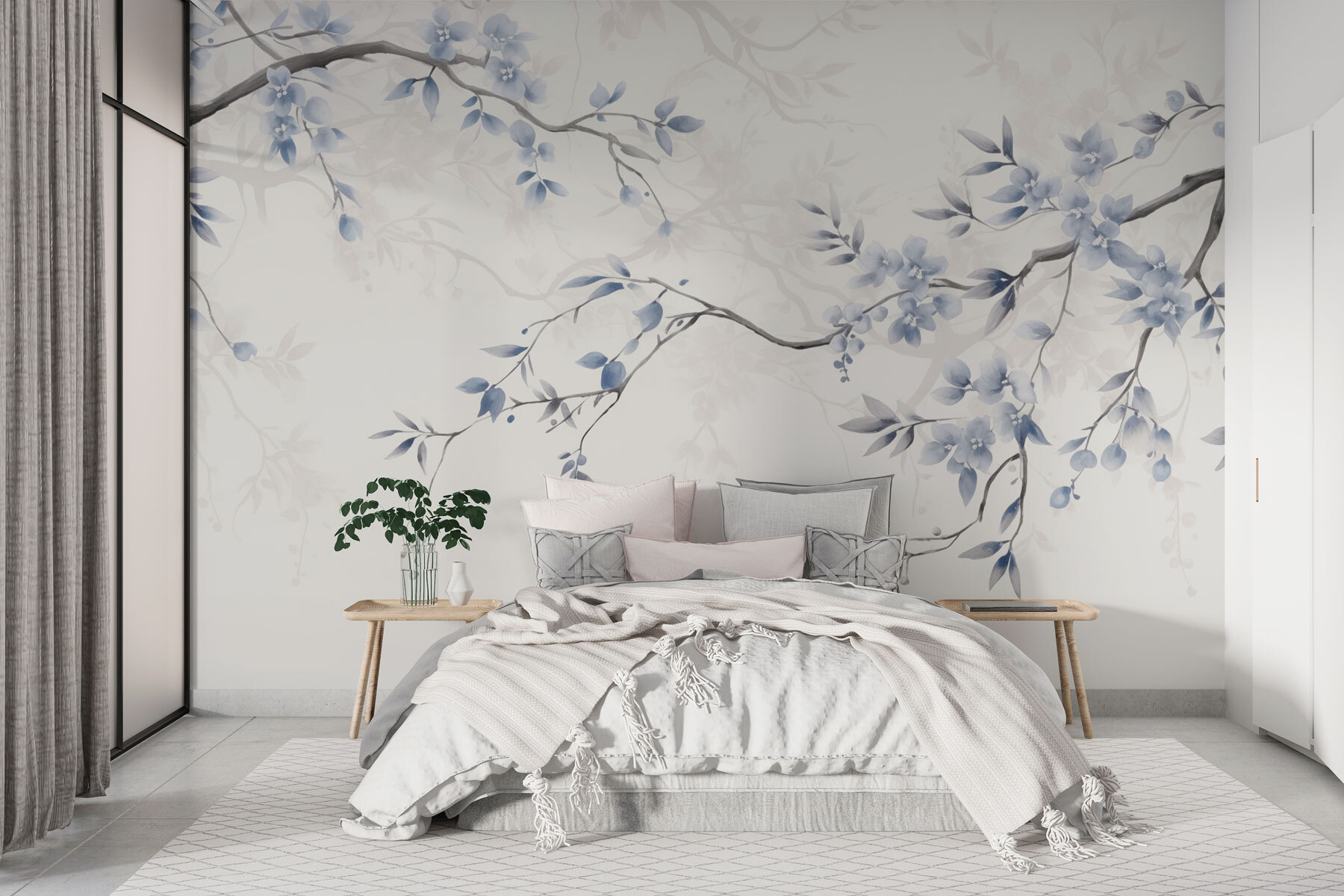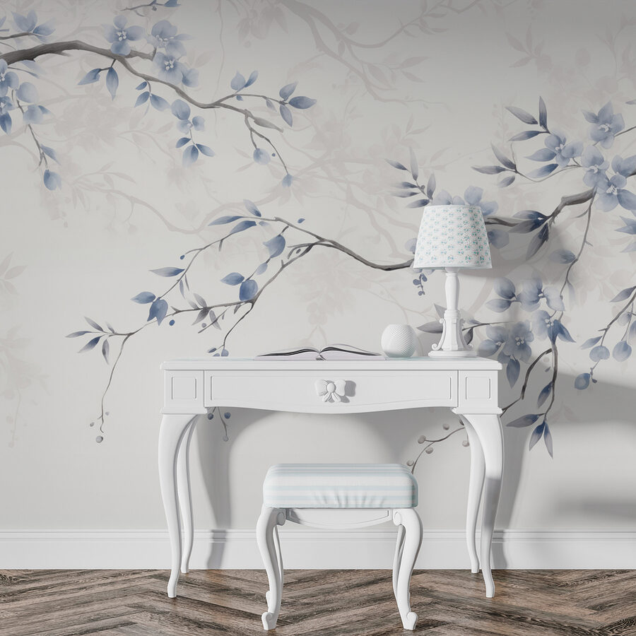 Verwandeln Sie Ihren Raum mit dieser bezaubernden Fototapete “Zweig mit blauen Blumen und Blättern”. Stellen Sie sich vor, jeden Tag in einen ruhigen japanischen Garten zu gehen – ruhig, friedlich und ein bisschen magisch. Die weichen Aquarellblüten wiegen sich sanft, als würden sie die Geheimnisse der Natur flüstern. Diese Fototapete eignet sich perfekt für eine gemütliche Leseecke oder eine helle Küchenecke und lädt zu herrlichen Tagträumen ein. Stellen Sie sich einen Morgenkaffee vor, umgeben von diesen schönen Blautönen. Es ist, als ob man einen Hauch von frischer Luft ins Haus holt, der jeden Blick zu einer kleinen Flucht macht. Bringen Sie dieses Wandbild in Ihr Zuhause und lassen Sie sich von der Schönheit der Natur daran erinnern, innezuhalten und die kleinen Dinge zu schätzen.