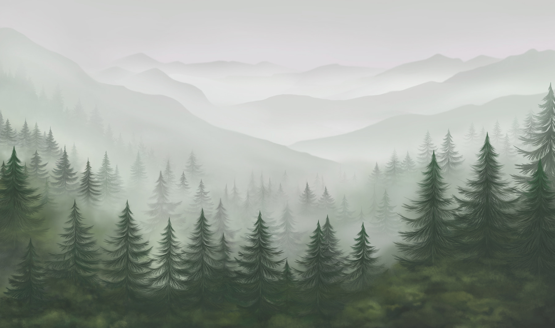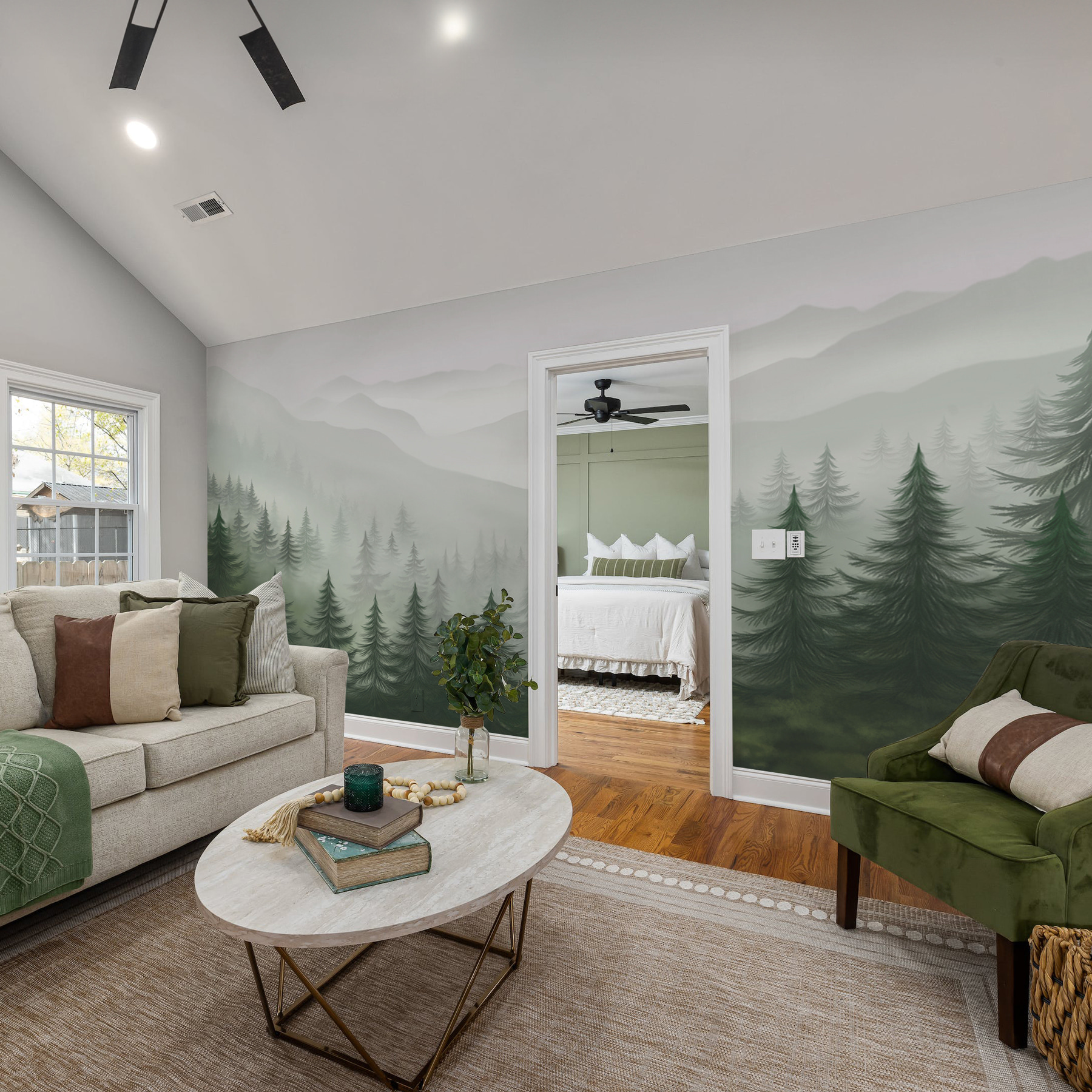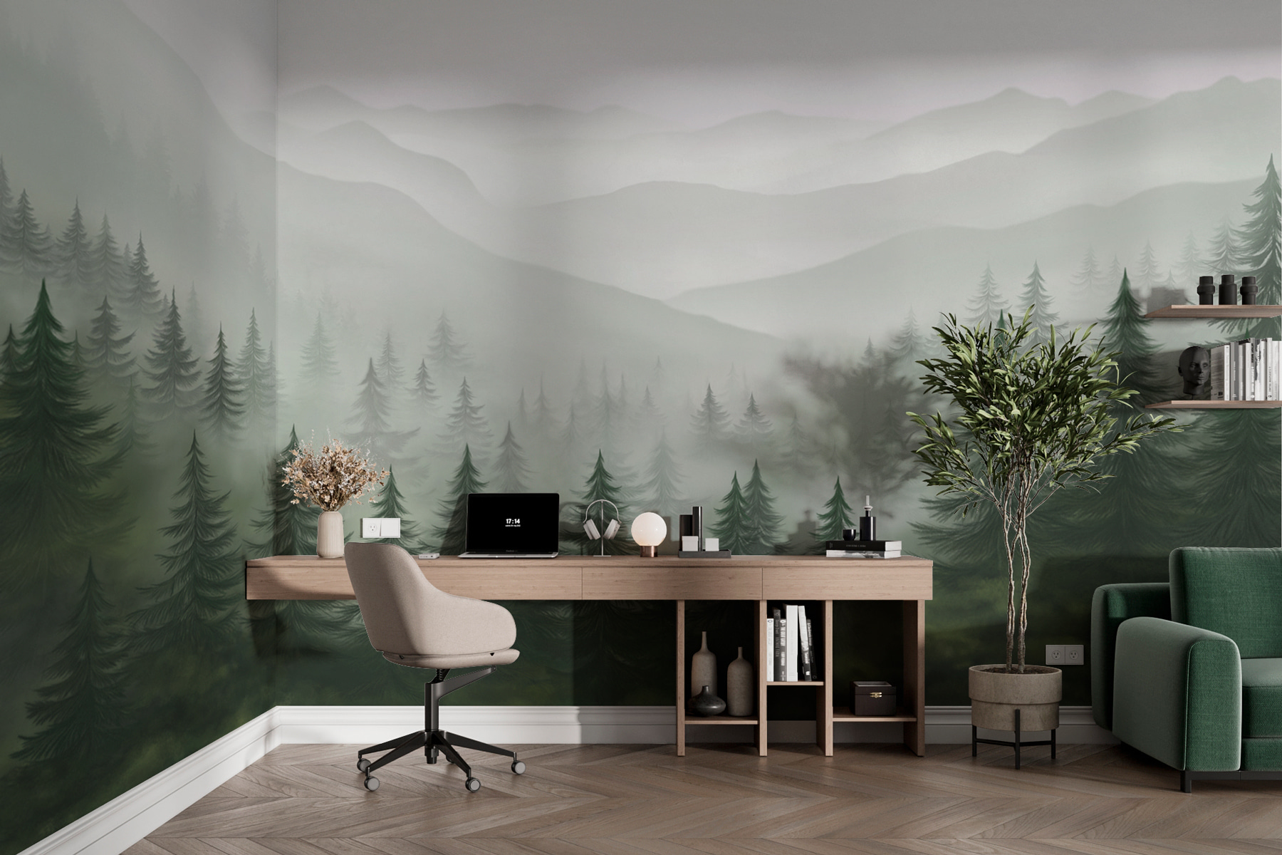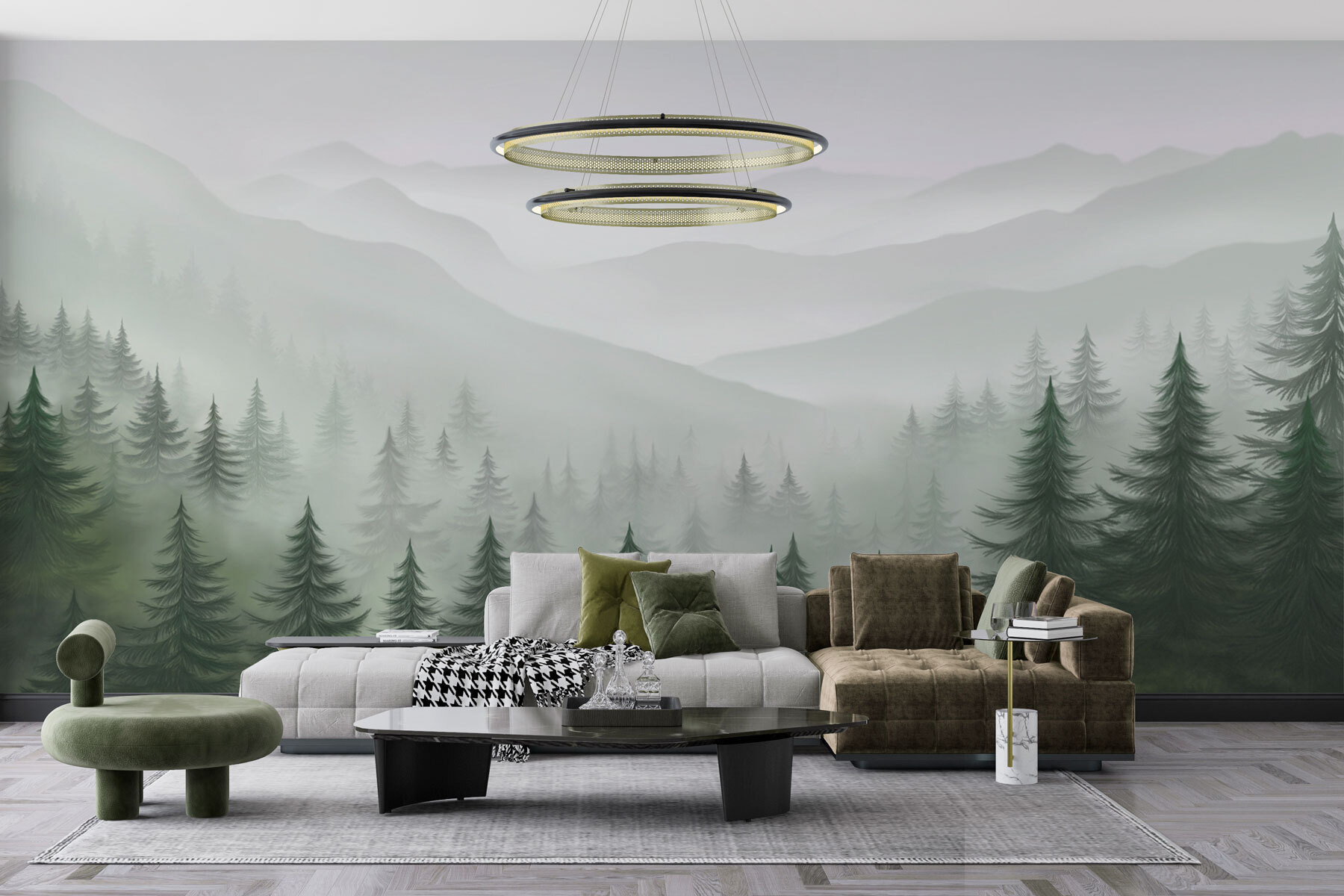 Verwandeln Sie jeden Raum in einen ruhigen Zufluchtsort mit dieser atemberaubenden Fototapete “Neblige Landschaft mit Bäumen und Bergen”. Stellen Sie sich vor, Sie machen es sich mit einer Tasse Tee gemütlich und sind dabei von hoch aufragenden Kiefern und nebligen Bergen umgeben. Es ist, als würde man in einen verträumten Wald eintauchen, nur ohne Ungeziefer und matschige Schuhe. Die sanften Grün- und Grautöne schaffen eine beruhigende Atmosphäre und eignen sich perfekt für eine gemütliche Leseecke oder ein ruhiges Schlafzimmer. Es flüstert: “Atme tief durch und entspanne dich.” Und wer hat das nicht nötig? Ob als Gesprächsanreger oder als friedliche Kulisse, dieses Wandbild bringt einen Hauch von Natur an Ihre Wände.