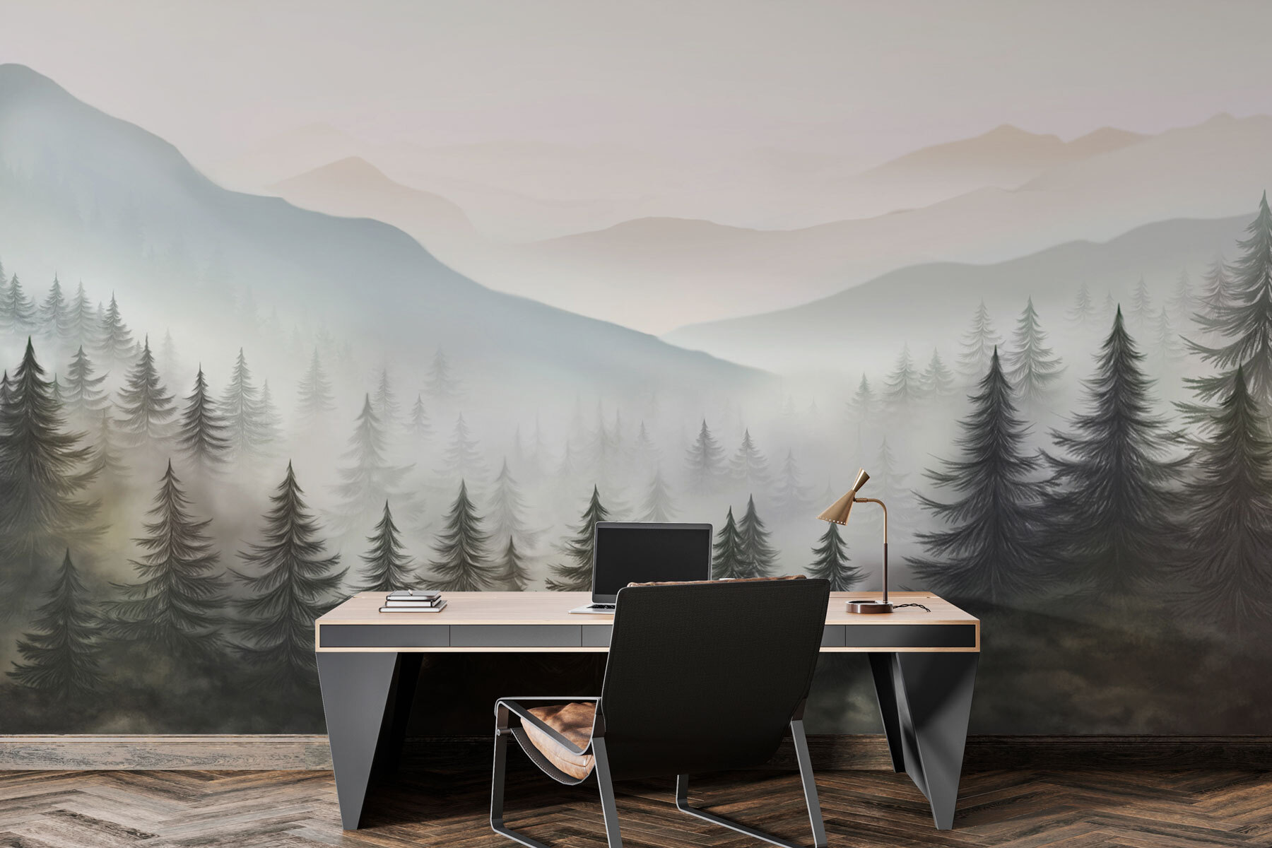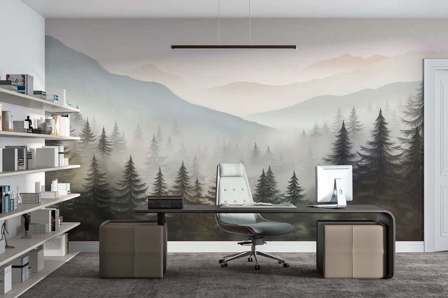 Stellen Sie sich vor, Sie treten in einen ruhigen Wald, in dem der Nebel um die hoch aufragenden Bäume tanzt und sich die Berge in der Ferne sanft abzeichnen. Diese Fototapete “Neblige Landschaft mit Bäumen und Bergen” bringt diese verträumte Flucht direkt in Ihr Zuhause. Es eignet sich perfekt für eine gemütliche Leseecke oder ein Zen-Schlafzimmer und lädt zu einem Gefühl der Ruhe ein. Stellen Sie sich vor, wie Sie sich hier nach einem langen Tag entspannen, vielleicht mit einer Tasse Tee, während die Natur durch den Nebel süße Töne flüstert. Die sanften Töne verleihen Ihrem Raum einen Hauch von Eleganz und lassen ihn wie ein kleines Stück vom Paradies erscheinen. Mit dieser Fototapete ist es nur ein kleiner Schritt, um Ihre Wände in einen ruhigen Rückzugsort zu verwandeln!