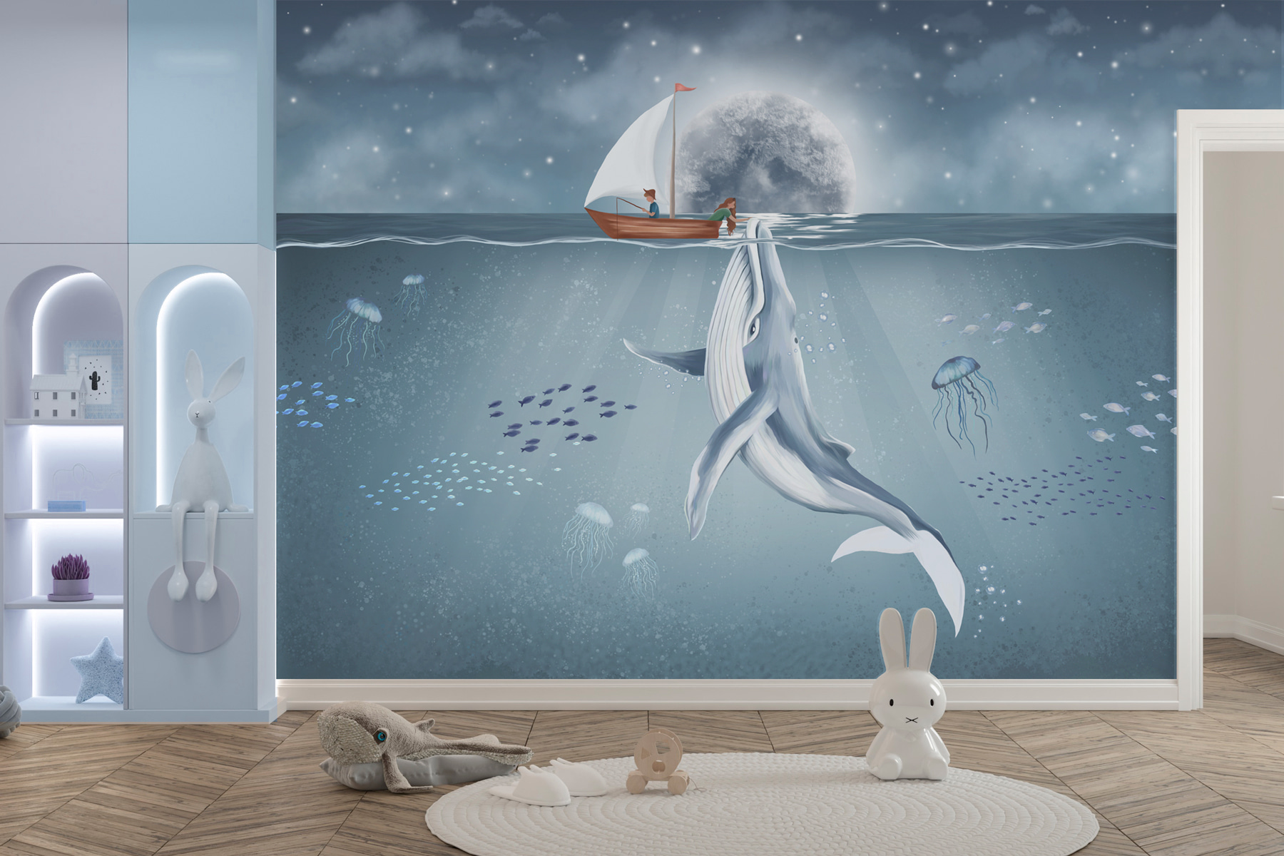 Tauchen Sie ein in eine wunderbare Welt mit der Fototapete “Whale Swimming in the Water”. Diese Fototapete verwandelt jede triste Wand in eine heitere Unterwasserszene, in der ein majestätischer Wal anmutig unter den Wellen gleitet. Stellen Sie sich vor: Sie sitzen in Ihrem Wohnzimmer und trinken Tee, und da ist sie, die ruhige Schönheit des Ozeans direkt vor Ihnen. Die sanften Blau- und Weißtöne schaffen eine beruhigende Atmosphäre, die perfekt ist, um nach einem langen Tag die Seele baumeln zu lassen. Außerdem regt es zu Gesprächen an – jeder liebt eine gute Walgeschichte! Stellen Sie sich vor, wie Ihre Freunde hereinspazieren und sich die Augen über diese heitere, ozeanische Kulisse weiten. Perfekt für ein Kinderzimmer oder eine gemütliche Leseecke – es ist, als würde man sich ein Stück Meer nach Hause holen. Erfreuen Sie sich an der Schönheit der Natur und sorgen Sie für frischen Wind in Ihrer Einrichtung!