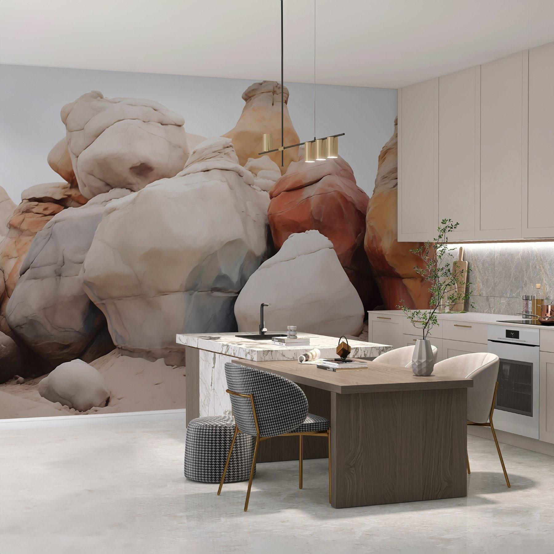 Verwandeln Sie Ihren Raum mit dieser atemberaubenden Fototapete, die eine Gruppe von großen Felsen in einer weichen, sandigen Umgebung zeigt. Es ist, als ob Sie sich ein Stück Natur direkt in Ihr Zuhause holen würden, das an faule Strandtage und das beruhigende Rauschen der Wellen erinnert. Die sanften Farbtöne der Felsen sorgen für Wärme, während die Sandtöne für Gemütlichkeit sorgen. Stellen Sie sich vor, Sie machen es sich in Ihrem Wohnzimmer gemütlich, nippen an einem Drink und verlieren sich in der Schönheit dieser ruhigen Landschaft. Es ist nicht nur Dekoration, sondern lädt zum Träumen ein und erinnert Sie an ruhige Momente in der Natur. Diese Fototapete ist perfekt, um eine entspannte Atmosphäre zu schaffen. Ihre Freunde werden denken, dass Sie irgendwo einen geheimen Strandurlaub versteckt haben. Lassen Sie die Vibes auf sich wirken!