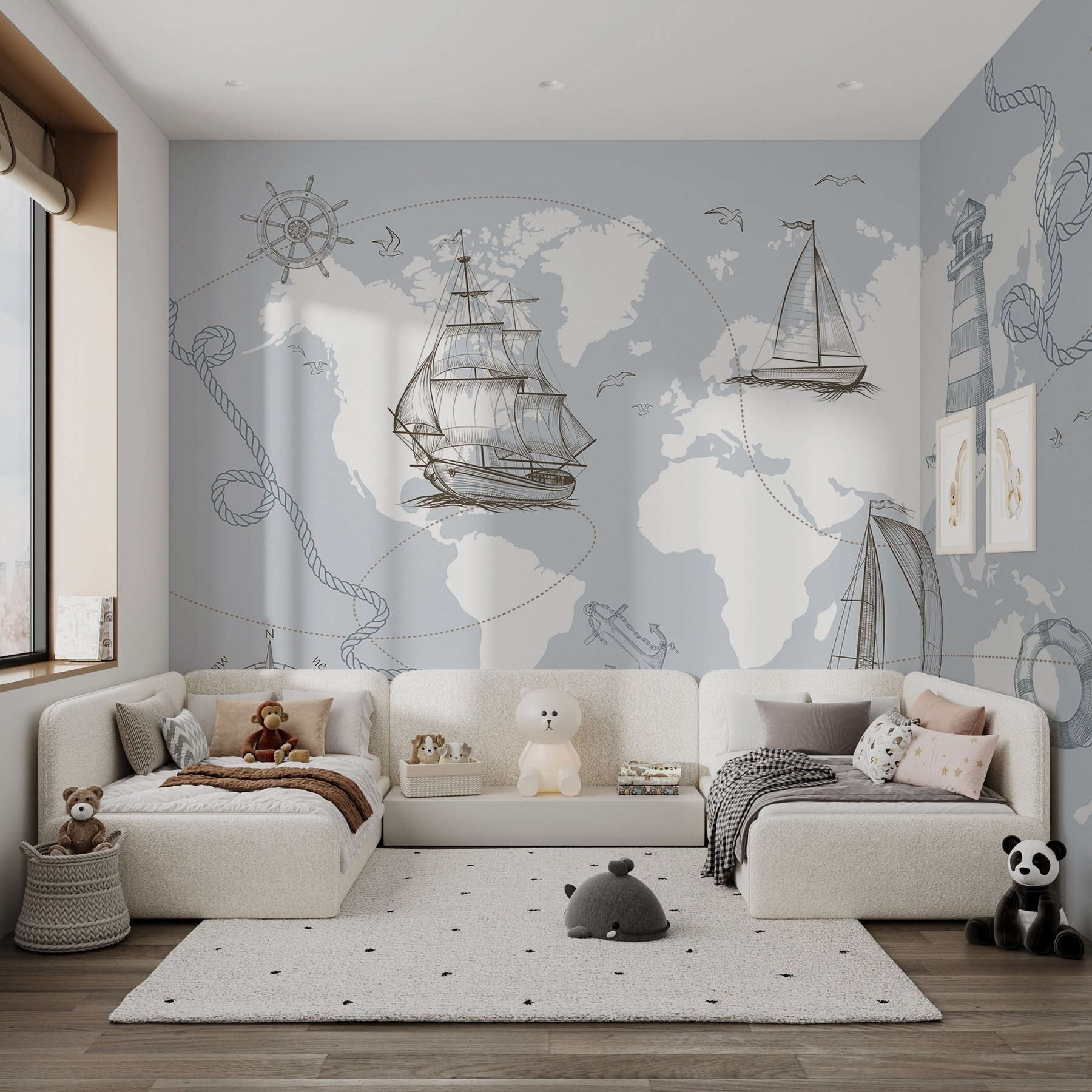 Verwandeln Sie jeden Raum in eine nautische Welt mit dieser charmanten Fototapete, die eine Weltkarte mit skurrilen Schiffen und einem Leuchtturm zeigt. Stellen Sie sich die Geschichten vor, die diese Schiffe auf den endlosen Meeren erzählen könnten. Perfekt, um eine gemütliche Ecke zu schaffen, in der Sie von Abenteuern träumen oder einfach mit einem Buch entspannen können. Die subtilen Designs fügen sich mühelos in verschiedene Räume ein und verleihen ihnen Tiefe und Faszination. Ihre Freunde werden sich über diesen einzigartigen Touch wundern, und wer weiß, vielleicht inspiriert er sogar den einen oder anderen spontanen Reiseplan! Verankern Sie also diese skurrilen Vibes direkt in Ihrem Zuhause.