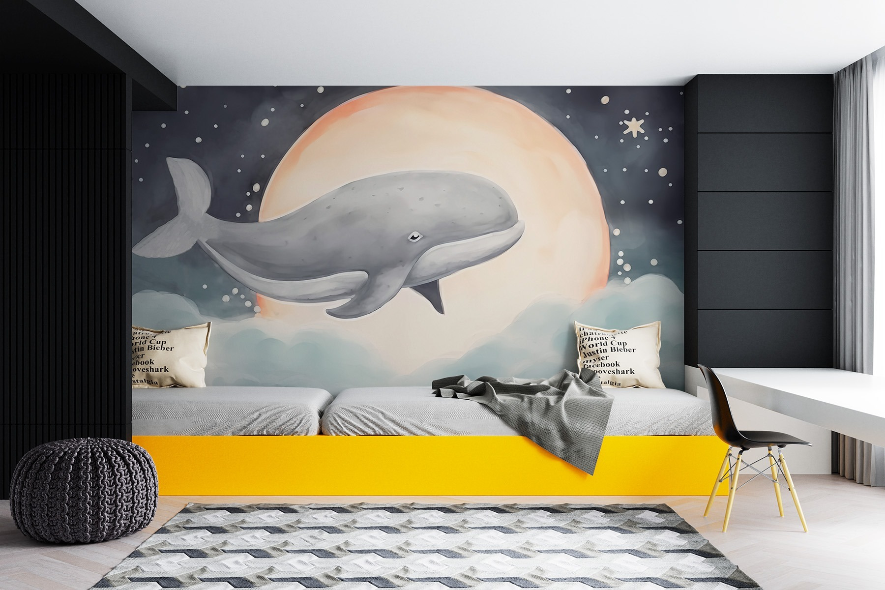 Lernen Sie das Wandbild “Whale in the Sky” kennen, wo die Magie des Ozeans auf verträumte Wolken trifft. Stellen Sie sich diesen majestätischen Wal vor, wie er gemächlich durch eine sternenklare Nacht gleitet und eine heitere Stimmung in jeden Raum zaubert. Es ist, als würde man sich ein Stück Ozean nach Hause holen – natürlich ohne das Salzwasser. Sie eignet sich perfekt für ein Küstenthema oder sogar ein skurriles Kinderzimmer und weckt Neugierde und Staunen. Stellen Sie sich gemütliche Abende vor, an denen Sie diesen sanften Riesen betrachten – wer würde sich da nicht ein bisschen entspannter fühlen? Mit seinen sanften Aquarelltönen und seiner einladenden Atmosphäre macht dieses Wandbild jede Wand zu einem Gesprächsanlass. Tauchen Sie ein in ein Dekor, das sich wie eine Umarmung vom Meer anfühlt!