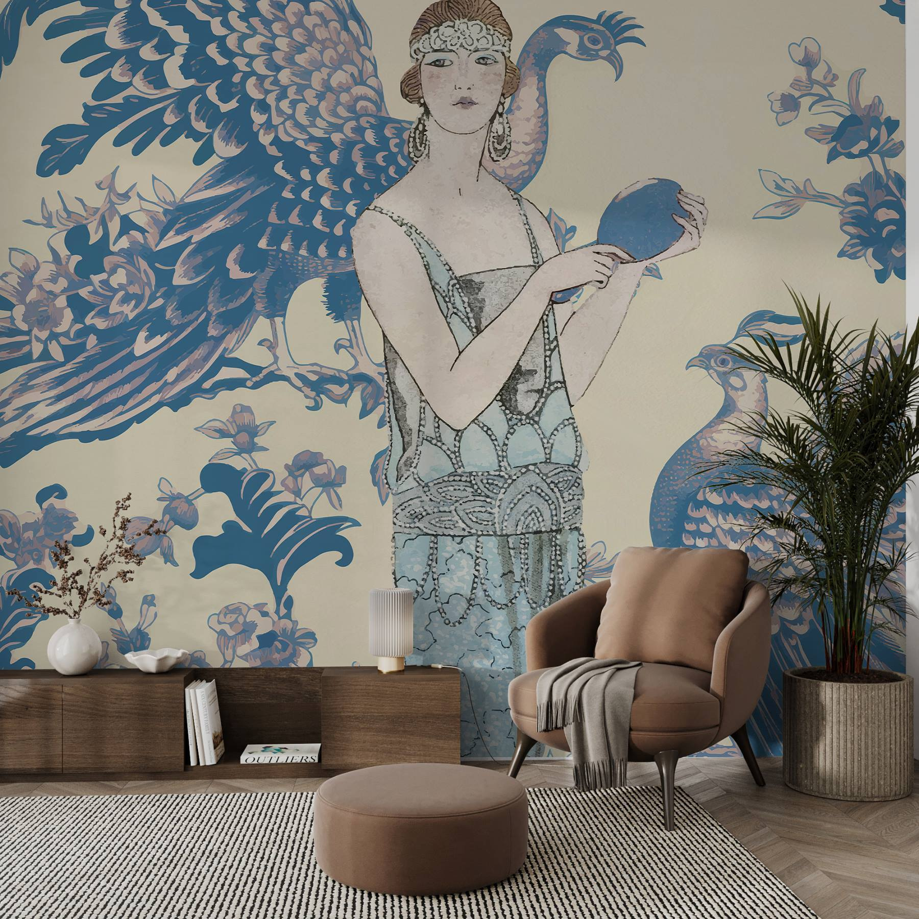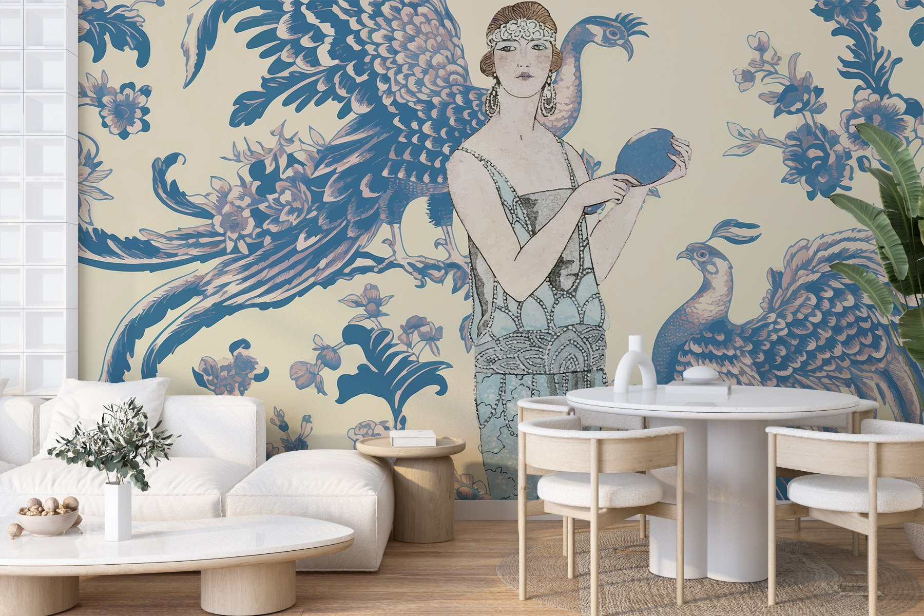 Verschönern Sie Ihren Raum mit diesem atemberaubenden Wandbild, das eine anmutige Frau zeigt, die ein rundes blaues Objekt hält, umgeben von skurrilen Pfauen und zarten Blumen. Es ist, als hätten Sie ein Stück verträumter Kunst direkt an Ihrer Wand! Stellen Sie sich vor, Sie wachen jeden Tag mit diesem farbenfrohen und eleganten Anblick auf – perfekt, um eine heitere Stimmung zu erzeugen. Ob in einer gemütlichen Sitzecke oder einem schicken Wohnzimmer, dieses Wandbild lädt Sie in eine Welt der Schönheit ein. Die Gäste werden nicht widerstehen können, es zu bewundern, und vielleicht regt es ein spontanes Gespräch über Kunst, Reisen oder die schwer fassbaren Pfauen an – denn wer liebt nicht ein bisschen Glamour?