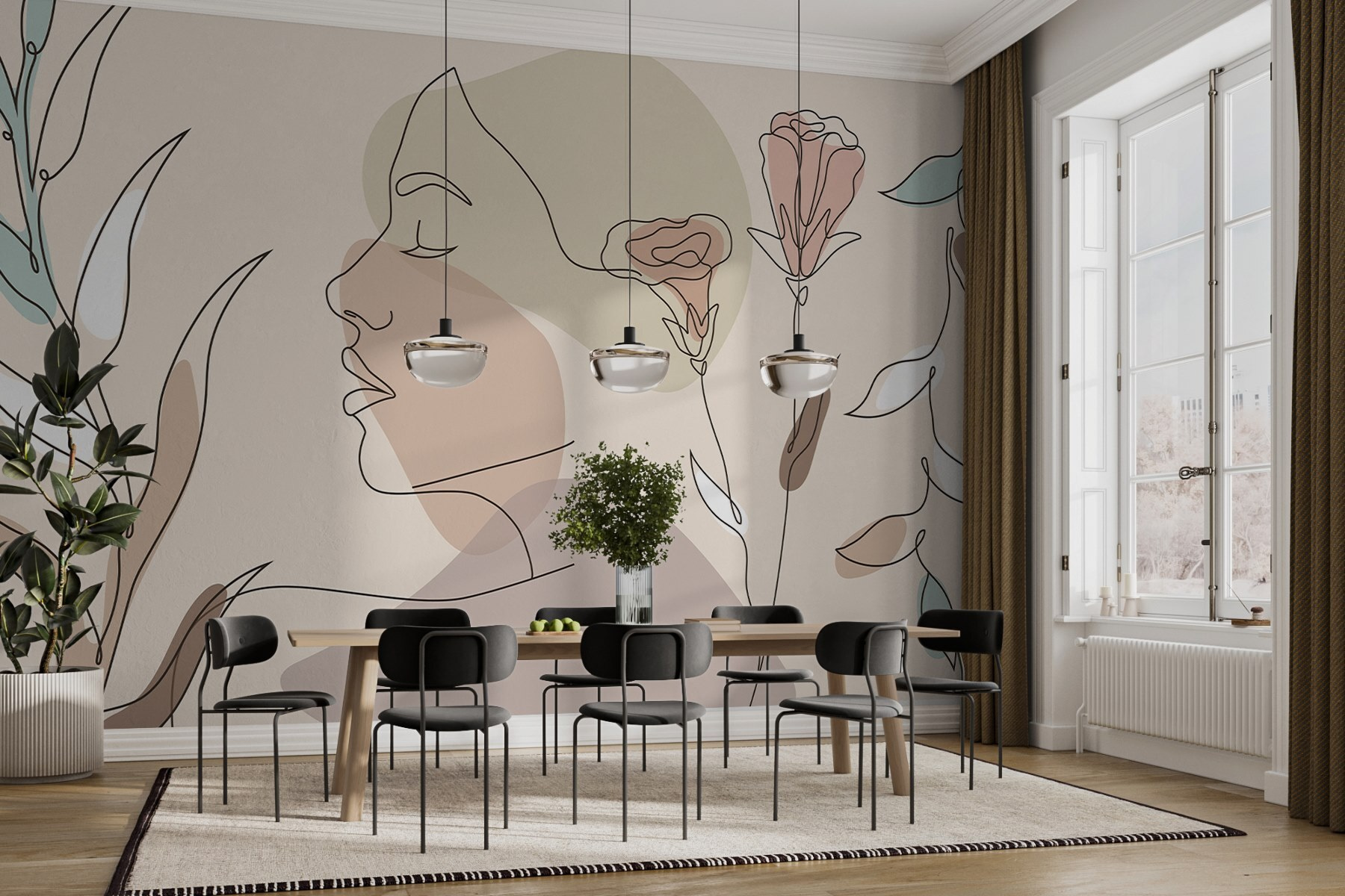 Verwandeln Sie Ihren Raum mit dieser bezaubernden Fototapete, die das ruhige Gesicht einer Frau zeigt, das mit zarten Blumen geschmückt ist. Es ist wie ein Kunstwerk, das jedem Raum Leben einhaucht. Stellen Sie sich vor: Sie kommen herein und plötzlich ist es ein bisschen so, als würden Sie einen friedlichen Garten betreten, in dem Schönheit auf Ruhe trifft. Die weichen Aquarellstriche verströmen Eleganz, während die skurrilen Linien für spielerische Bewegung sorgen. Ob im Wohnzimmer oder in einer gemütlichen Ecke, dieses Wandbild sorgt für Freude und Unterhaltung. Perfekt für alle, die sich nach einem Hauch von Natur in ihren vier Wänden sehnen – es ist, als ob man sich die Natur ins Haus holt, ohne die ganzen Pollen! Geben Sie Ihren Wänden eine neue Stimme und lassen Sie sie eine Geschichte von Gelassenheit und Anmut erzählen.