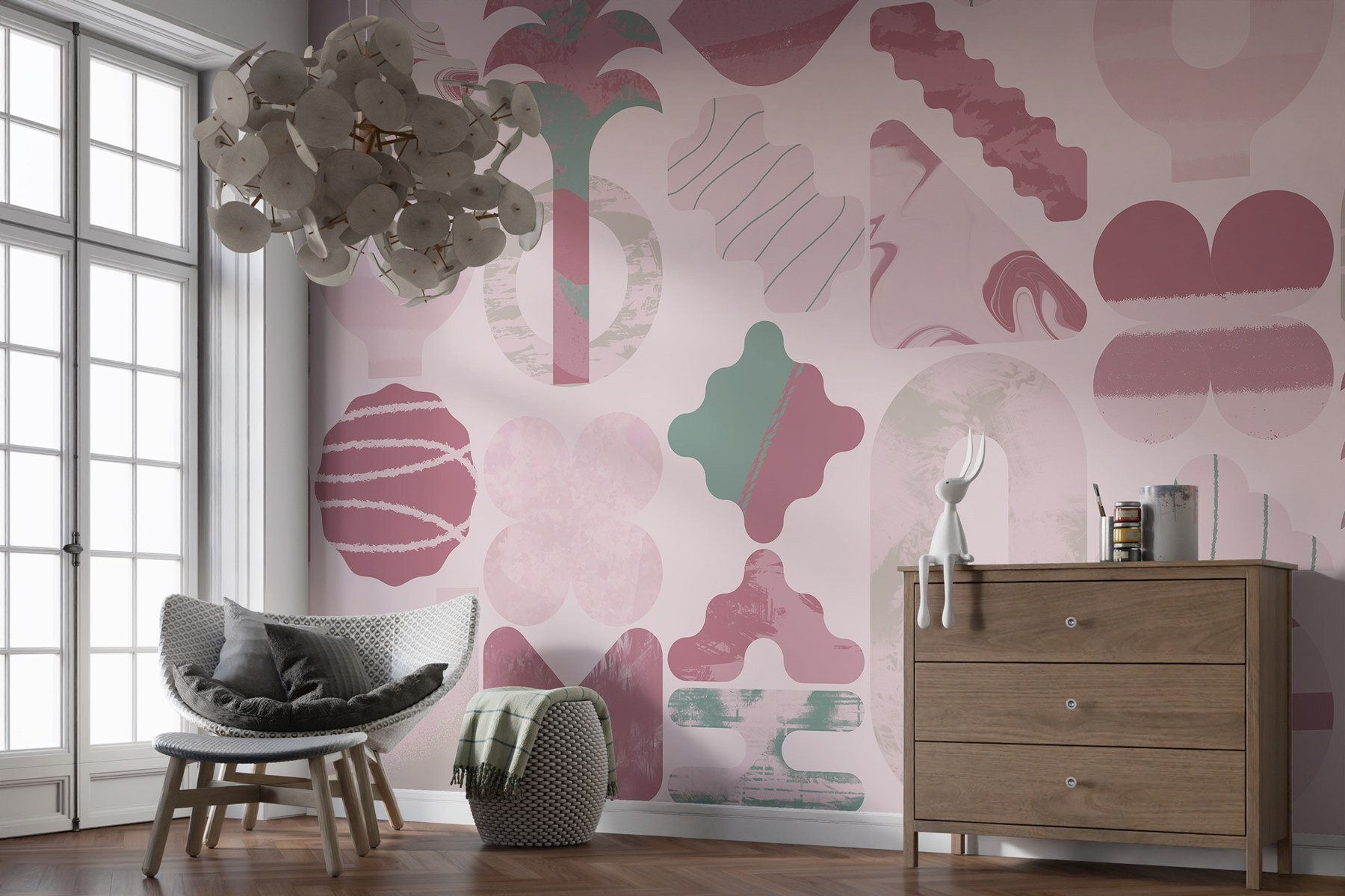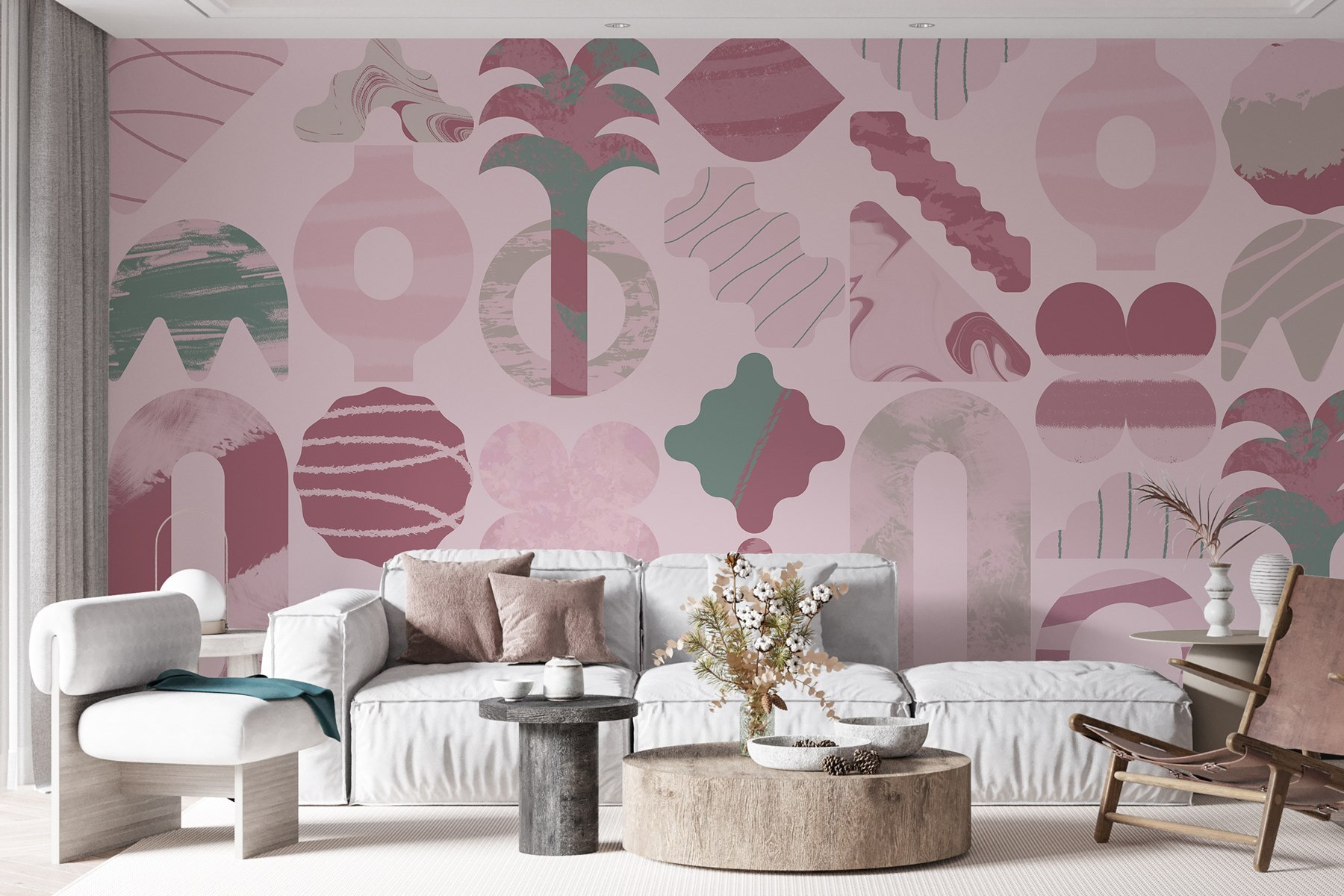 Fototapeten Rosa und grüner Hintergrund mit verschiedenen Formen (Artikelnummer: w02550)