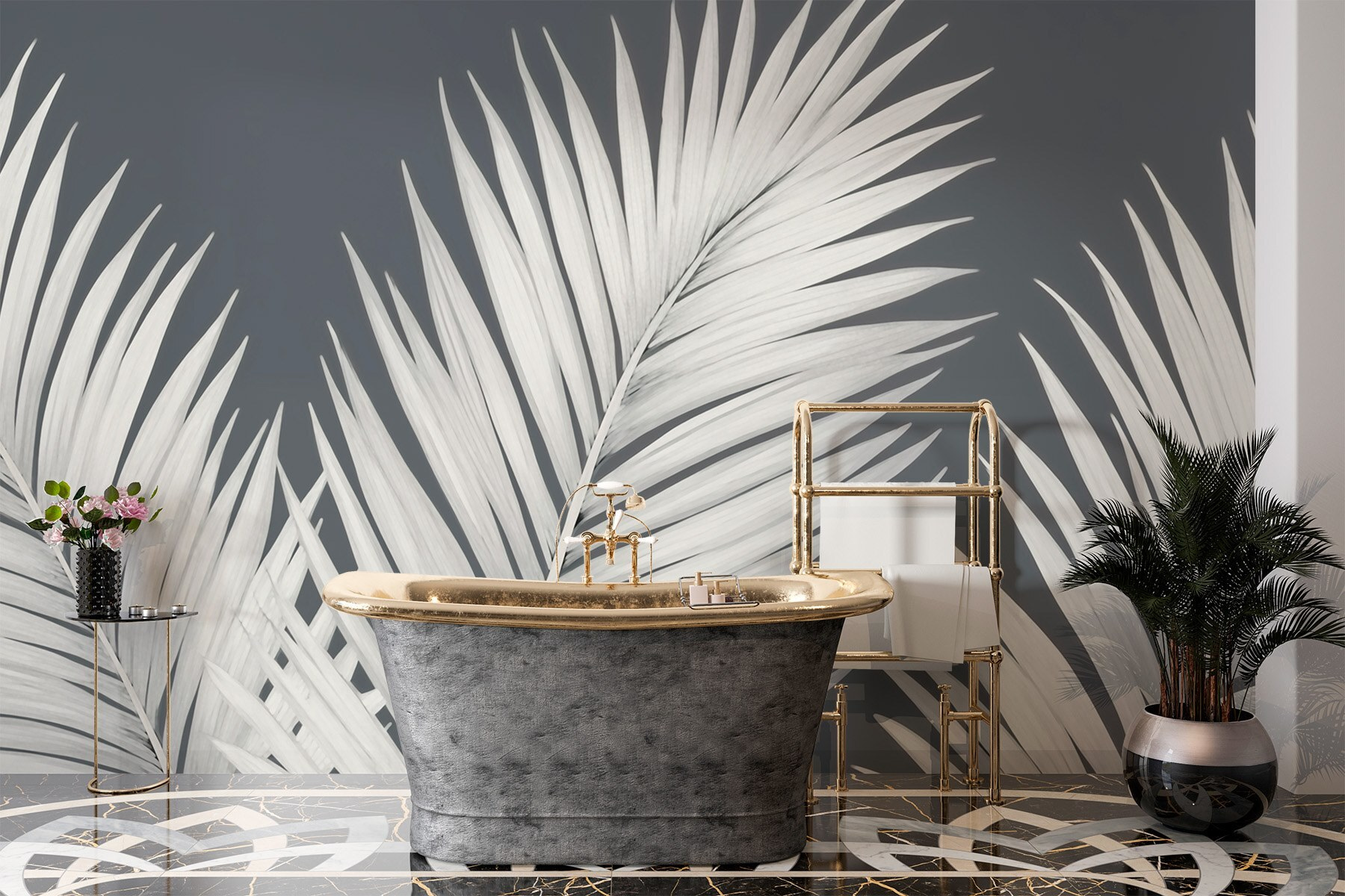 Fototapeten Elegante Palmenblätter vor einem grauen Hintergrund Fototapeten Elegante Palmenblätter vor einem grauen Hintergrund