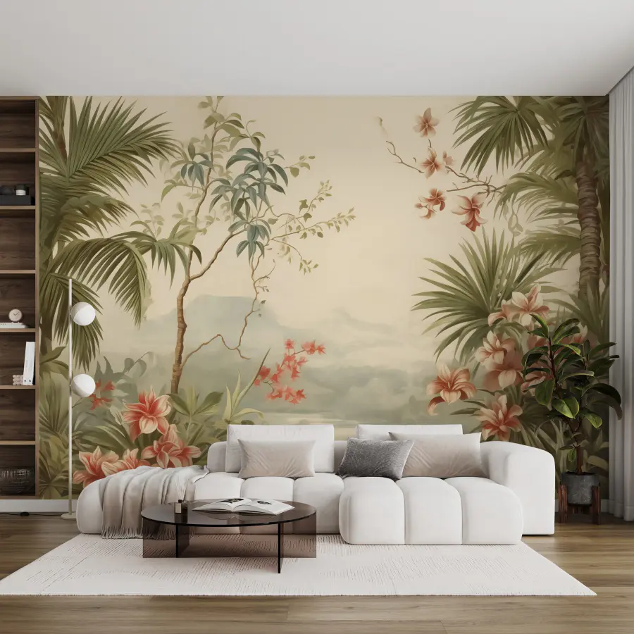 Verwandeln Sie Ihren Raum in eine heitere Oase mit dieser atemberaubenden Fototapete, die üppige Blumen und tropische Bäume zeigt. Stellen Sie sich vor, Sie betreten einen ruhigen Dschungel, in dem sich jeder Blick wie ein Mini-Urlaub anfühlt. Die sanften Grüntöne und die gedämpften Blumen schaffen eine beruhigende Atmosphäre, die zum Entspannen einlädt. Diese Fototapete eignet sich perfekt für eine gemütliche Leseecke oder ein lebhaftes Wohnzimmer und holt die Natur ins Haus. Stellen Sie sich vor, wie Sie an einem Tee nippen, umgeben von einer Flora, die sogar Ihre Zimmerpflanzensammlung ein wenig neidisch machen könnte. Bringen Sie Stimmung und Frische an jede Wand; es ist wie ein Hauch von frischer Luft, nur ohne die Käfer!