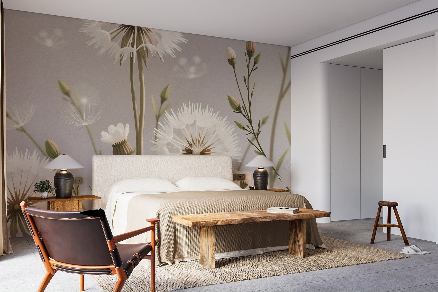 Verwandeln Sie Ihren Raum mit der Fototapete “Delicate Blooms in Soft Palette”. Dieses wunderschöne Design bringt einen Hauch von Natur ins Haus, mit lieblichen Pusteblumen und zarten Blüten. Stellen Sie sich vor, Sie wachen auf und werden von diesem beruhigenden Kunstwerk begrüßt – es ist wie ein sanftes Flüstern aus dem Garten!