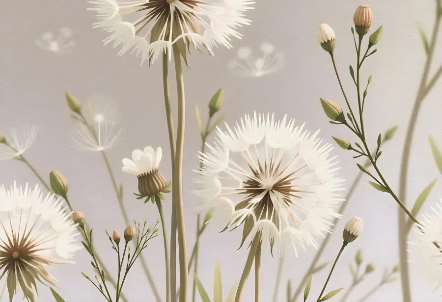 Verwandeln Sie Ihren Raum mit der Fototapete “Delicate Blooms in Soft Palette”. Dieses wunderschöne Design bringt einen Hauch von Natur ins Haus, mit lieblichen Pusteblumen und zarten Blüten. Stellen Sie sich vor, Sie wachen auf und werden von diesem beruhigenden Kunstwerk begrüßt – es ist wie ein sanftes Flüstern aus dem Garten!