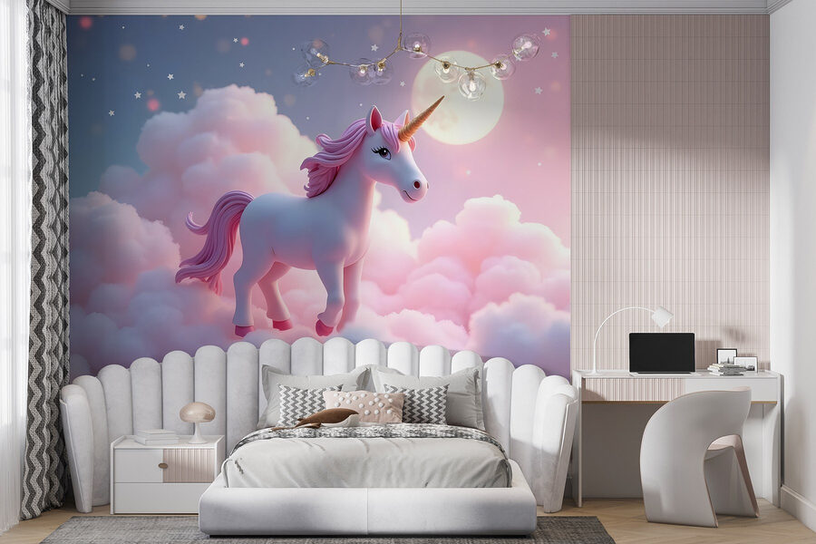 Verwandeln Sie jeden Raum in ein skurriles Wunderland mit dieser bezaubernden Fototapete, auf der ein Einhorn auf flauschigen Wolken tänzelt. Stellen Sie sich den Zauber vor, den es ausstrahlt und Ihrem Raum einen Hauch von verträumtem Charme verleiht. Es eignet sich perfekt für ein Kinderzimmer oder sogar einen verspielten Rückzugsort für Erwachsene, da es zu Tagträumen anregt und die Fantasie beflügelt.