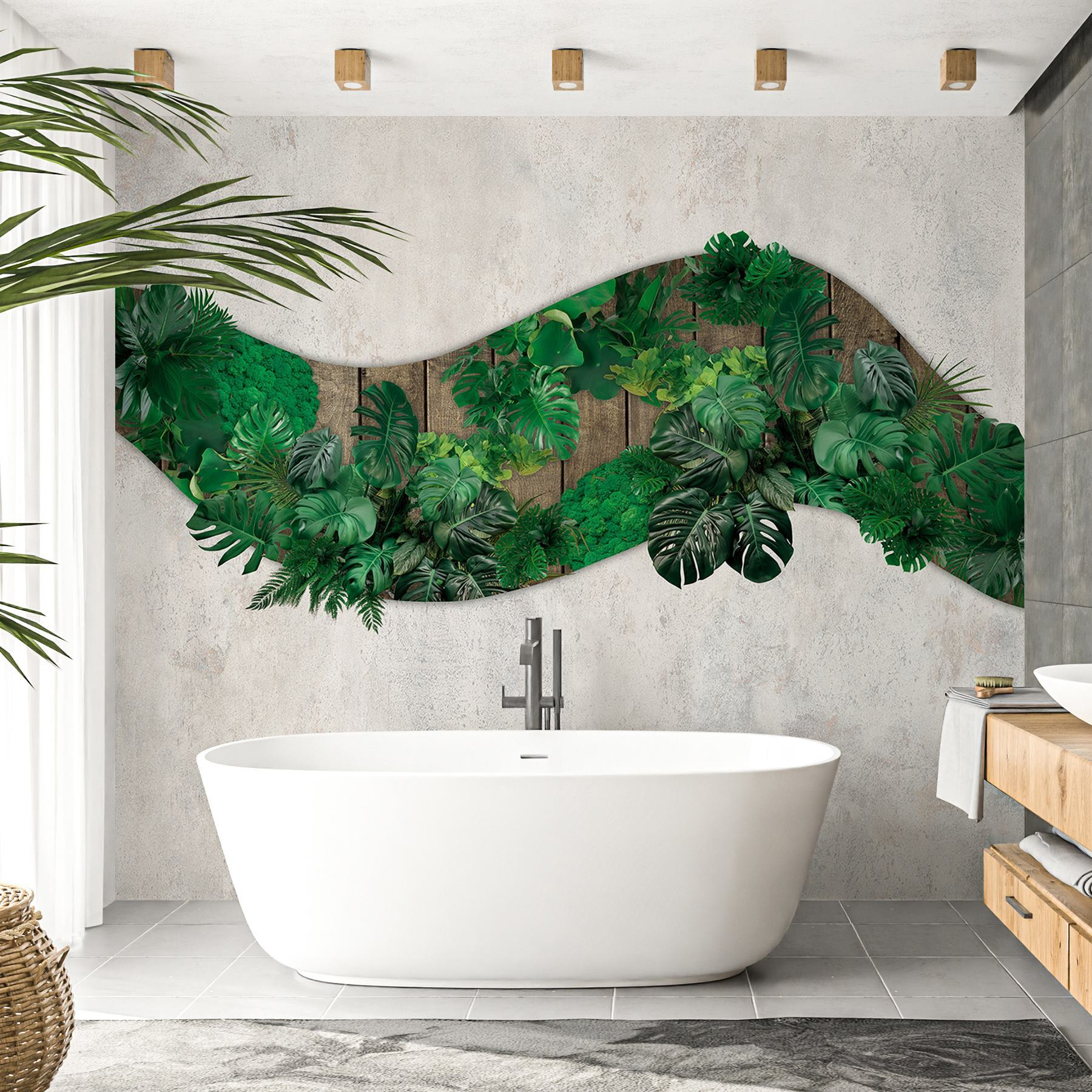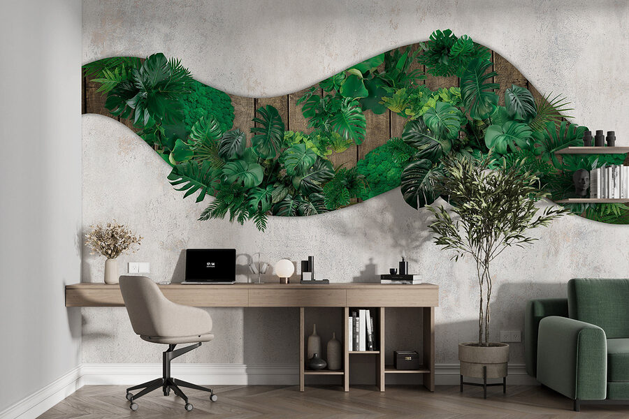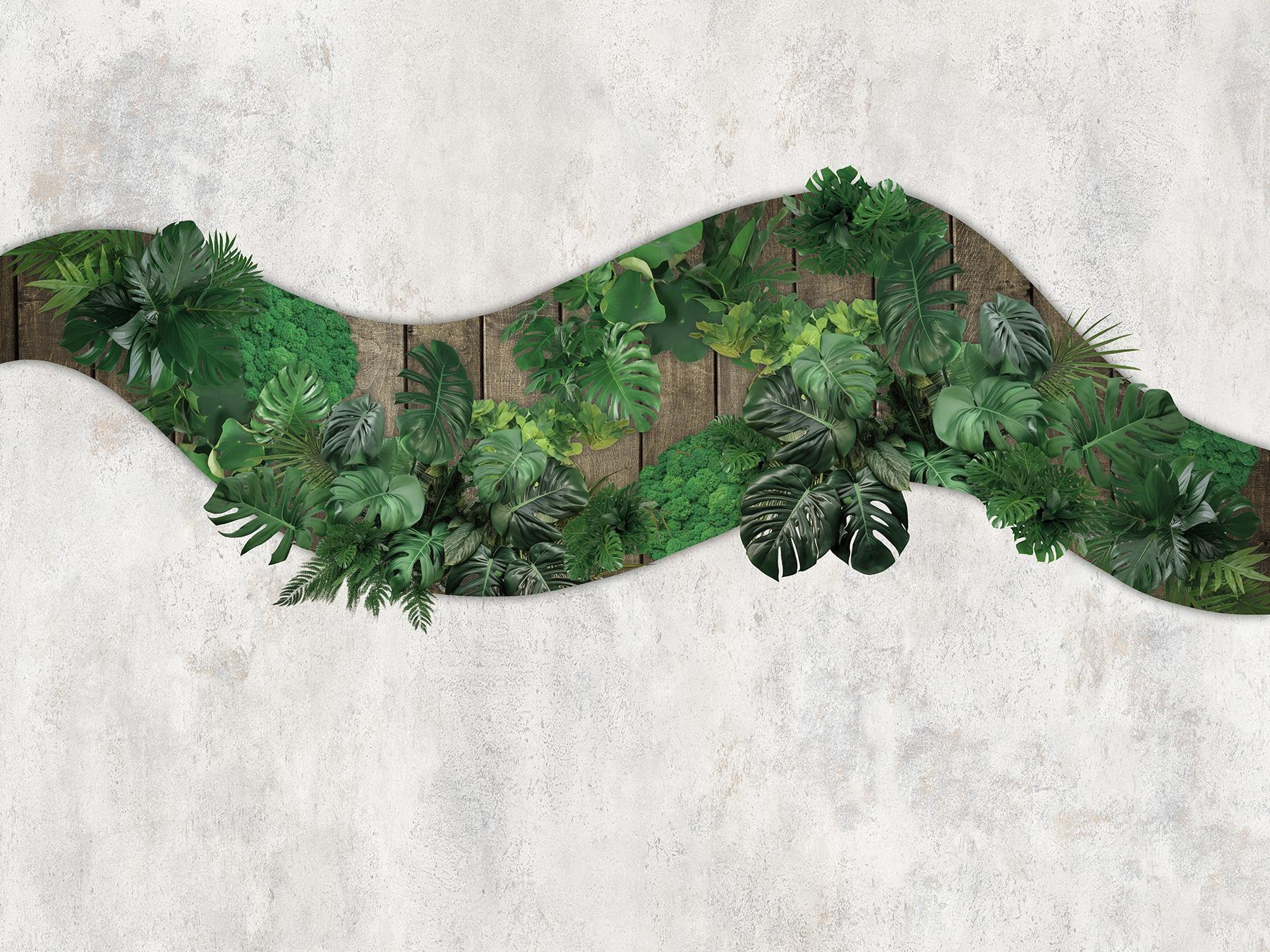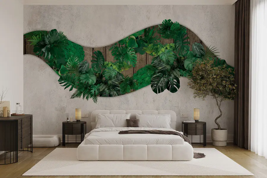 Mit dieser atemberaubenden Fototapete mit grünen Blättern, die sich über eine Holzoberfläche ergießen, verwandeln Sie jeden Raum. Stellen Sie sich vor, Sie würden direkt von Ihrem Wohnraum aus in einen lebendigen Dschungel eintreten – jedes blattförmige Detail sorgt für eine frische, tropische Atmosphäre, der man nur schwer widerstehen kann. Es fühlt sich an, als hätte sich die Natur selbst ins Haus geholt und die Wände mit einem Hauch von Leben erfüllt. Stellen Sie sich vor, Sie machen es sich auf einer gemütlichen Couch bequem, das Sonnenlicht strömt herein, und dieses wunderschöne Wandbild bildet den Hintergrund. Ein echter Stimmungsaufheller! Ob für das Arbeitszimmer oder die Chill-Out-Zone, dieses Wandbild ist die perfekte Wahl für alle, die ein bisschen Spaß und Flair suchen. Und wer würde sich nicht über einen Hauch von Natur freuen, nur ohne Ungeziefer?