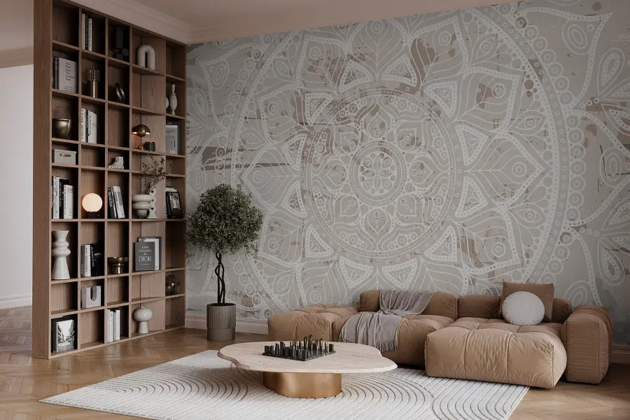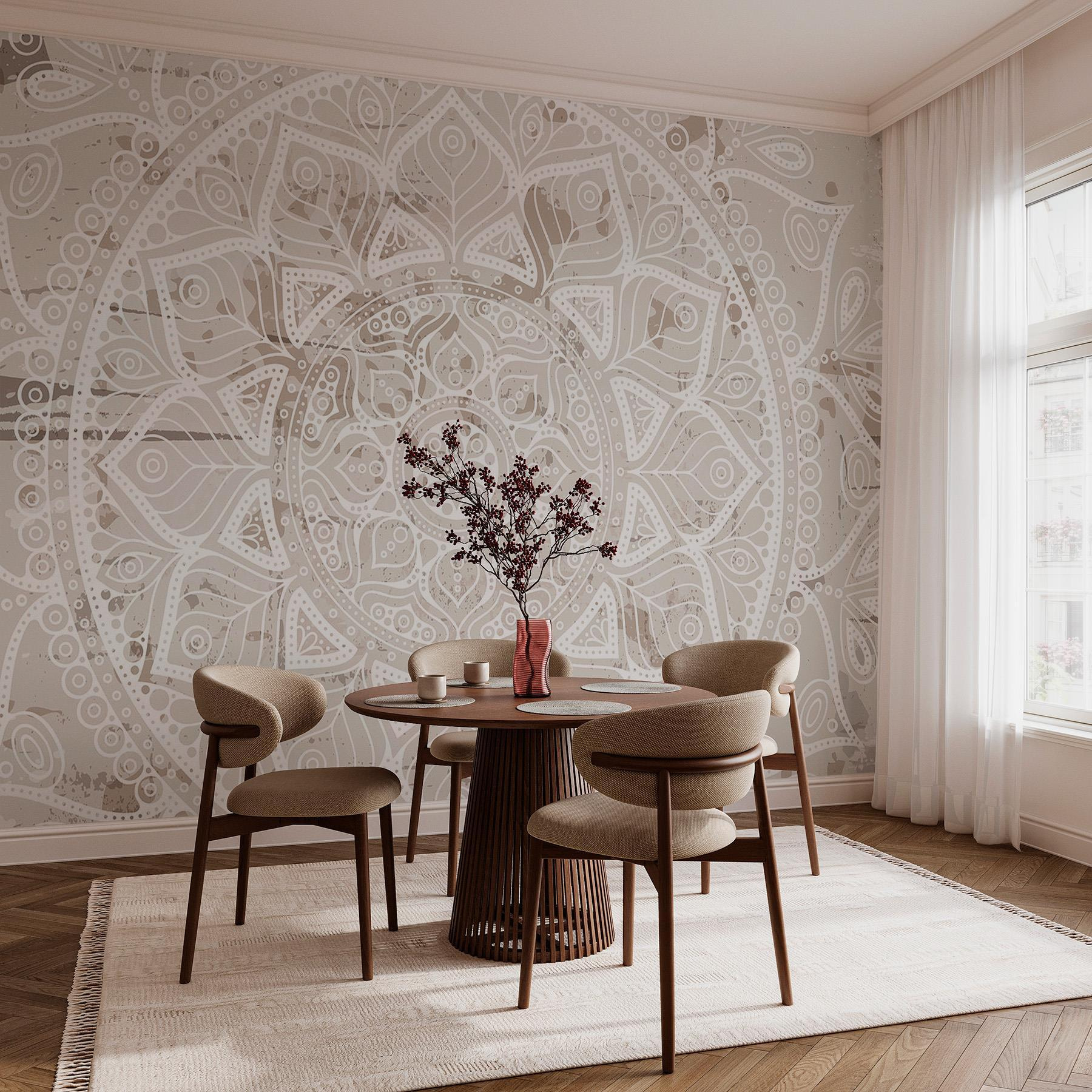 Verwandeln Sie jeden Raum mit dieser atemberaubenden Fototapete “Weißes Mandala auf brauner Oberfläche”. Es ist, als würde man sich ein Kunstwerk aus einem gemütlichen Café nach Hause holen. Die verschlungenen weißen Muster vor dem warmen, erdigen Hintergrund bilden einen auffallenden Kontrast – stellen Sie sich vor, Sie trinken Tee und genießen die Atmosphäre. Im Ernst, es lädt zur Ruhe ein, wie eine sanfte Umarmung.