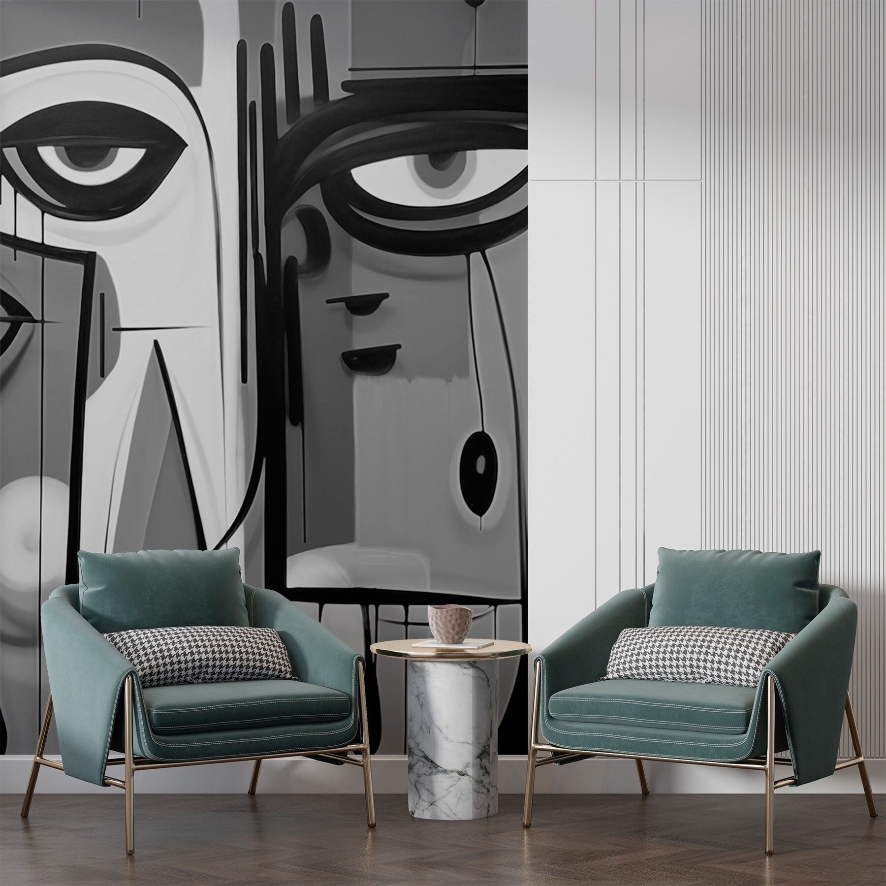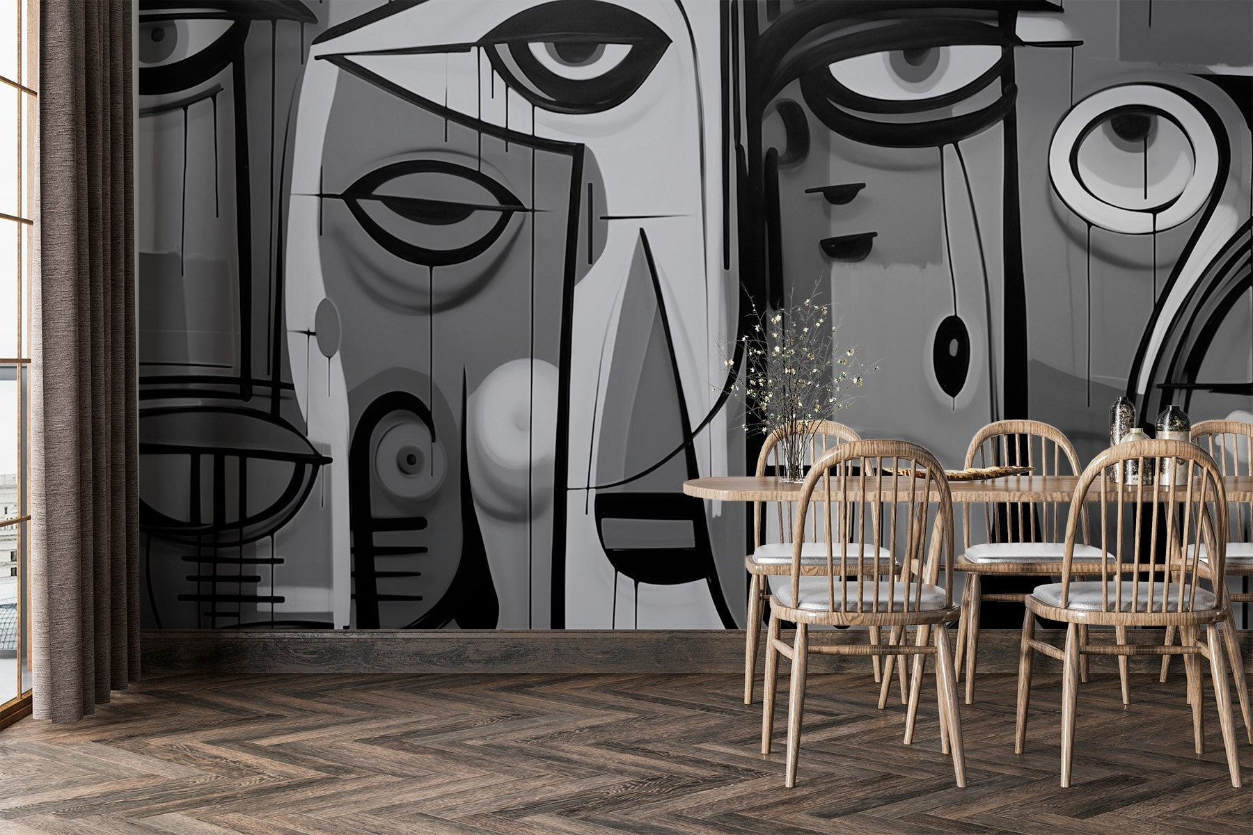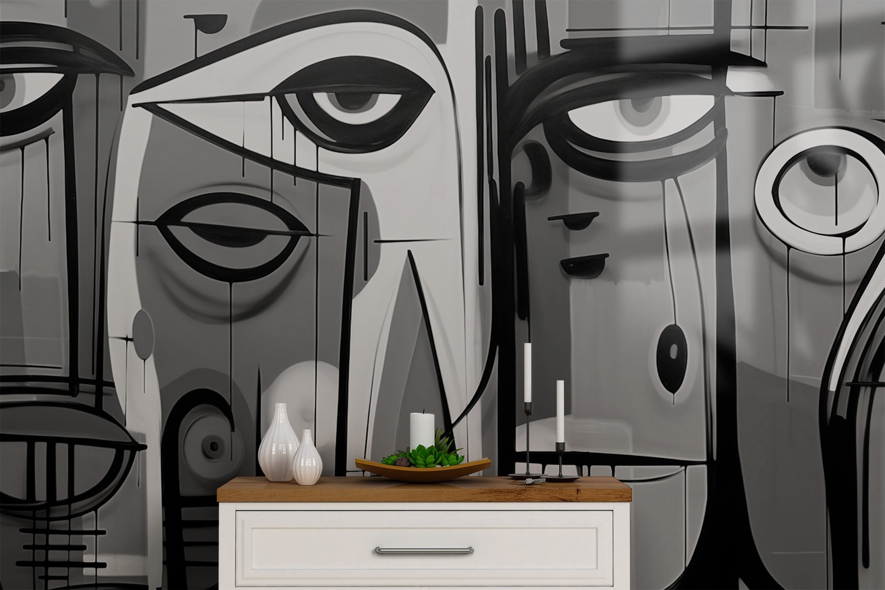 Verwandeln Sie Ihren Raum mit dieser auffälligen schwarz-weißen Fototapete, auf der fesselnde Gesichter zu sehen sind, die in Ihre Welt zu blicken scheinen. Es ist, als würde man sich mit der Kunst unterhalten – voller Emotionen und Faszination. Stellen Sie sich vor: Sie betreten Ihr Zimmer, und schon ziehen Sie diese ausdrucksstarken Gesichter in ihren Bann, die Neugierde wecken und vielleicht sogar ein Lächeln hervorrufen. Sie eignen sich perfekt für ein Wohnzimmer oder eine kreative Ecke und verleihen dem Raum mehr Tiefe, ohne dass all die Farben um die Aufmerksamkeit buhlen. Außerdem ist es ein fantastischer Eisbrecher für jeden, der vorbeikommt. Wer würde nicht gerne über die Geschichten hinter diesen intensiven Blicken nachdenken? Vollkommen zeitgemäß und mühelos schick!