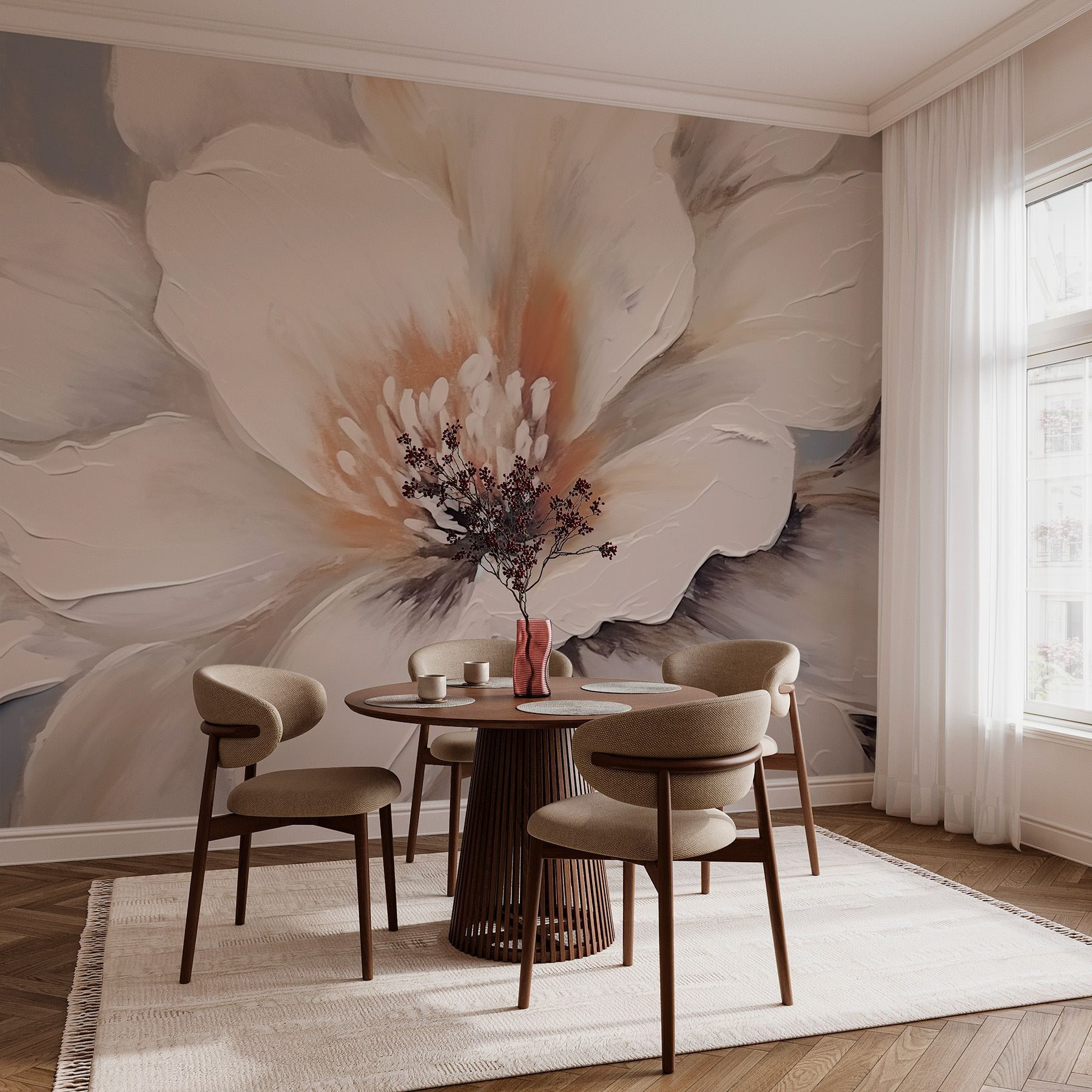 Verwandeln Sie jeden Raum in eine ruhige Oase mit dem Wandbild “Delicate Petals in Soft Hues”. Stellen Sie sich vor, Sie spazieren durch einen heiteren Garten, in dem luftige Blüten in sanften Tönen süße Geheimnisse flüstern. Diese Fototapete fängt diese verträumte Stimmung ein und bringt einen Hauch von Natur direkt in Ihren Raum. Es eignet sich perfekt für gemütliche Ecken oder geräumige Wände und verleiht ihnen eine sanfte Eleganz, die die Seele besänftigt. Stellen Sie sich vor, Sie machen es sich mit einem guten Buch gemütlich, umgeben von diesen herrlichen Pfingstrosen. Es ist, als würde ein kleines Stück Frühling das ganze Jahr über blühen – ganz ohne Gießen! Ihre Wände werden es Ihnen danken.