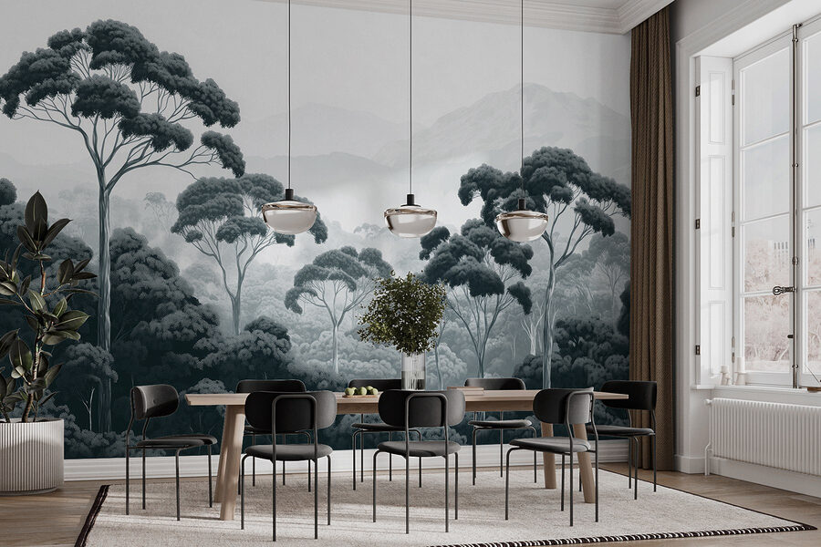 Verwandeln Sie jeden Raum in einen ruhigen Rückzugsort mit dieser atemberaubenden Fototapete, die einen Wald mit hoch aufragenden Bäumen und nebligen Bergen zeigt. Stellen Sie sich vor, Sie schlürfen Ihren Morgenkaffee, während Sie von der Natur umgeben sind – ohne lästige Moskitos, nur mit purer Stimmung! Das Kunstwerk ist in einer beruhigenden Schwarz-Weiß-Farbpalette gehalten und eignet sich perfekt für die Schaffung eines gemütlichen, besinnlichen Raums. Ob im Wohnzimmer oder im Arbeitszimmer, dieses Wandbild könnte Sie zu Tagträumen über Wanderungen in den Wäldern oder zum Einschlafen mit einem guten Buch inspirieren. Es ist, als hätte man ein Stückchen Natur direkt an der Wand. Wer hätte gedacht, dass die Natur so schick sein kann?