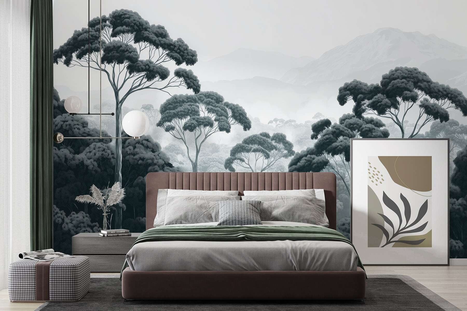 Verwandeln Sie jeden Raum in einen ruhigen Rückzugsort mit dieser atemberaubenden Fototapete, die einen Wald mit hoch aufragenden Bäumen und nebligen Bergen zeigt. Stellen Sie sich vor, Sie schlürfen Ihren Morgenkaffee, während Sie von der Natur umgeben sind – ohne lästige Moskitos, nur mit purer Stimmung! Das Kunstwerk ist in einer beruhigenden Schwarz-Weiß-Farbpalette gehalten und eignet sich perfekt für die Schaffung eines gemütlichen, besinnlichen Raums. Ob im Wohnzimmer oder im Arbeitszimmer, dieses Wandbild könnte Sie zu Tagträumen über Wanderungen in den Wäldern oder zum Einschlafen mit einem guten Buch inspirieren. Es ist, als hätte man ein Stückchen Natur direkt an der Wand. Wer hätte gedacht, dass die Natur so schick sein kann?