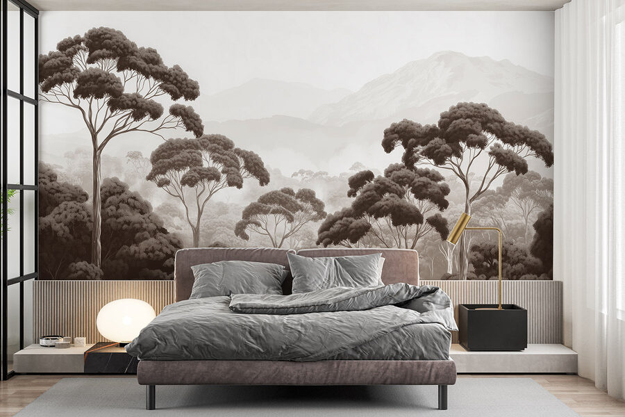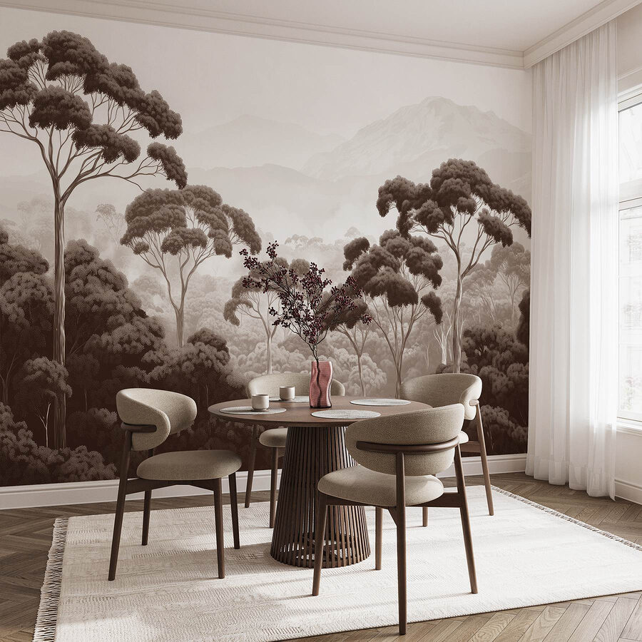 Verwandeln Sie jeden Raum in einen ruhigen Zufluchtsort mit diesem atemberaubenden Wandbild, das eine ruhige Waldszene zeigt – denken Sie an hoch aufragende Bäume und majestätische Berge im Hintergrund. Stellen Sie sich vor, Sie wachen jeden Tag mit dieser beruhigenden Aussicht auf, als ob die Natur selbst in Ihr Zuhause eingezogen wäre. Die sanften, erdigen Töne vermitteln ein Gefühl der Ruhe und eignen sich perfekt zum Faulenzen oder für ein gemütliches Ambiente während eines Netflix-Marathons. Es ist, als ob man sich ein Stückchen Natur ins Haus holt, ohne Ungeziefer und schlammige Schuhe. Lust auf ein wenig Tagträumerei? Lehnen Sie sich einfach zurück und lassen Sie Ihren Blick durch diese verträumte Landschaft schweifen. Diese Fototapete eignet sich perfekt für jeden Raum und macht jede Wand zu einem Ort, an dem man sich wie im Urlaub fühlt.