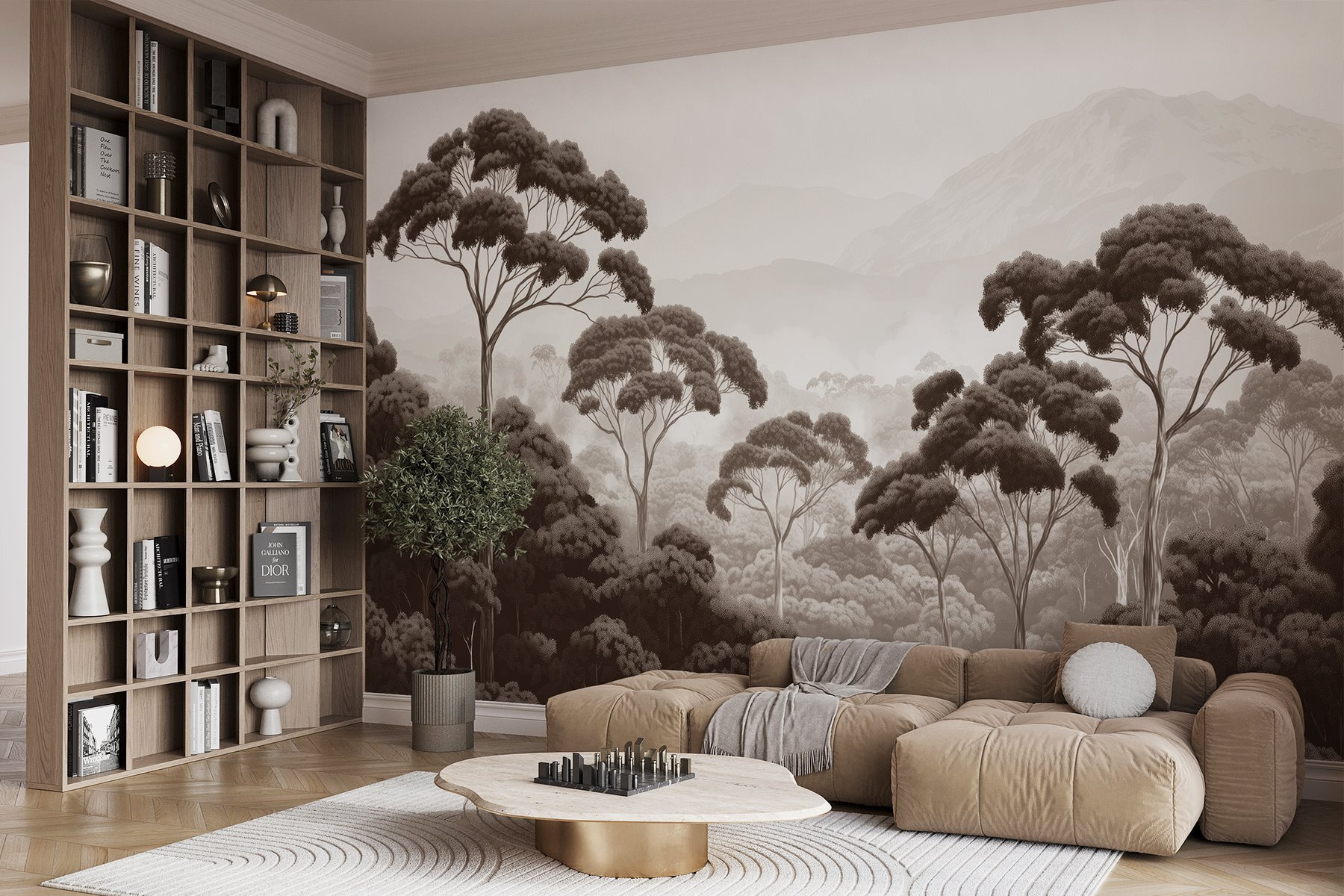 Verwandeln Sie jeden Raum in einen ruhigen Zufluchtsort mit diesem atemberaubenden Wandbild, das eine ruhige Waldszene zeigt – denken Sie an hoch aufragende Bäume und majestätische Berge im Hintergrund. Stellen Sie sich vor, Sie wachen jeden Tag mit dieser beruhigenden Aussicht auf, als ob die Natur selbst in Ihr Zuhause eingezogen wäre. Die sanften, erdigen Töne vermitteln ein Gefühl der Ruhe und eignen sich perfekt zum Faulenzen oder für ein gemütliches Ambiente während eines Netflix-Marathons. Es ist, als ob man sich ein Stückchen Natur ins Haus holt, ohne Ungeziefer und schlammige Schuhe. Lust auf ein wenig Tagträumerei? Lehnen Sie sich einfach zurück und lassen Sie Ihren Blick durch diese verträumte Landschaft schweifen. Diese Fototapete eignet sich perfekt für jeden Raum und macht jede Wand zu einem Ort, an dem man sich wie im Urlaub fühlt.