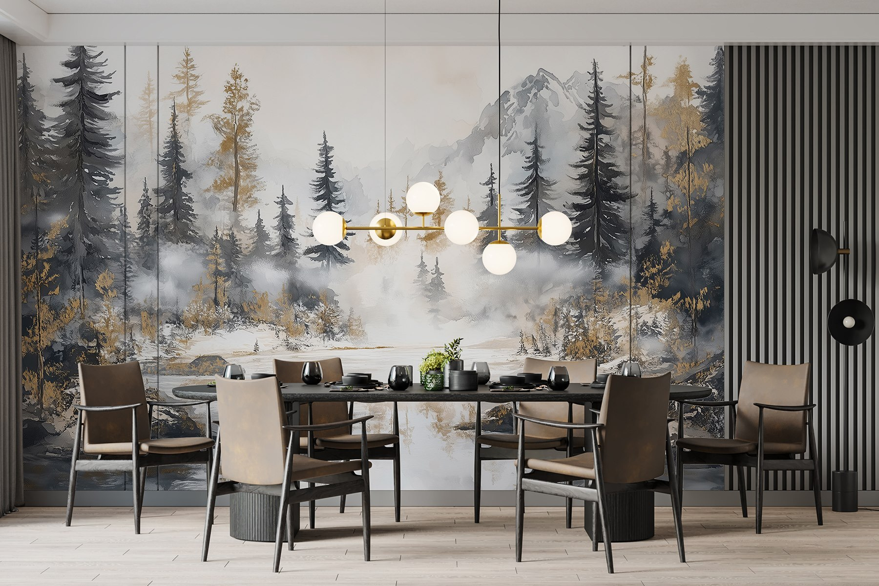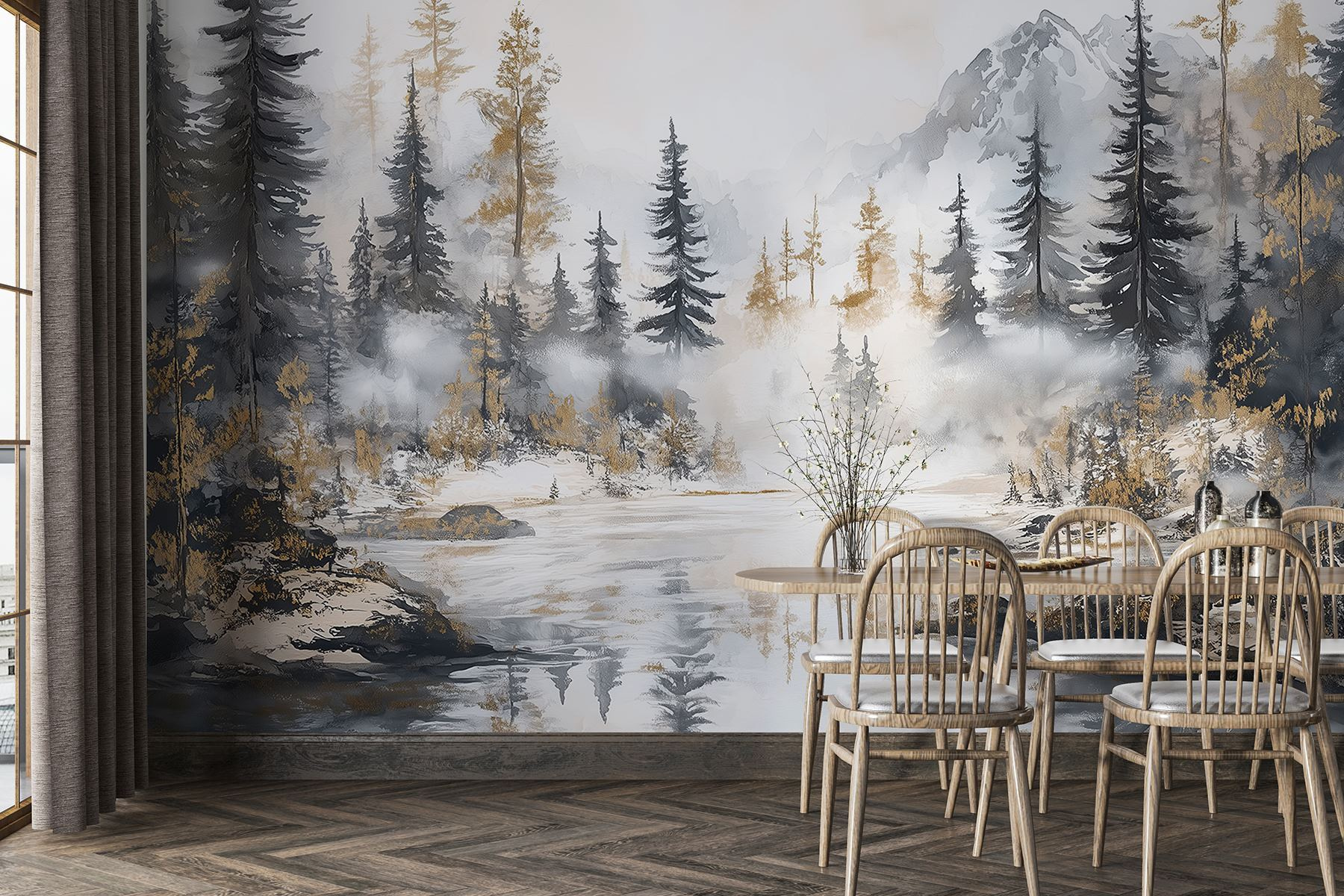 Verwandeln Sie Ihren Raum in einen ruhigen Zufluchtsort mit dieser atemberaubenden Aquarellwandmalerei eines Waldes und von Bergen. Es ist, als würde man die Ruhe der Natur ins Haus holen, ohne Mückenstiche und matschige Schuhe. Stellen Sie sich gemütliche Abende vor, die Sie am “Feuer” (oder nur mit einer flackernden Kerze) verbringen, während Sie auf die nebligen Bäume und hoch aufragenden Gipfel blicken – wer braucht schon einen Wanderschuh, wenn Sie diese Schönheit an der Wand haben? Diese Fototapete eignet sich perfekt für ein Wohnzimmer oder eine ruhige Leseecke und vermittelt Entspannung. Es ist eine kunstvolle Erinnerung daran, tief durchzuatmen und die Natur ihre Magie wirken zu lassen, direkt in Ihrem Zuhause.