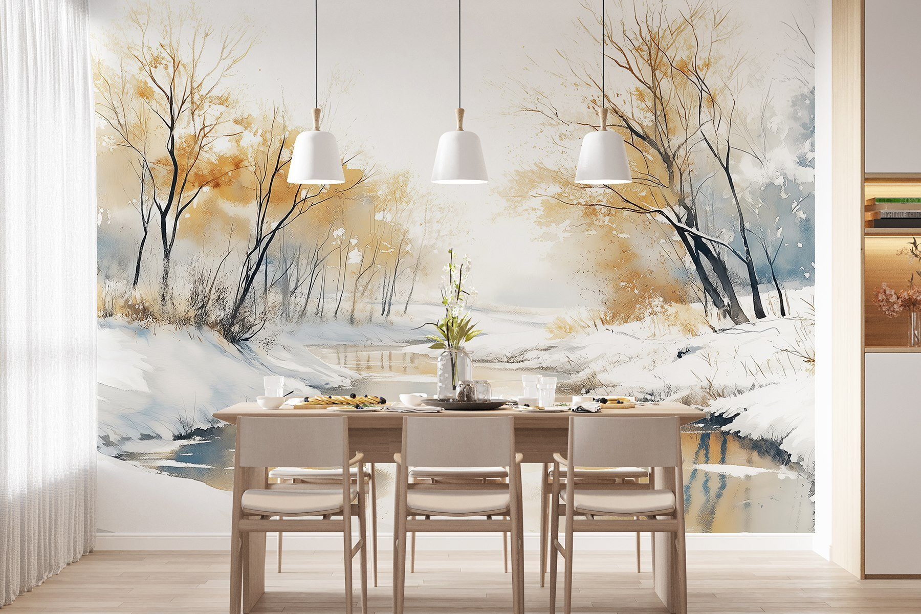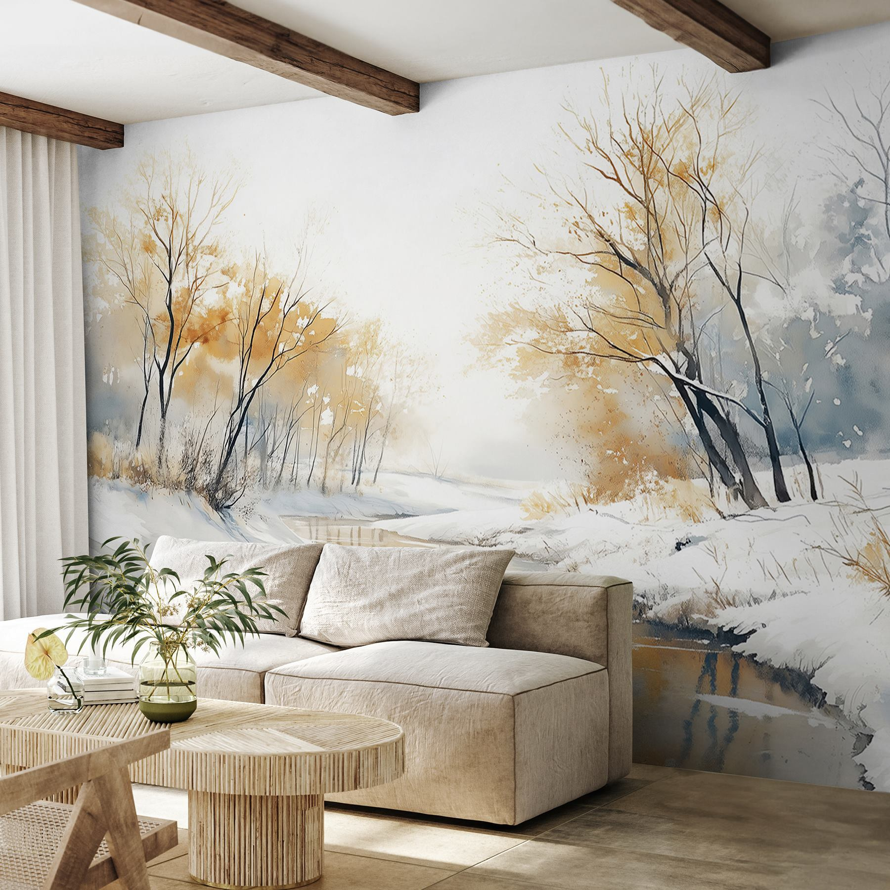 Stellen Sie sich vor, dass Sie jedes Mal, wenn Sie Ihr Zimmer betreten, in ein verschneites Wunderland eintauchen. Die Fototapete “Fototapeten River with Snow and Trees” fängt diese heitere Stimmung ein wie eine kuschelige Decke an einem kühlen Tag. Sanfte Aquarelltöne verschmelzen sanft und schaffen eine friedliche Flussszene, die von zarten Bäumen eingerahmt wird, die alle mit einer Schneeschicht bedeckt sind.