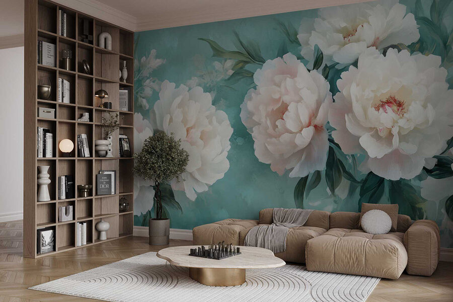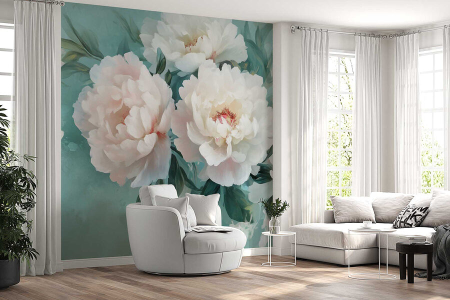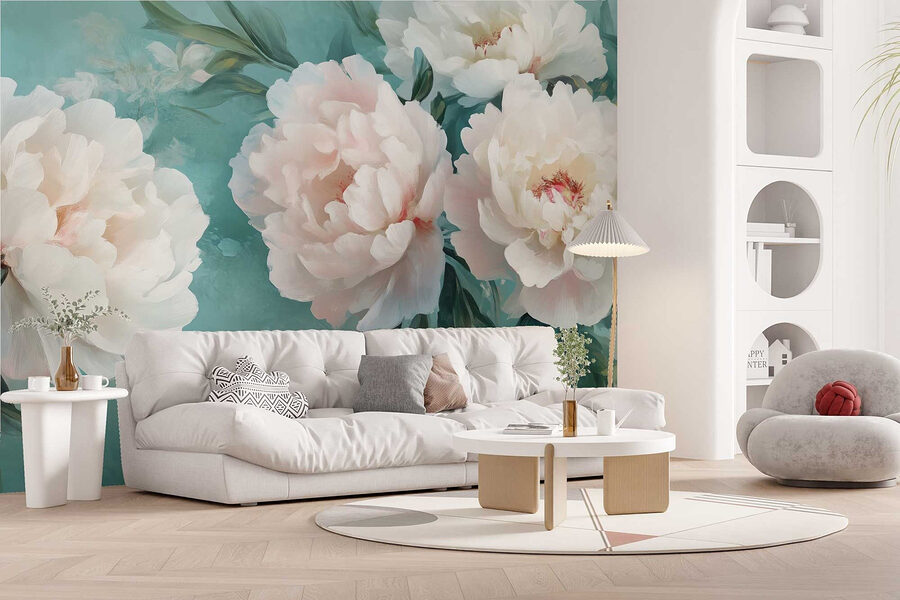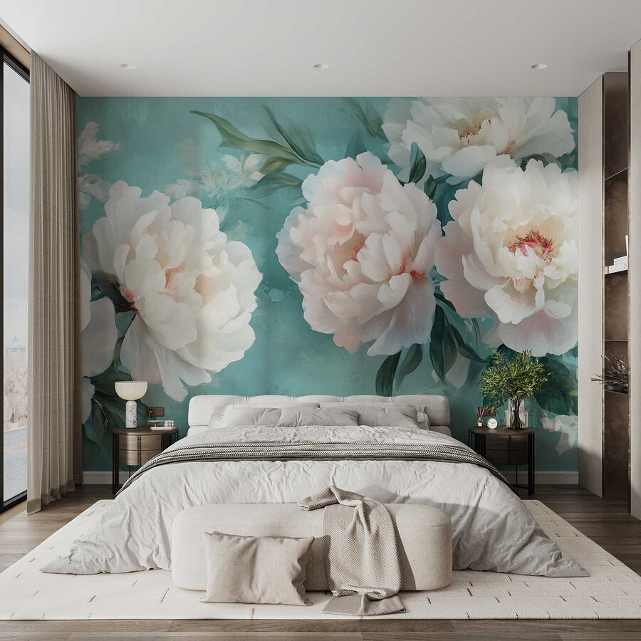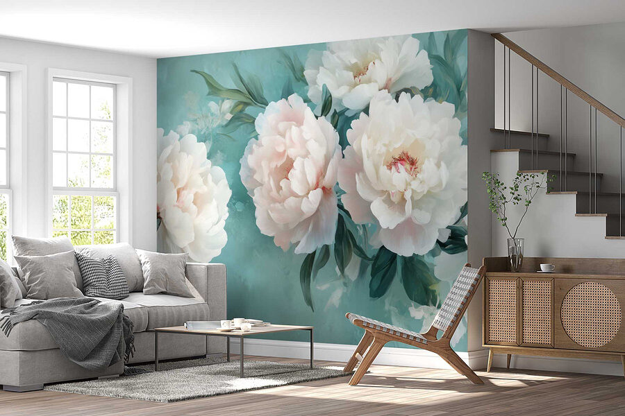 Verschönern Sie Ihre leeren Wände mit dieser atemberaubenden Fototapete mit weißen Pfingstrosen, perfekt für alle, die sich ein wenig floralen Zauber in ihrem Raum wünschen. Stellen Sie sich vor, Sie betreten einen Raum, der sich wie ein blühender Garten anfühlt – zarte Blütenblätter, die nur dazu einladen, bewundert zu werden. Die sanften Türkistöne erinnern an den Sommerhimmel und lassen selbst den regnerischsten Tag wie eine leichte Brise erscheinen. Wer würde es nicht lieben, inmitten dieser Schönheiten einen Kaffee zu trinken? Es ist, als ob man sich die Natur ins Haus holt, ohne dass man einen grünen Daumen braucht. Glauben Sie mir, diese Fototapete wird Ihnen mehr Komplimente einbringen als eine Sonnenblume auf dem Feld!