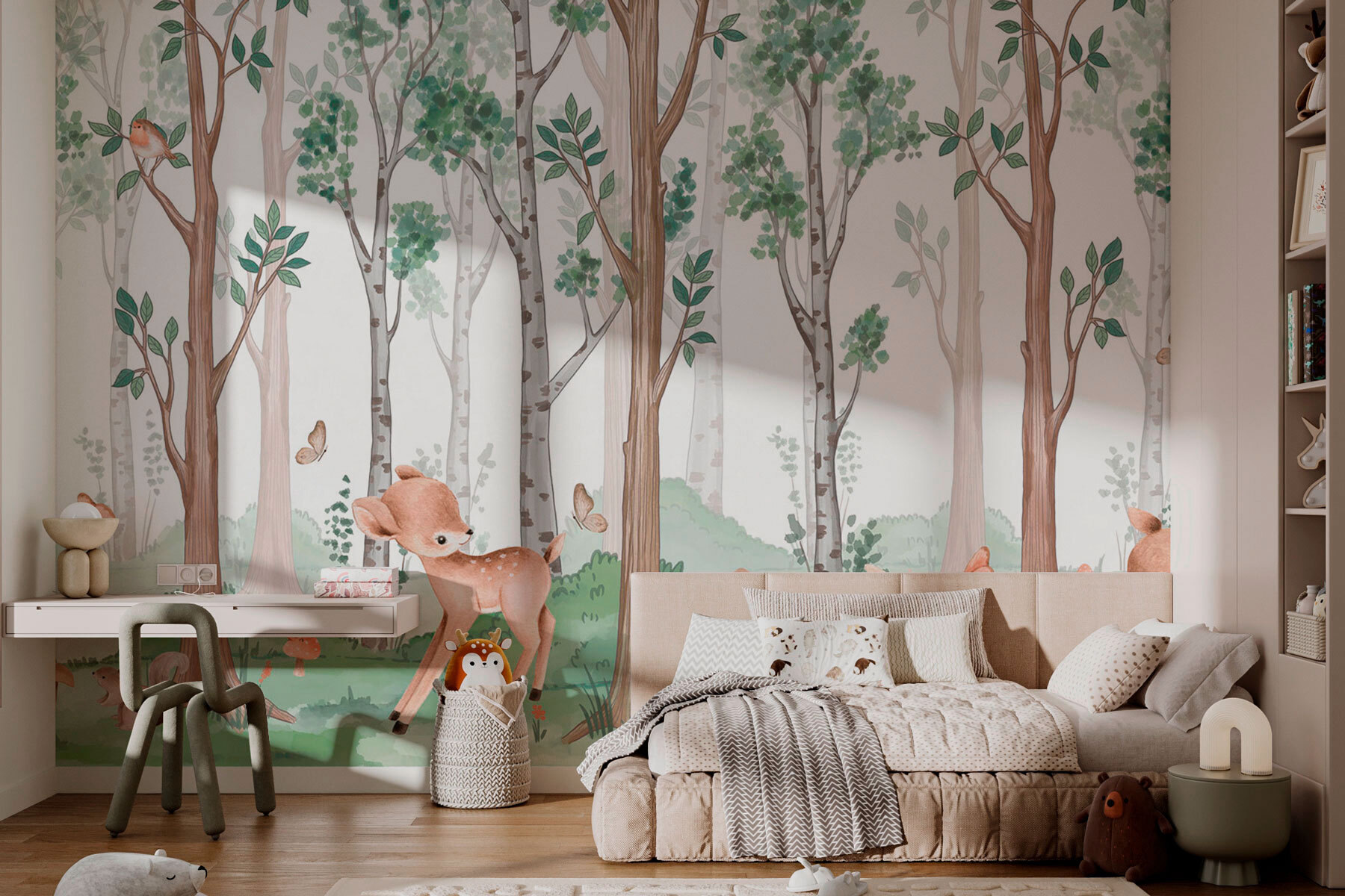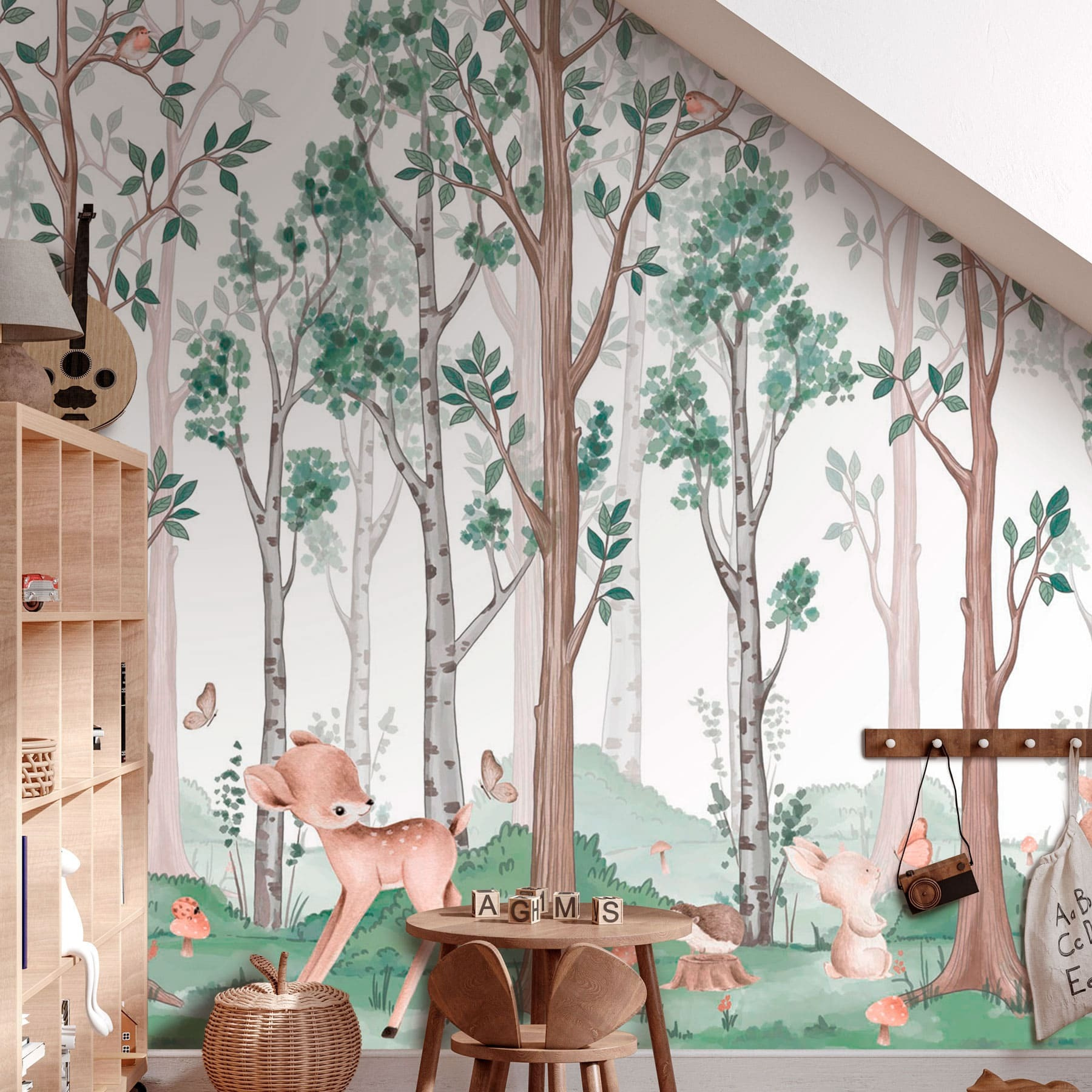 Verwandeln Sie Ihre Wände mit dieser charmanten Fototapete mit verspielten Tieren und hohen, flüsternden Bäumen in einen ruhigen Wald. Stellen Sie sich eine sanfte Brise vor, die die Blätter rascheln lässt, während neugierige Rehe und ausgelassene Hasen ihr Zuhause im Wald erkunden. Jeder Blick auf die sanften Farben dieses Wandbildes könnte Sie auf eine friedliche Lichtung entführen, wo sich alle Sorgen wie Morgennebel auflösen. Ideal für ein gemütliches Wohnzimmer oder ein skurriles Kinderzimmer, lädt es die Natur ins Haus ein und weckt Freude und Fantasie. Es ist, als hätte man ein kleines Stückchen Wald bei sich zu Hause – abgesehen von den Käfern und dem Schlamm, versteht sich! Im Ernst: Kann Dekoration noch gemütlicher sein?